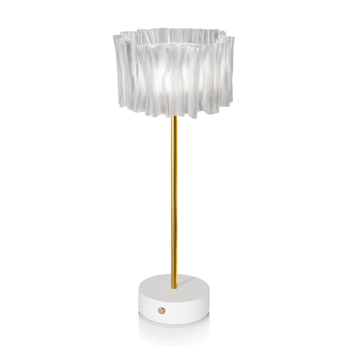 Die Accordéon LED Akku-Tischleuchte verfügt über einen handmodellierten, seidenmatten Lampenschirm, der für einen gleichmäßigen, diffus gestreuten Lichtaustritt sorgt. Ergänzt wird der Schirm durch einen weißen bzw. mattschwarzen Sockel und einen Schaft aus messingfarben eloxiertem Aluminium, der zusätzliche Stabilität bietet und die stilvolle Note der Leuchte unterstreicht.