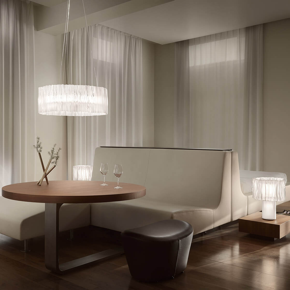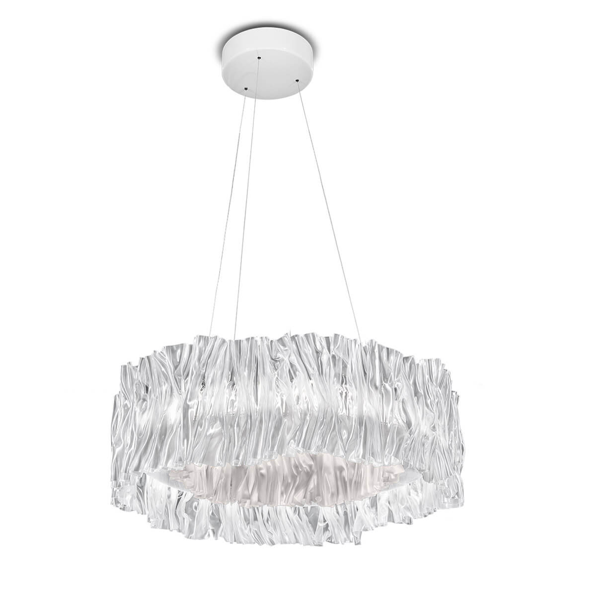 Der ringförmige Schirm aus Lentiflex®, einem hochwertigen Kunststoff mit irisierender Wirkung, erzeugt einen direkten und indirekten Lichtaustritt, der sich vor allem zur Beleuchtung von Esstischen im privaten Esszimmer sowie in Gastronomie und Hotellerie eignet. Ein inneres Lentiflex®-Band mit weißer oder goldfarben bzw. silbern metallisierter Folie verleiht der Pendellampe eine diskrete bzw. eindrucksvolle Ästhetik. Hierbei gewährleistet die gebürstete Oberfläche der metallisierten Ausführungen eine optimale Lichtdiffusion.