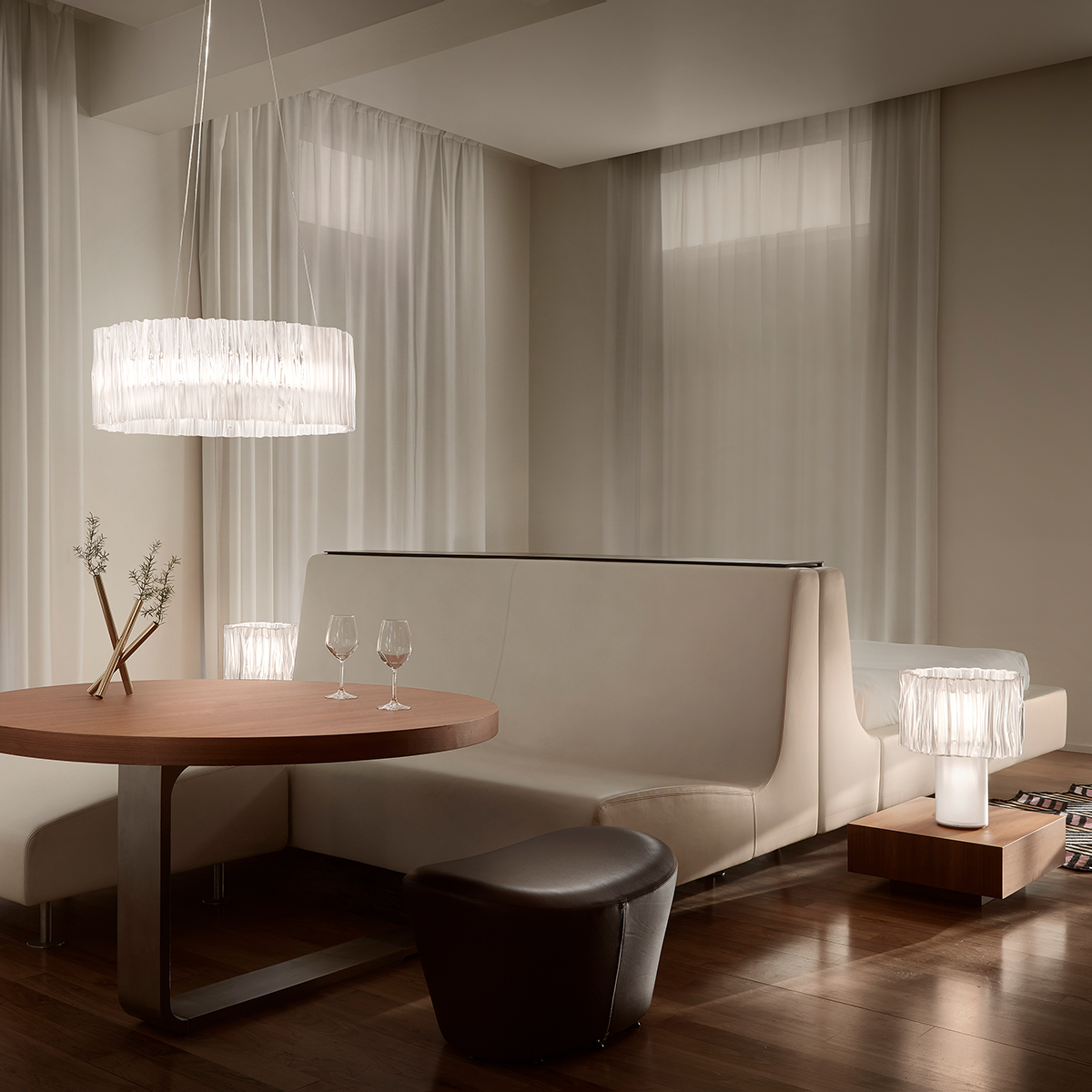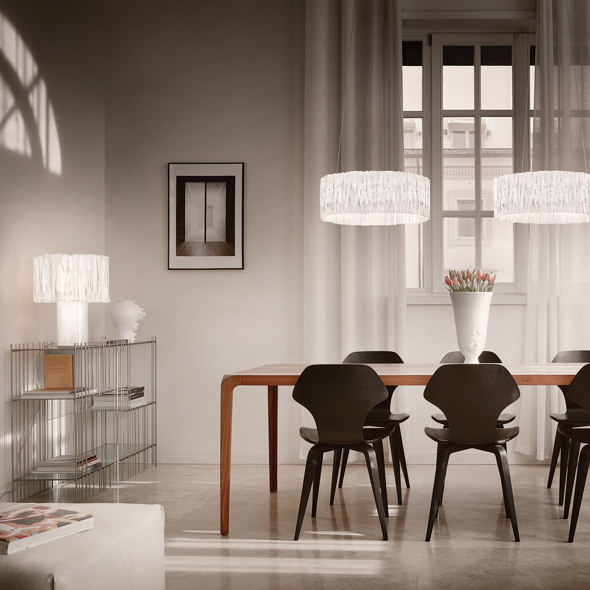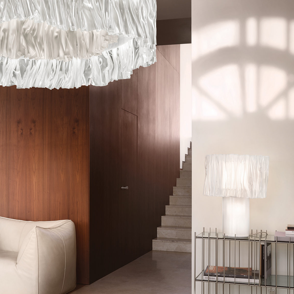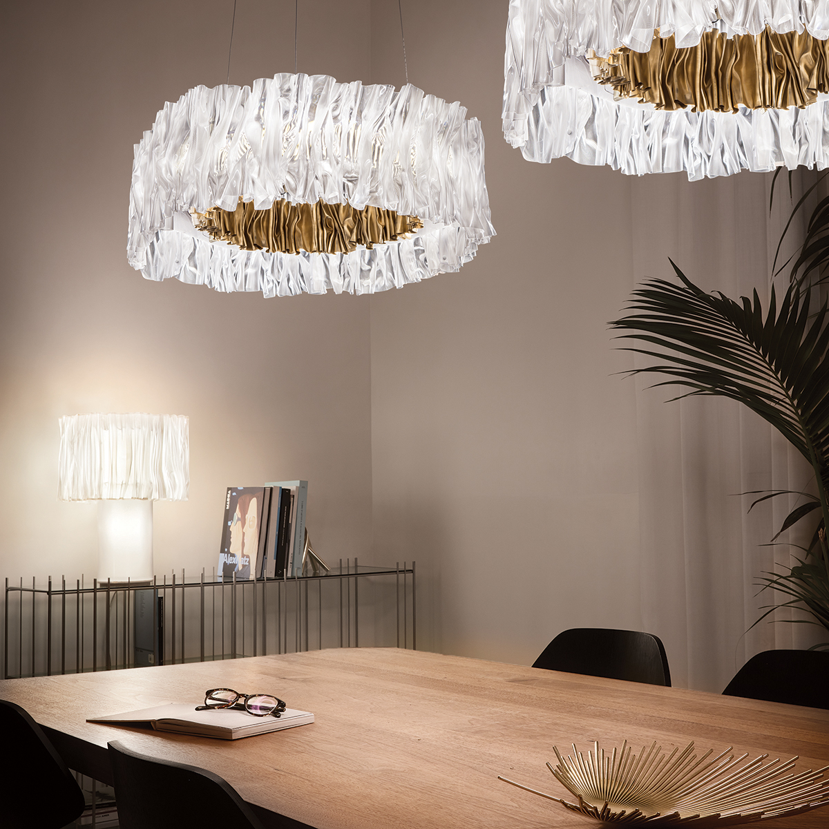 Slamp Accordéon Table, prisma, und Slamp Accordéon LED Suspension, prisma white (weiß)
