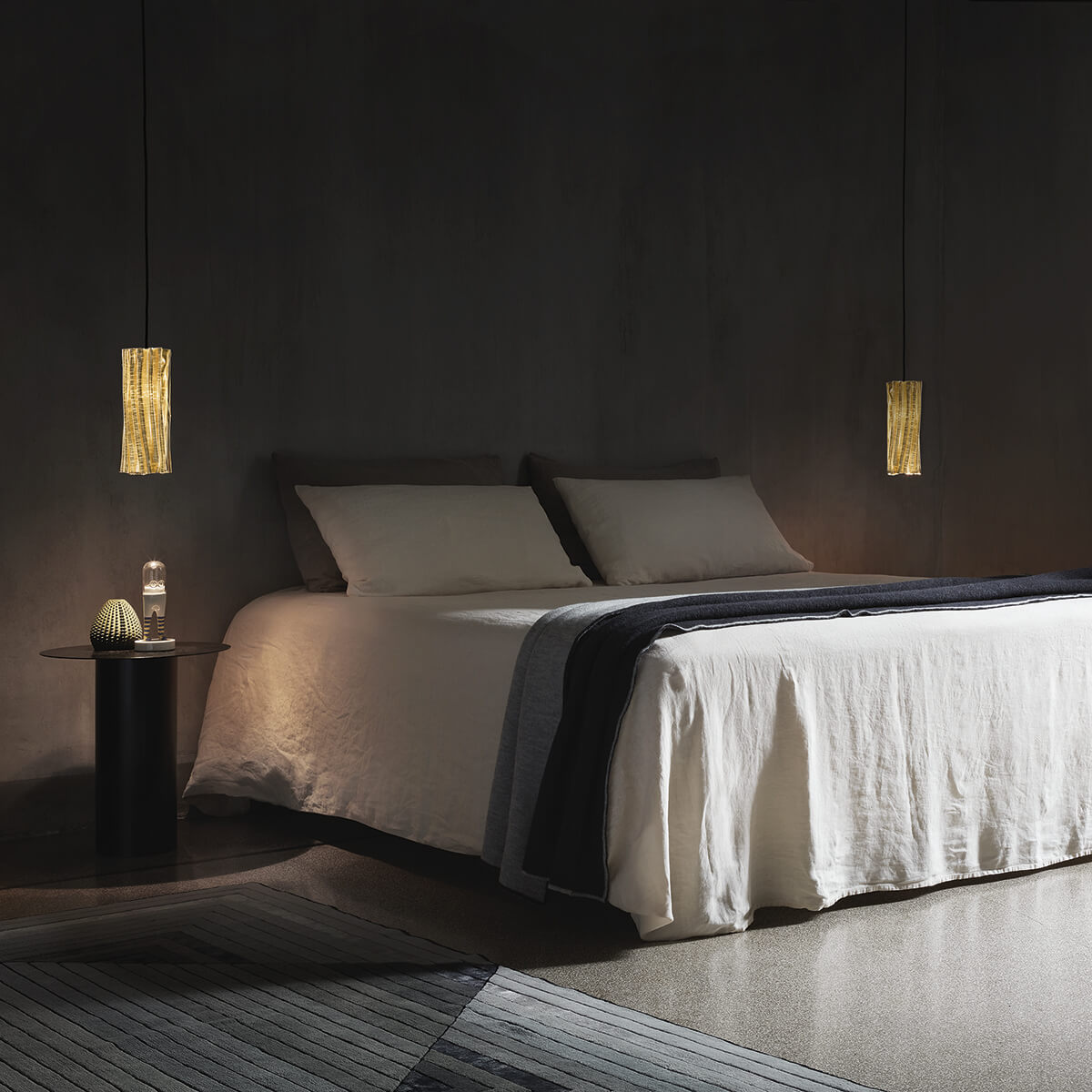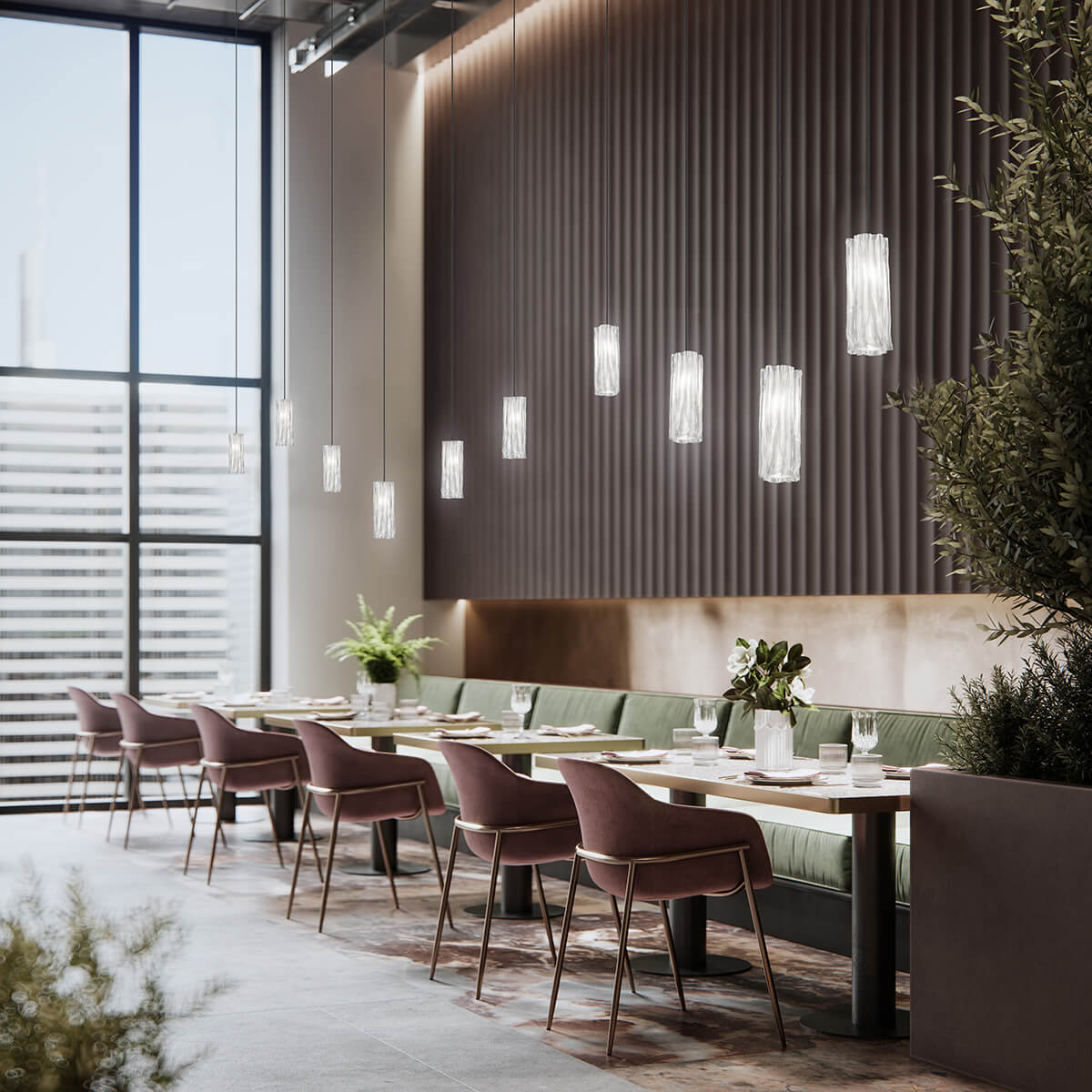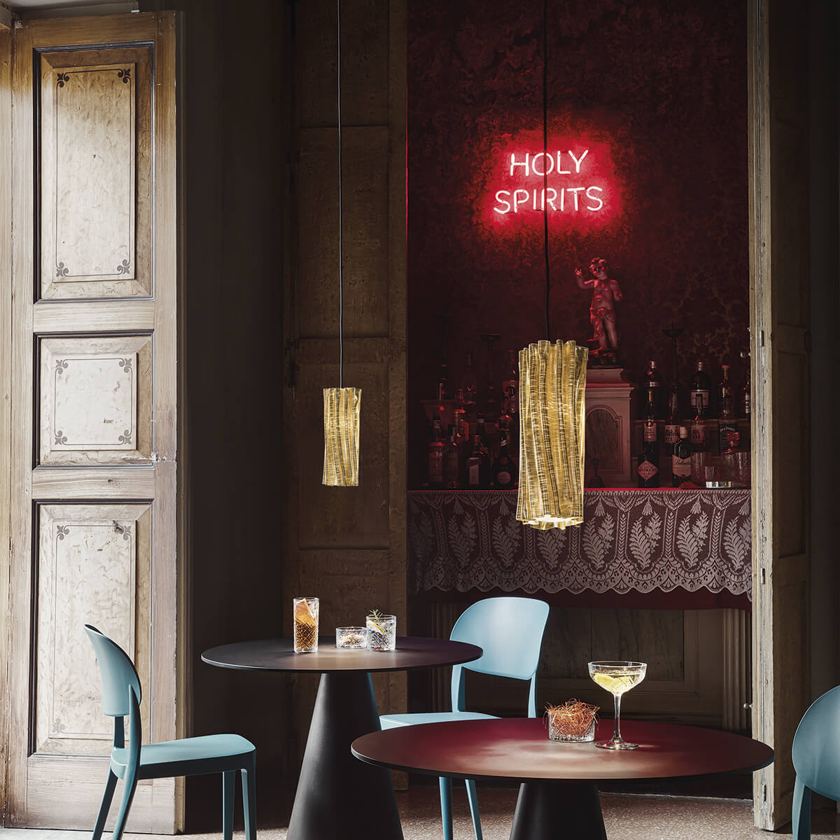 Der zylinderförmige Lampenschirm ist aus veredeltem Lentiflex® gefertigt, einem hochwertigen Kunststoff, der für seine schimmernde Wirkung bekannt ist. Das Material bricht das Licht auf eine Weise, die die Oberfläche des Schirms in ein lebendiges, dynamisches Muster verwandelt. Das Ergebnis ist eine weiche, zugleich direkt gestreute Lichtausstrahlung, die besonders gut dazu geeignet ist, um über Tischen und Theken ein einladendes Ambiente zu erzeugen.