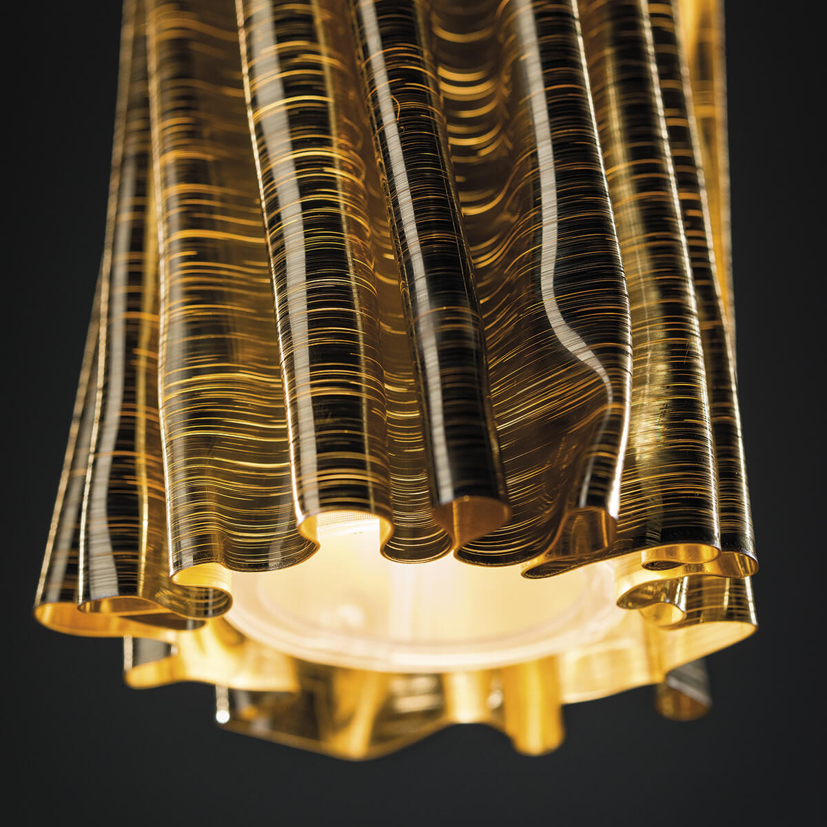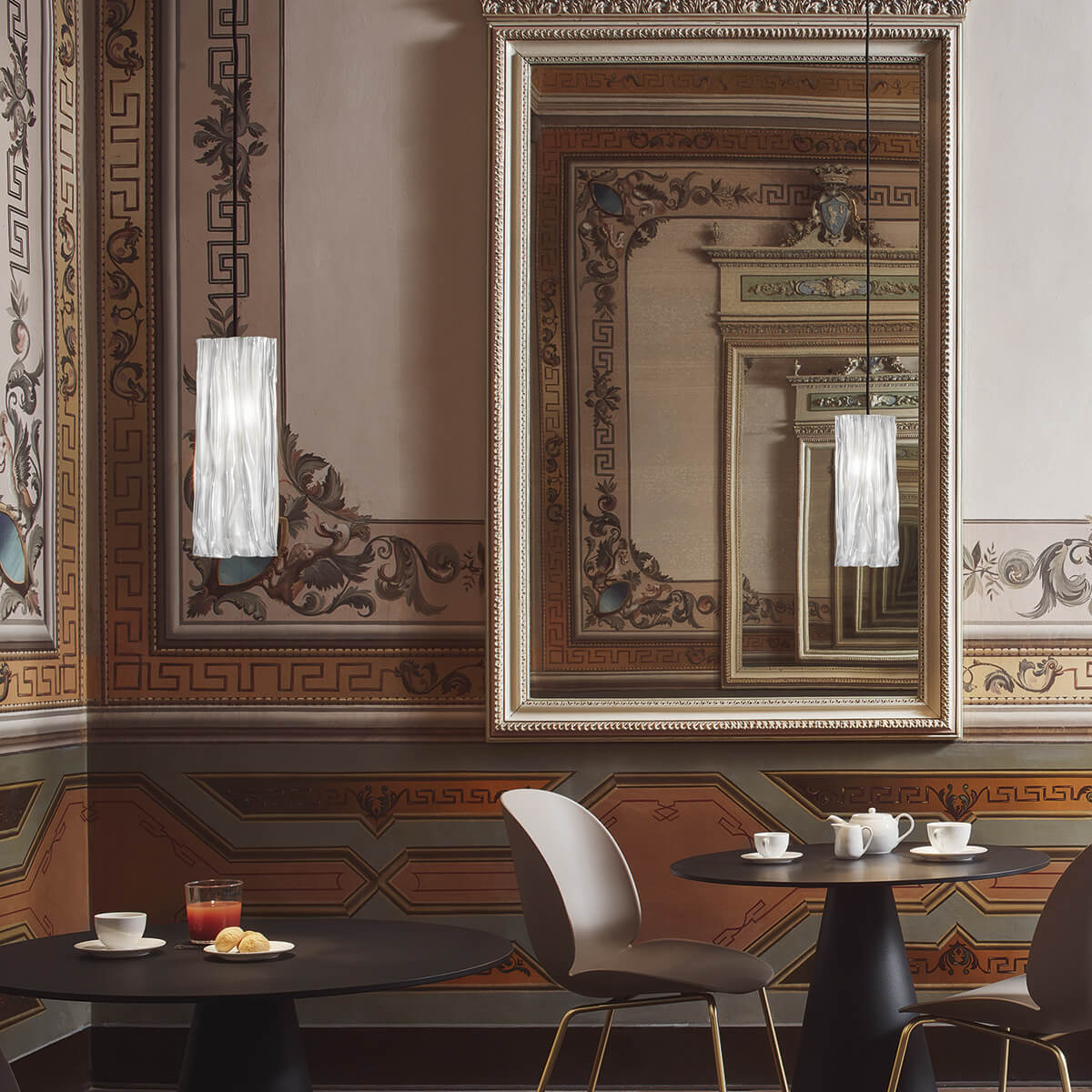 Komplettiert um ein elegantes schwarzes Kabel und eine passende Deckenrosette, bietet die Slamp Accordéon Vertical Pendelleuchte eine optisch ansprechende Installation, die allein oder in einer Reiheninstallation für dramatische Effekte sorgt. Vor allem in Bars, Clubs, Hotellobbys oder über Rezeptionstischen entfaltet diese Lampe ihre volle Wirkung und zieht alle Blicke auf sich.