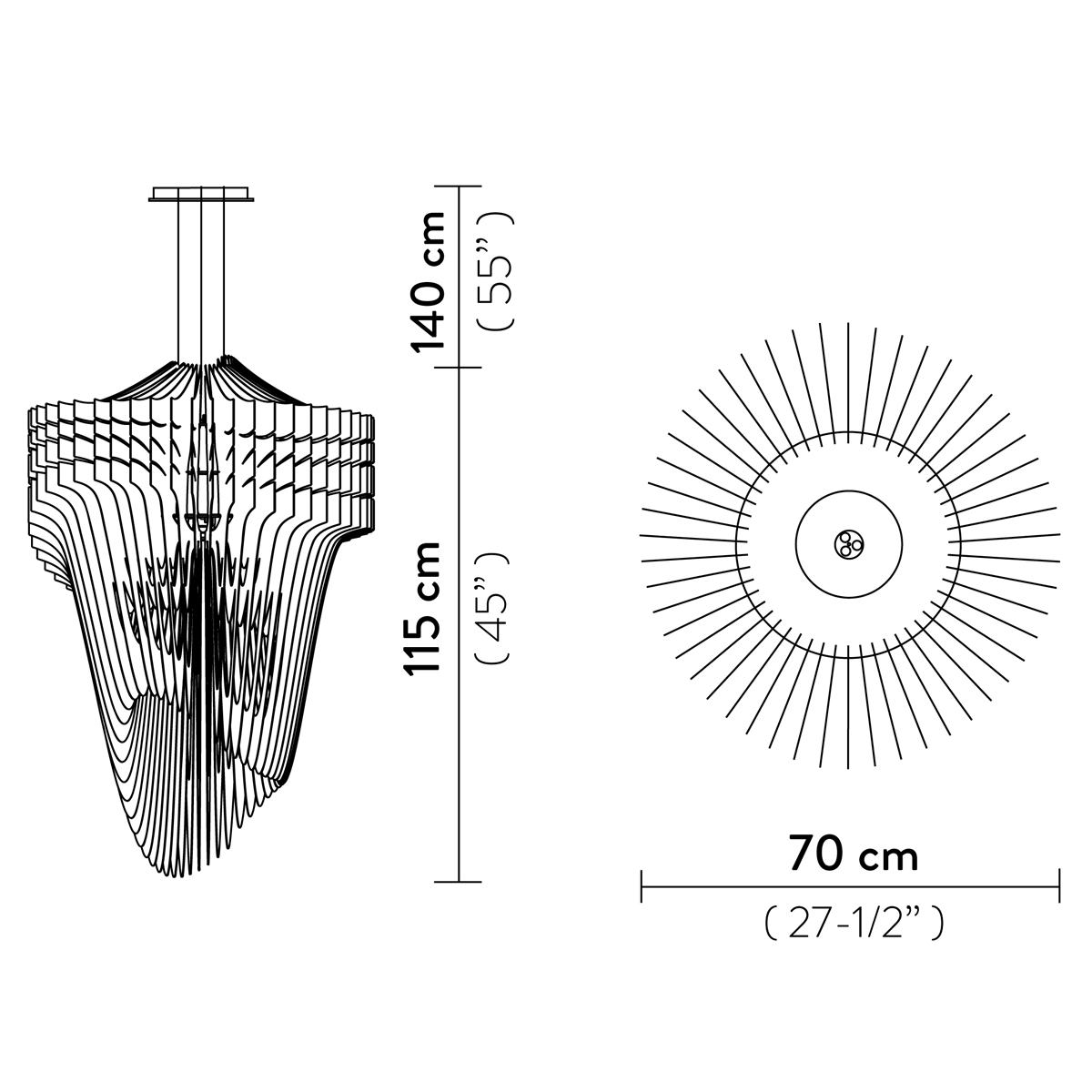Bitte beachten Sie, dass die Hängeleuchte aufgrund der Fragilität ihres Schirms nicht vormontiert ausgeliefert wird. Die scheibenförmigen Elemente können der inneren Struktur per Hand angesetzt werden. Zur besseren Orientierung sind die Scheiben durchnummeriert. Die Länge der Stahlseilaufhängung lässt sich im Zuge der Montage anpassen.