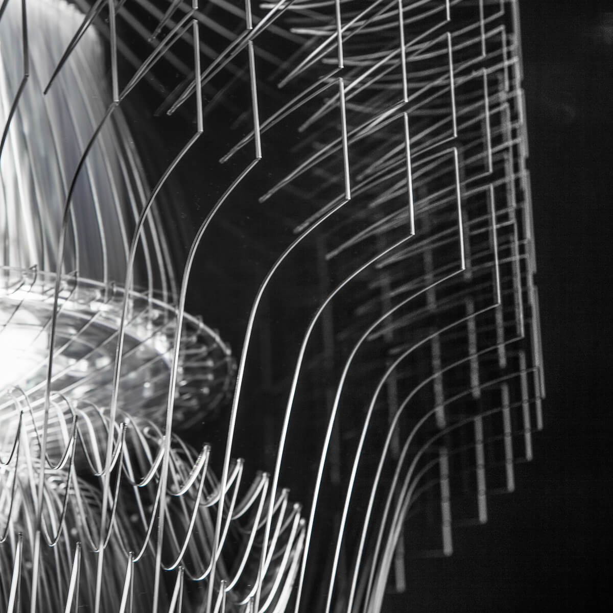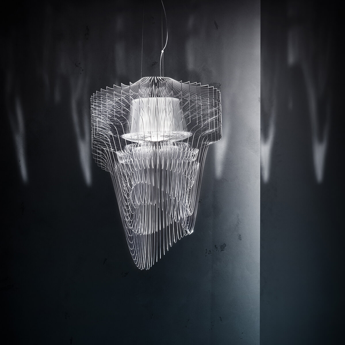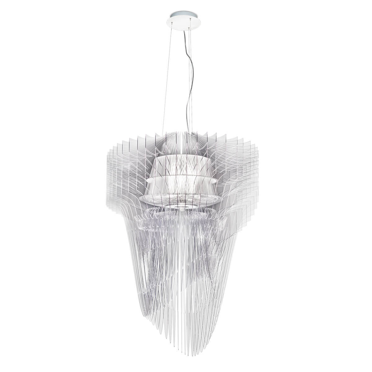 Bitte beachten Sie, dass die Pendelleuchte aufgrund der Empfindlichkeit ihres Lampenschirms nicht vormontiert geliefert wird. Die scheibenförmigen Elemente können der inneren Struktur von Hand angefügt werden. Zur Orientierung sind die Scheiben durchnummeriert. Die Länge der Stahlseilaufhängung kann im Zuge der Montage eingestellt werden.