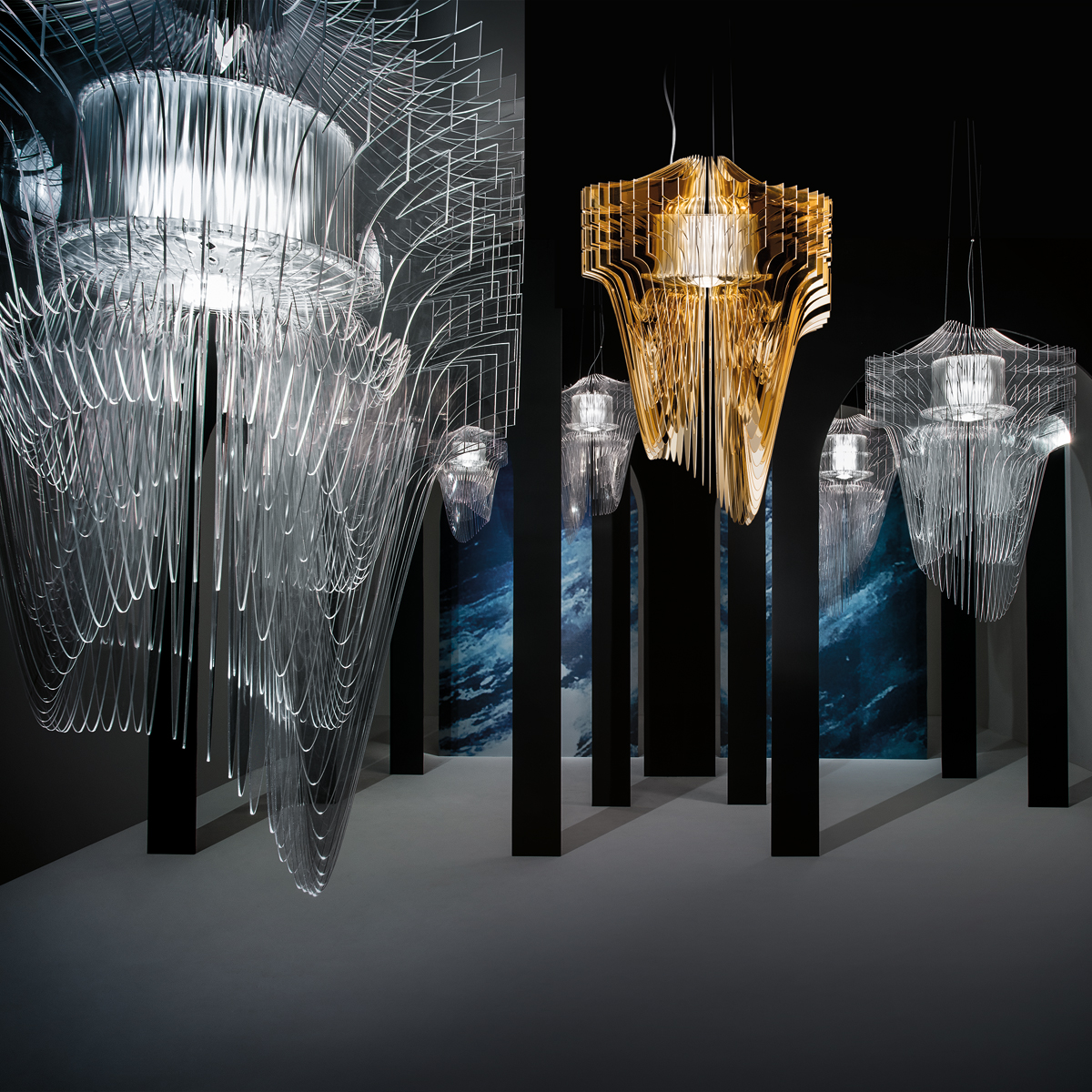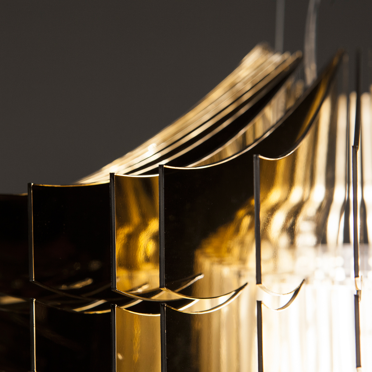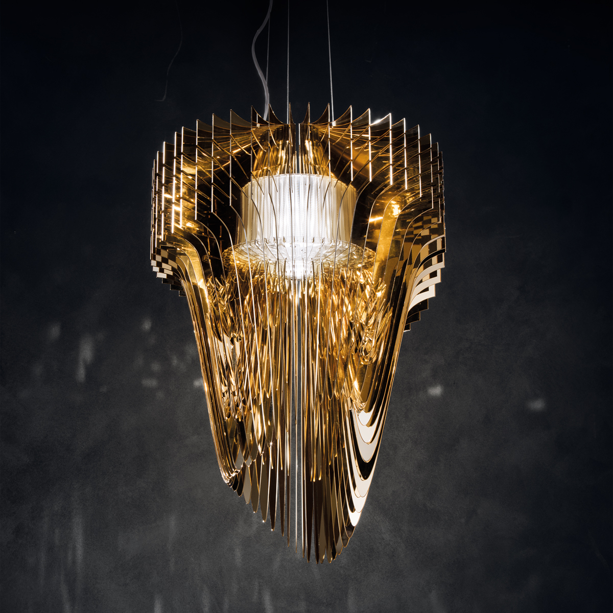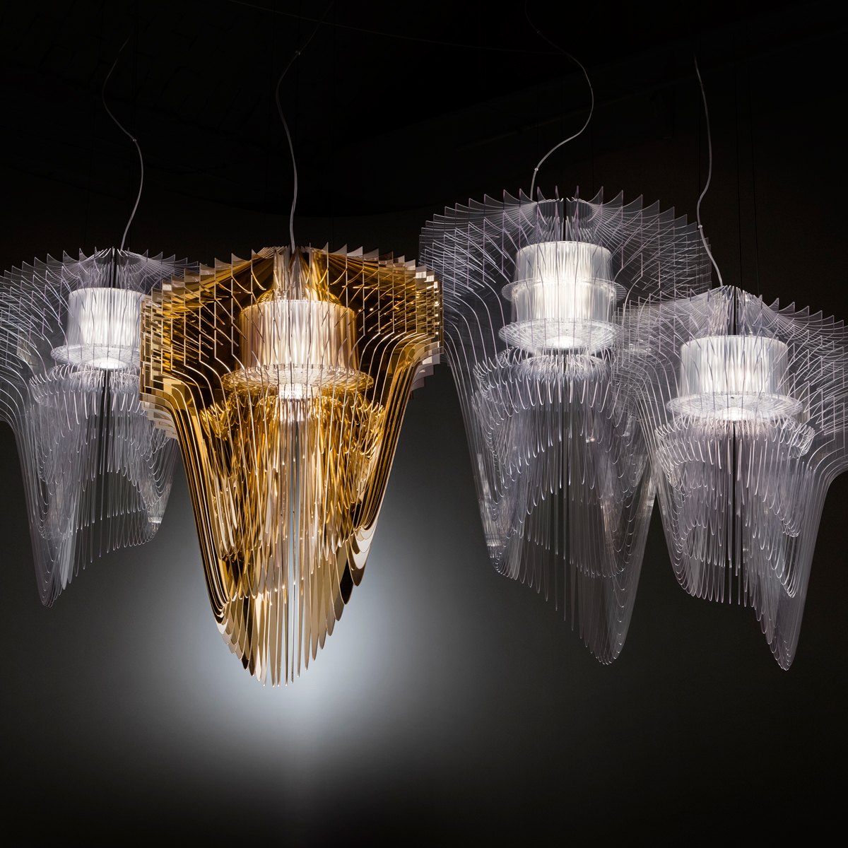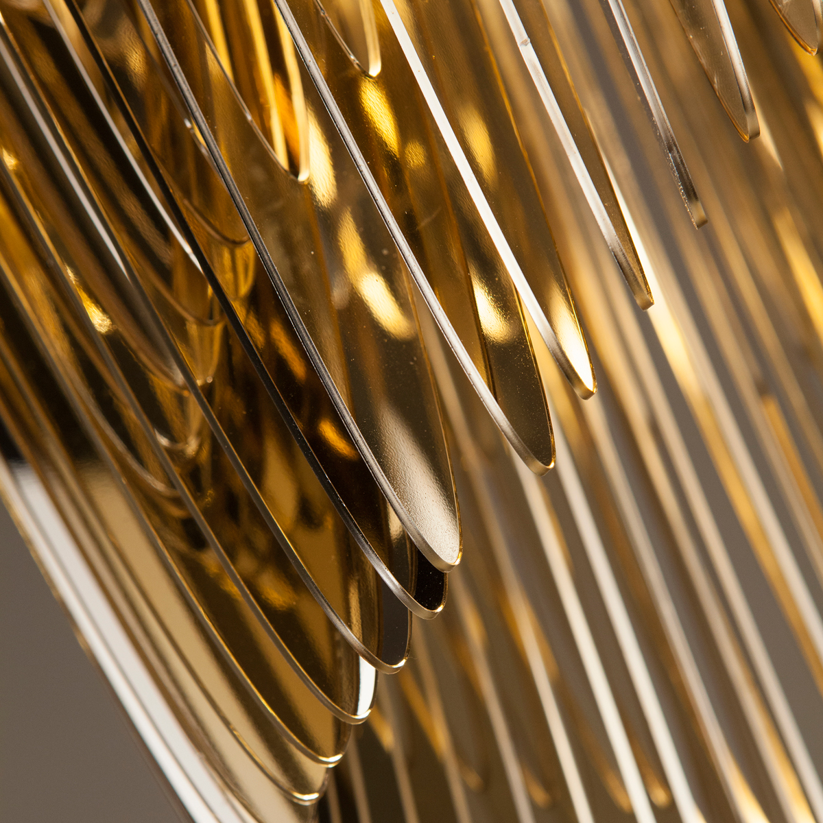 Die goldene Ausführung verfügt über eine goldfarbene Rosette, die transparente Version über einen weißen Deckenbaldachin.