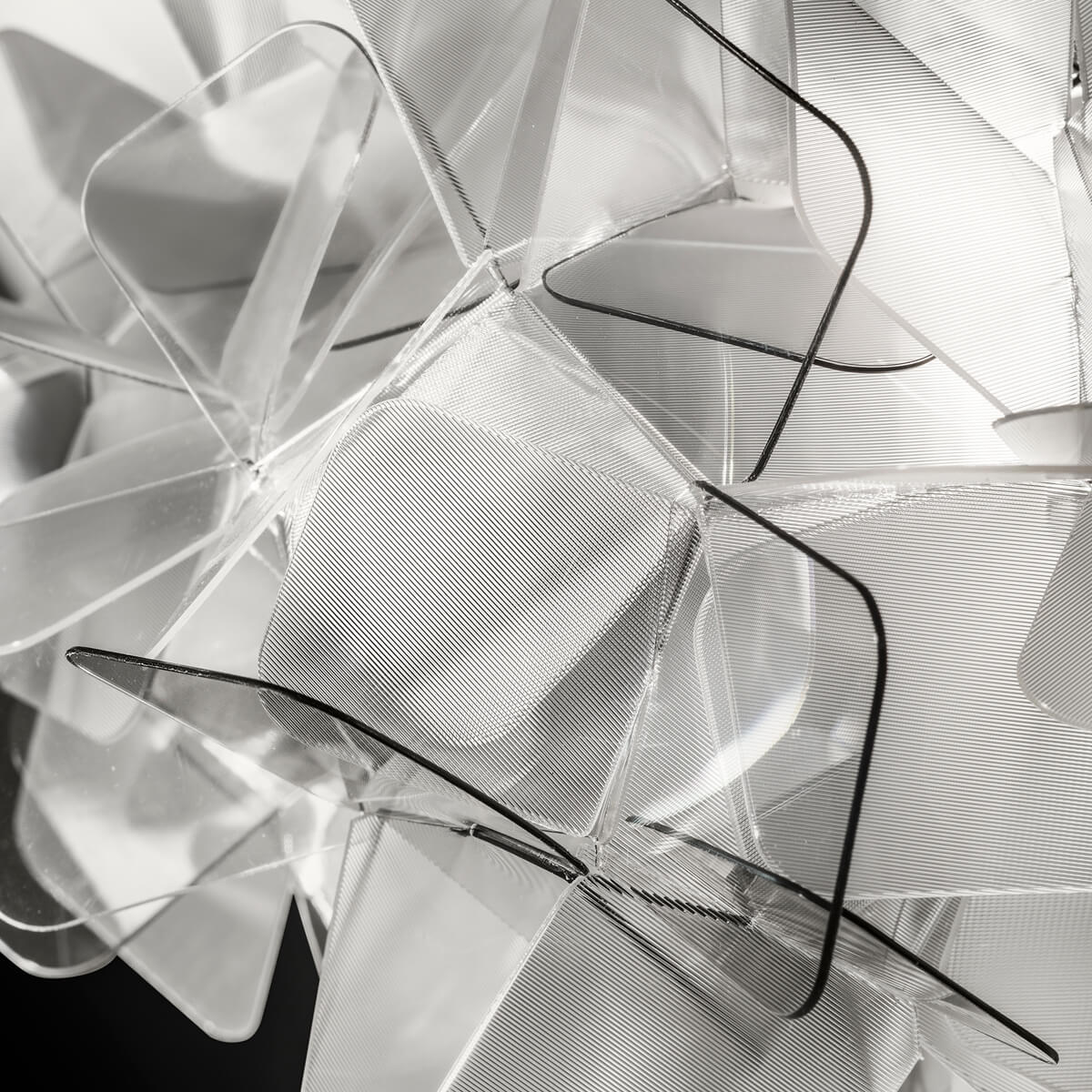 Die unzähligen Blättchen der Clizia Battery LED Akkuleuchte bestehen aus glasähnlichem Lentiflex®, dessen fresnelartige Oberfläche für irisierende Lichteffekte sorgt. Dieser besondere Technopolymer, ein hochwertiger und von Slamp patentierter Kunststoff, ist vollständig recycelbar, widerstandsfähig und einfach zu reinigen.
