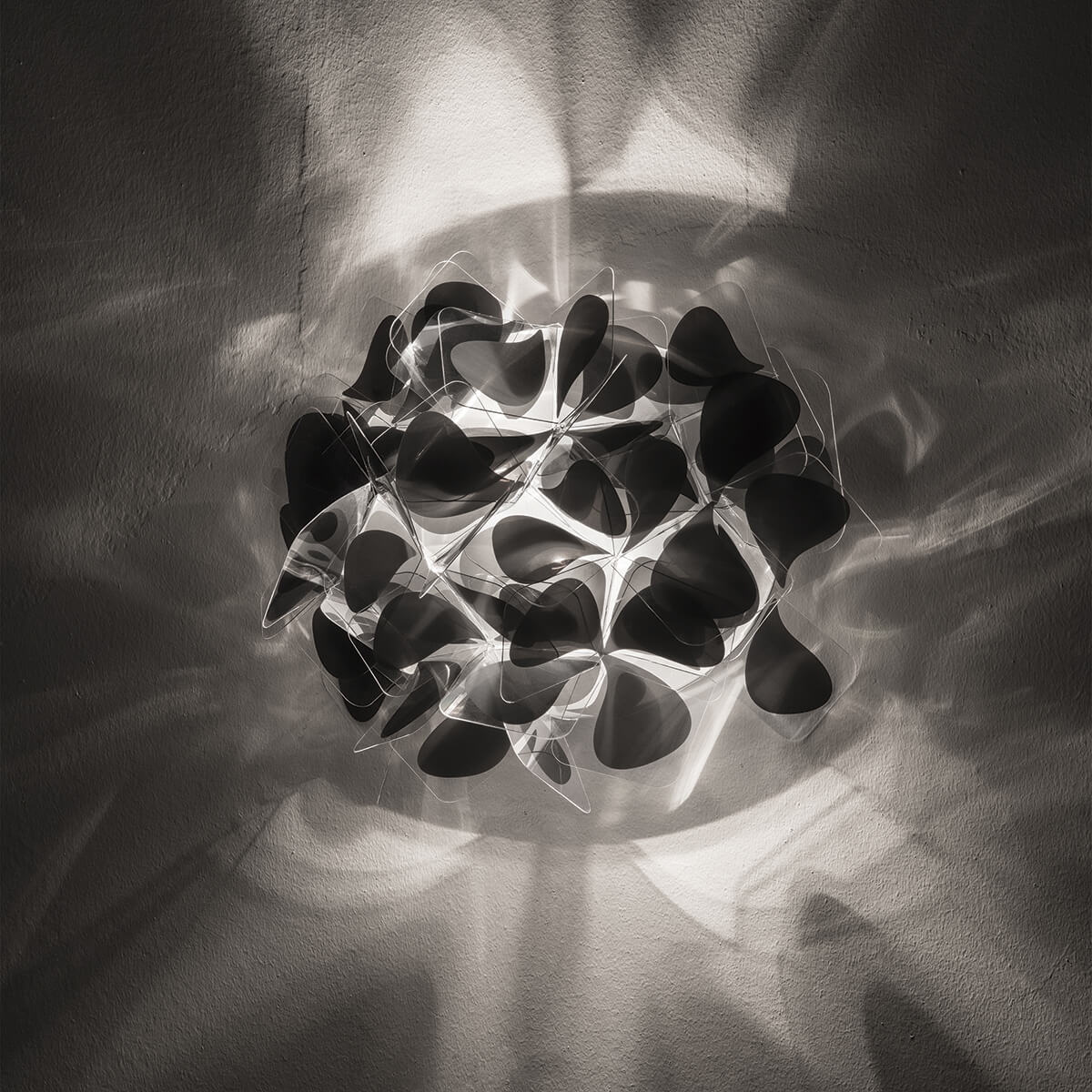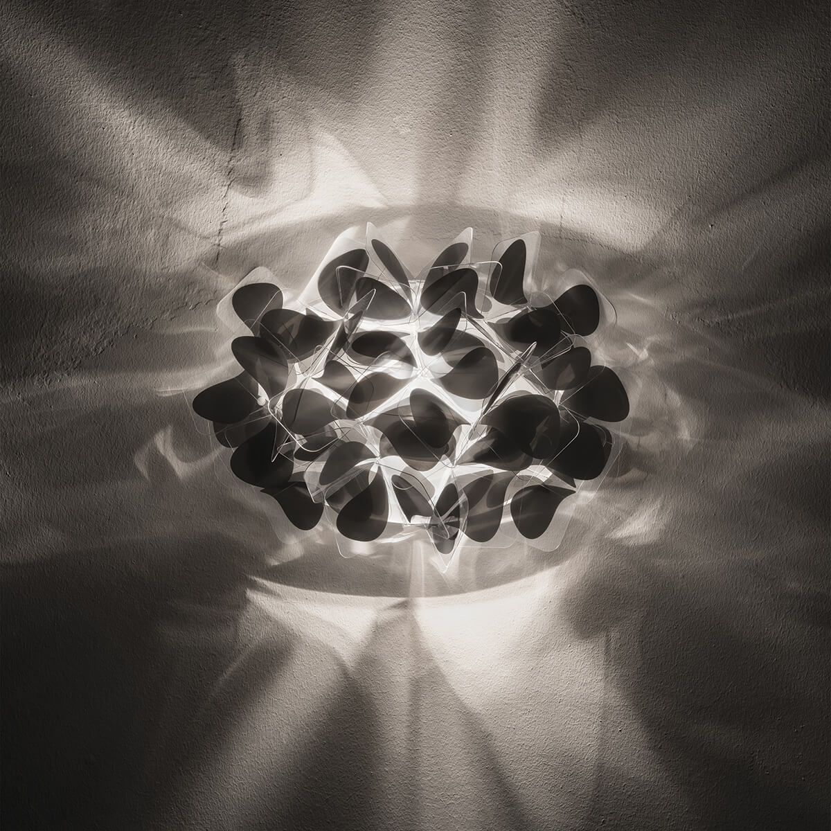 Entworfen von dem italieniscen Designer Adriano Rachele, kombiniert die Wandleuchte eine sorgfältige Fertigung mit praktischer Funktionalität. Die Leuchte ist mit einer Magnethalterung ausgestattet, die eine schnelle und einfache Installation sowie Wartung ermöglicht. Der Leuchtenschirm, der an ein zartes Bouquet erinnert, besteht aus unzähligen, von Hand zusammengesteckten Blättchen aus Cristalflex®, einem innovativen Kunststoff von besonderer Haltbarkeit.