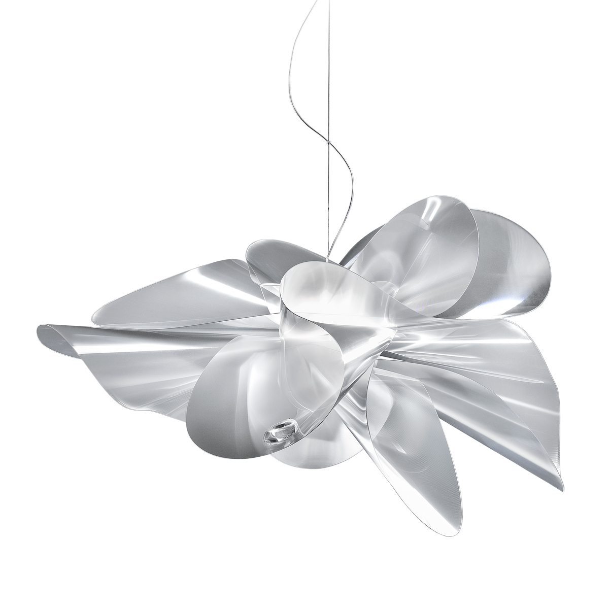 Die geschwungenen Flächen der Étoile LED Suspension sind gänzlich aus transparentem, prismenhaft schimmerndem Lentiflex® kreiert, einem robusten und hochwertigen Kunststoff, der das Licht auf vielfältige Weise spiegelt und bricht. Auf diese Weise suggeriert die Slamp Étoile LED eine ungewöhnliche Dynamik und Pracht, die sie zu einem wahren Stern (frz. "étoile") unter den Leuchten macht. Einen reizvollen Blickpunkt bildet die tropfenförmige Verzierung, die einem der Leuchtenblätter auf seiner Oberseite aufsitzt und dazu dient, die Leuchte auszubalancieren.