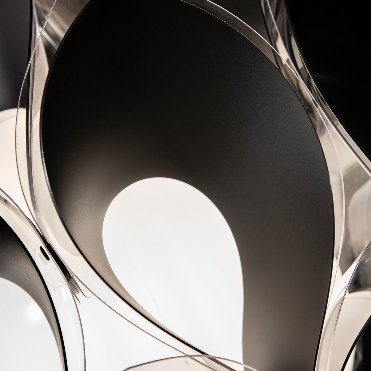 Der kunstvolle Leuchtenschirm besteht aus 60 elegant geformten Blütenblättern, die sich aus 30 farbigen und 30 transparenten Elementen zusammensetzen. Diese vielschichtige Struktur reflektiert das Licht aus unterschiedlichen Winkeln und erzeugt raffinierte Lichtspiele mit faszinierenden Reflexionen. Im Zentrum befindet sich eine opake, handgeschliffene Kugel aus Methacrylat, die das Licht sanft streut und eine angenehm diffuse, atmosphärische Beleuchtung erzeugt.
