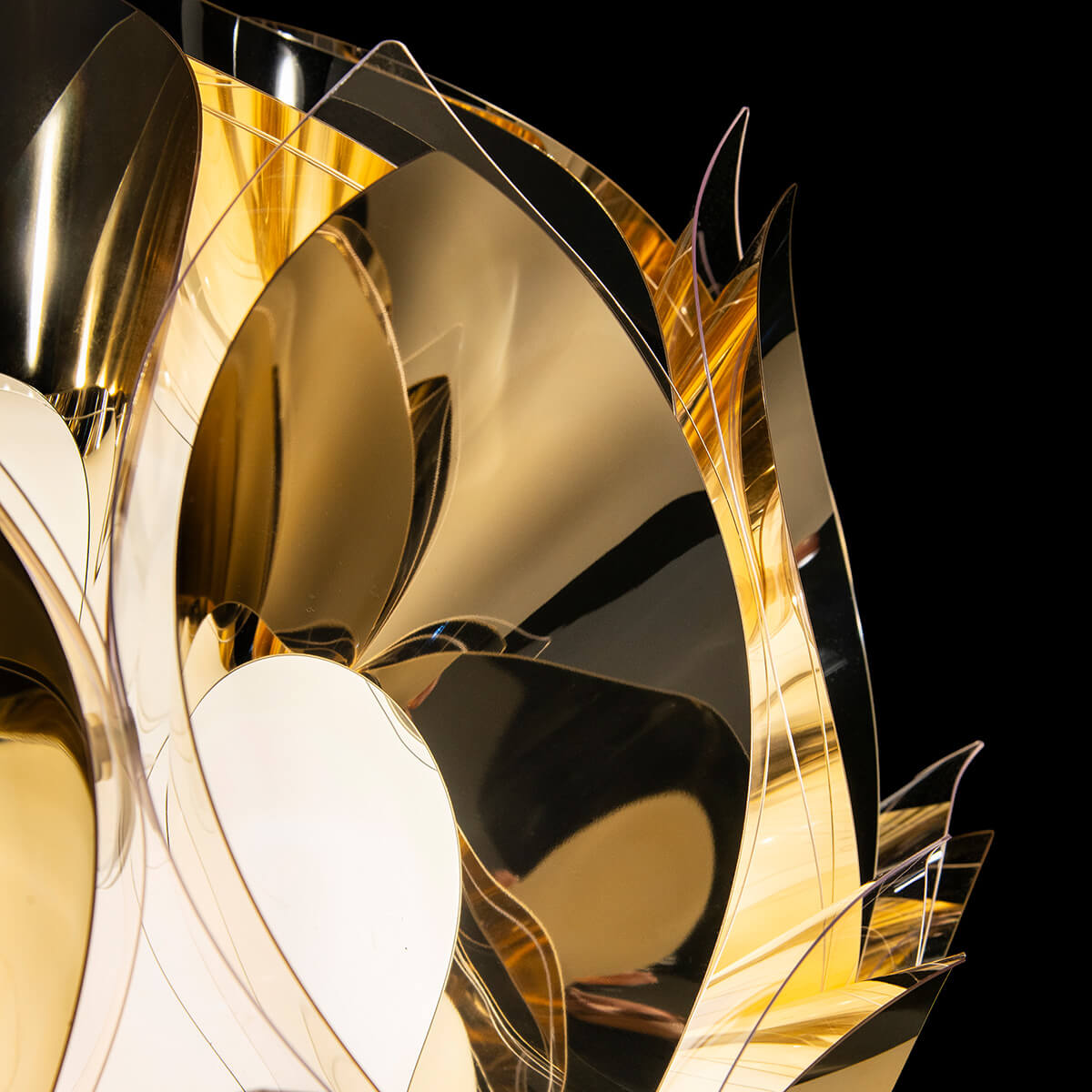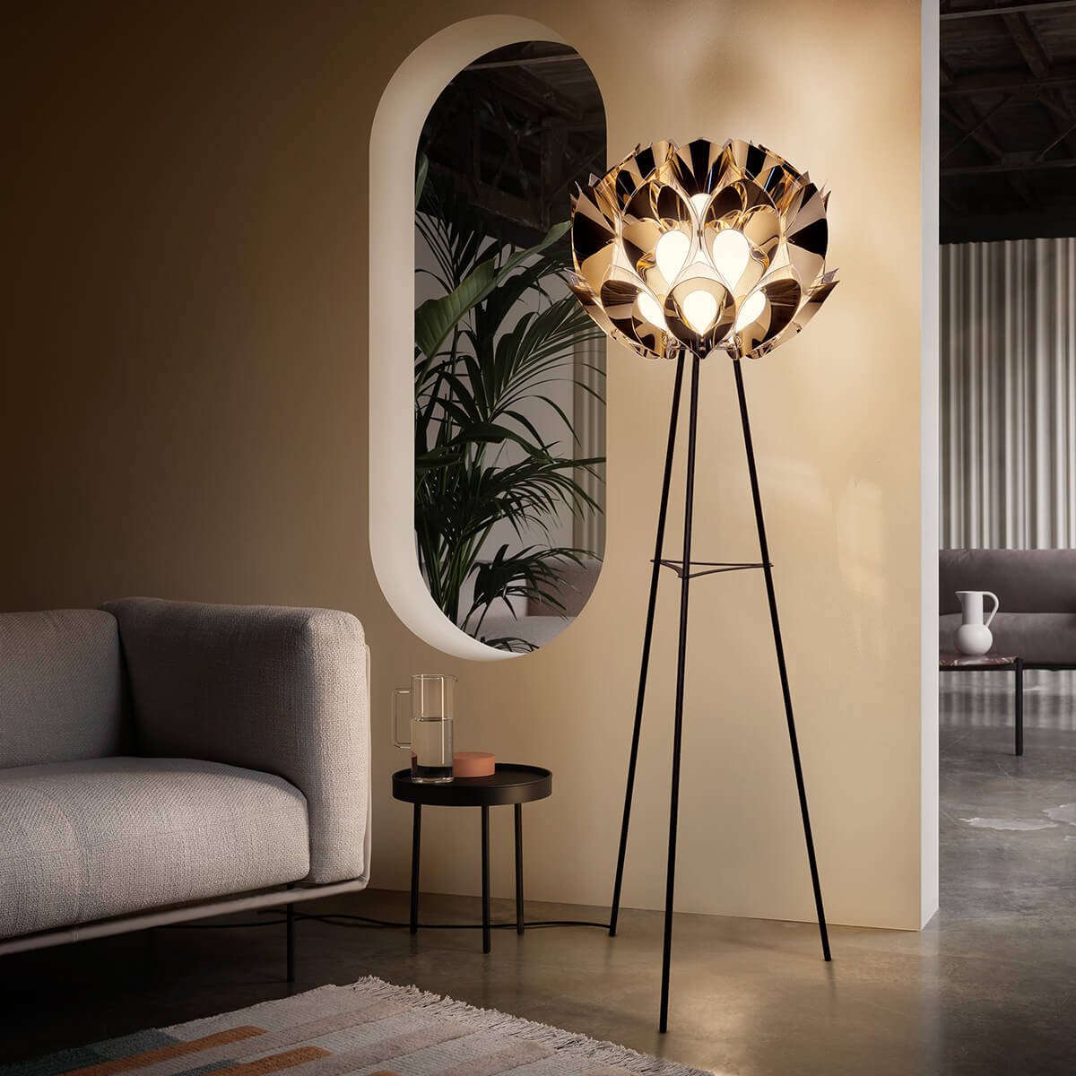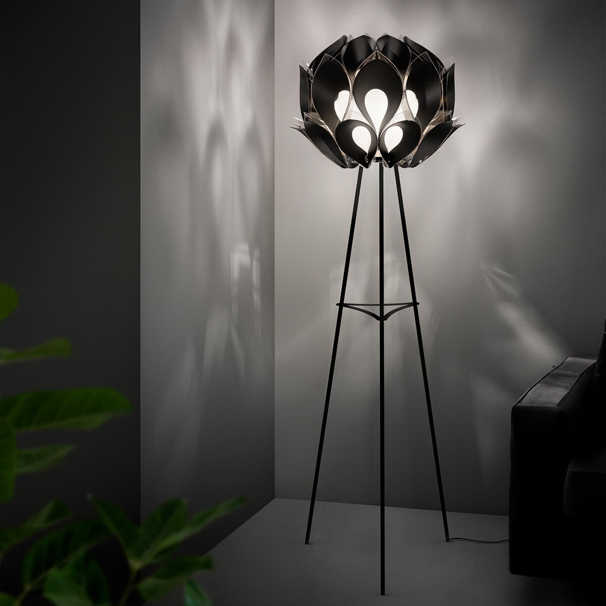 Gefertigt ist die Leuchte aus innovativen Technopolymeren wie Goldflex® und Copperflex®, die durch ihre metallisch glänzende Oberfläche eindrucksvolle Lichtreflexe erzeugen. Alternativ ist die Flora Floor auch in einer eleganten mattschwarzen Version erhältlich, die dem Design eine moderne, grafische Wirkung verleiht. Die filigrane Dreibein-Konstruktion aus Metall unterstreicht den skulpturalen Charakter und lässt den Leuchtkörper wie eine schimmernde Lichtkrone über dem Raum schweben.