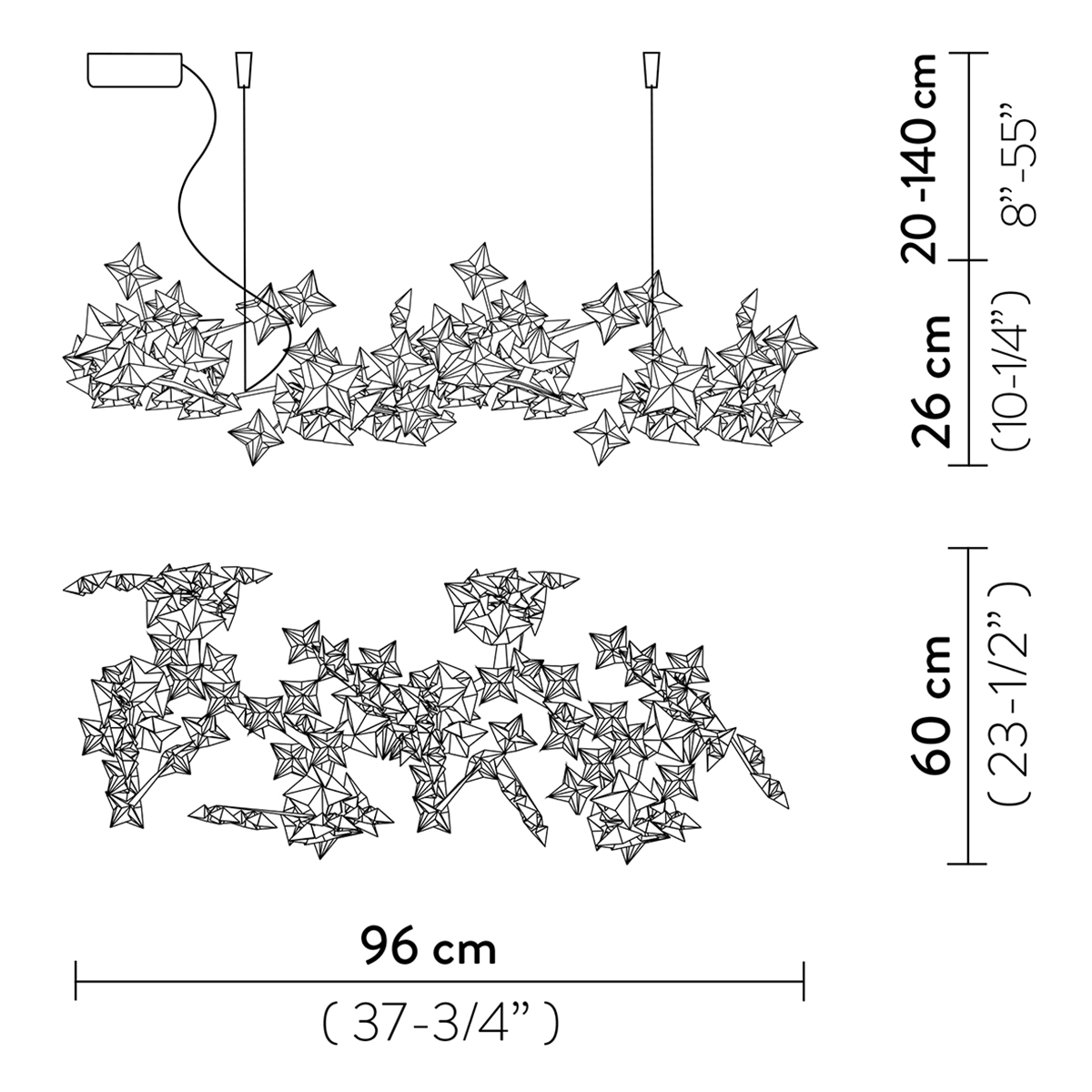 Die bezaubernde Silhouette der Pendellampe ergibt sich aus ihren von Hand zusammengefügten "Blüten" aus Lentiflex®, einem hochwertigen Kunststoff mit prismenartiger Oberfläche. Diese spezielle Beschaffenheit ermöglicht es, die funkelnden Reflexe eines Diamanten nachzubilden und ein rundum strahlendes, sanftes Licht zu erzeugen, das jede Umgebung atmosphärisch erhellt. Das Arrangement der Blüten schafft ein dekoratives und gleichzeitig funktionales Lichtspiel, das sowohl Wärme als auch Stil ausstrahlt.