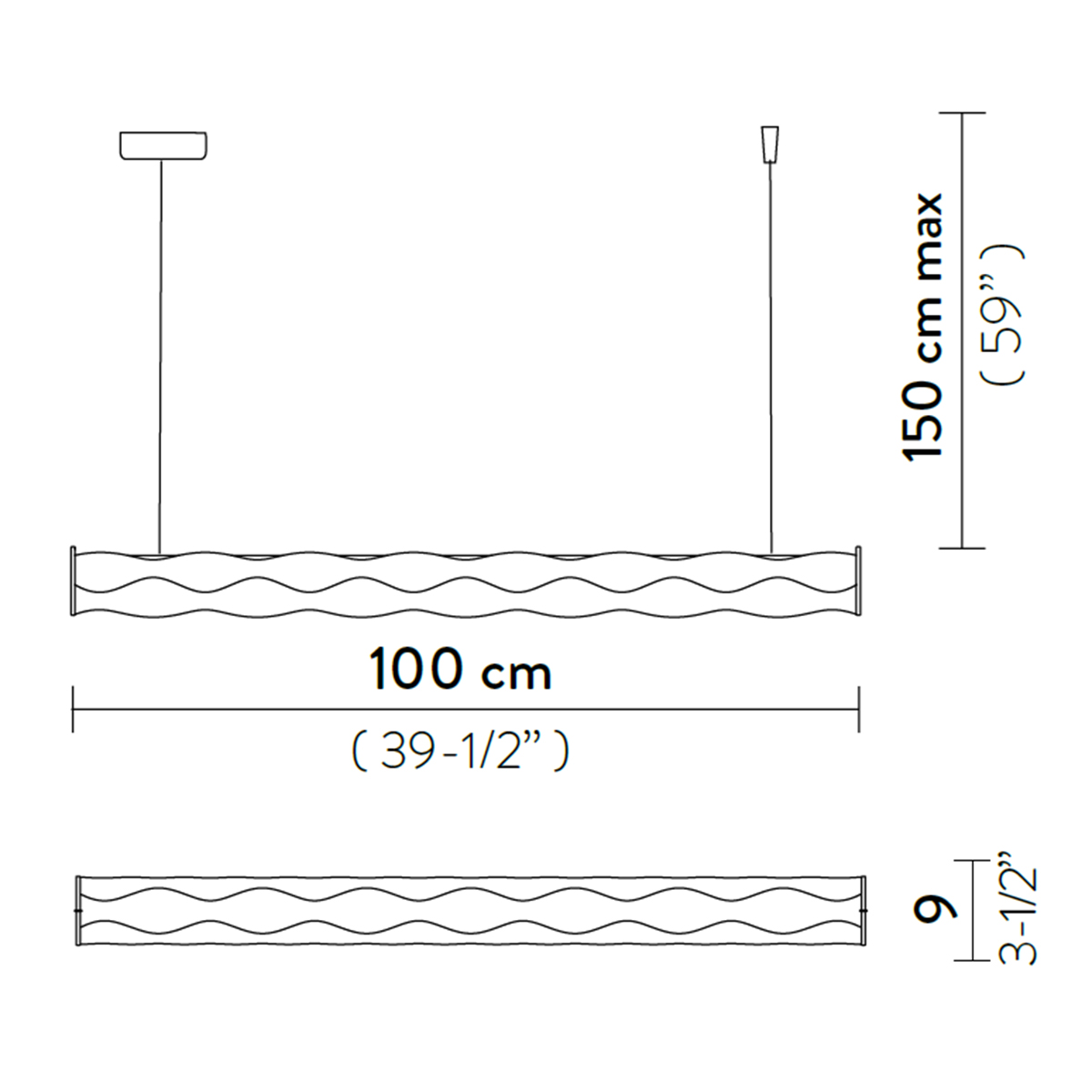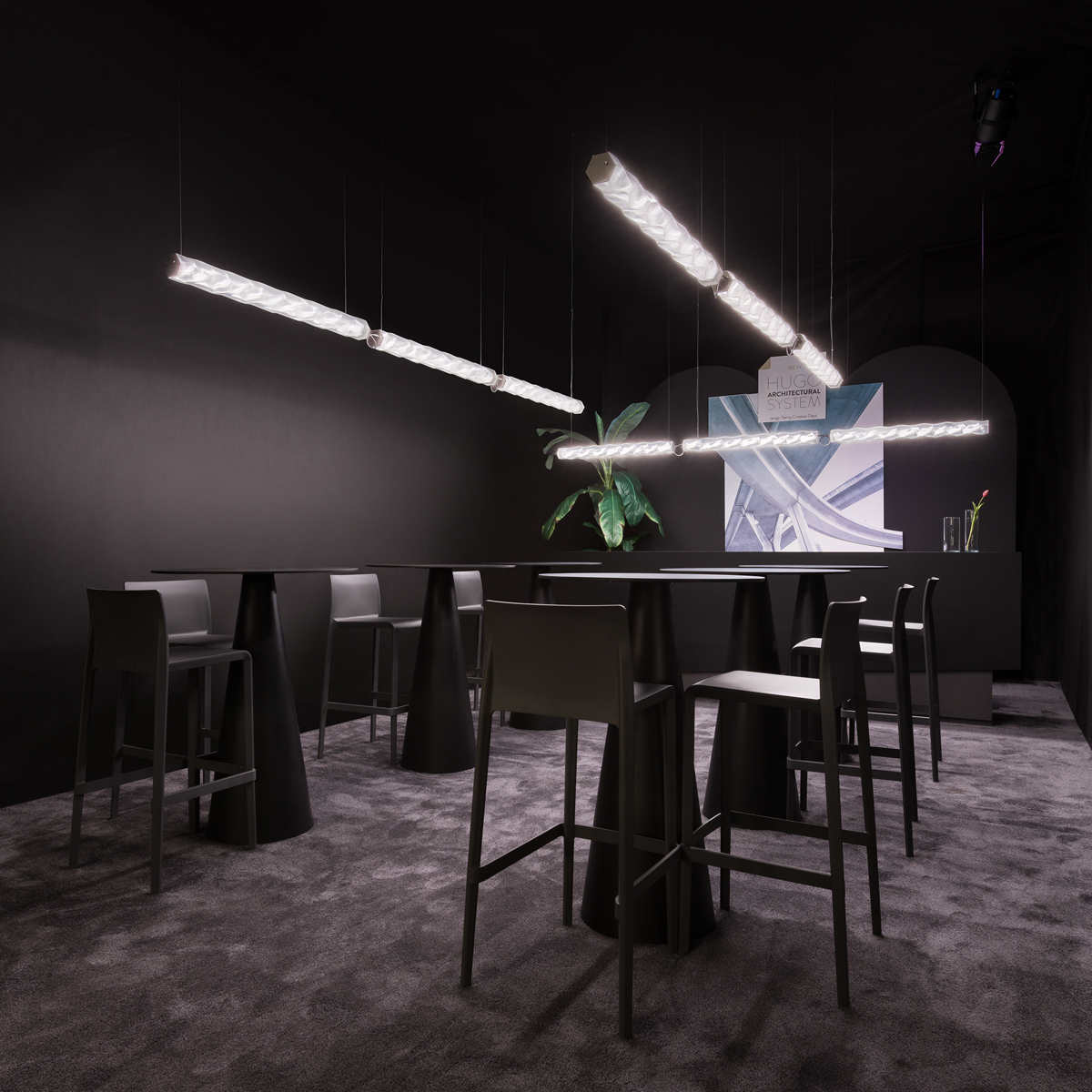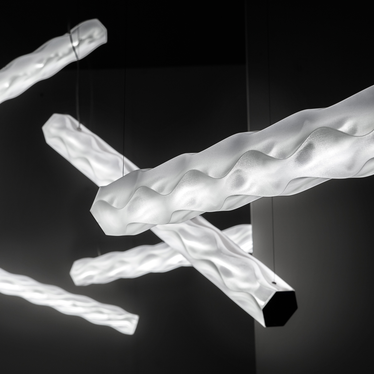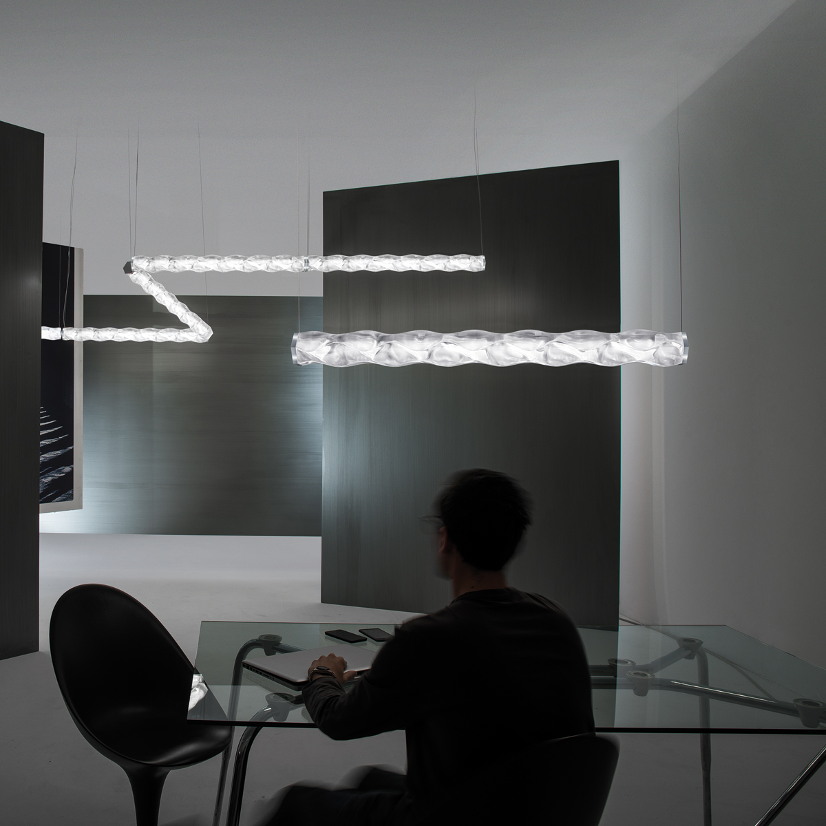 Statisch und doch regsam bewegt – die Hugo LED Suspension erscheint wie eine mit Wasser gefüllte Lichtröhre, deren Oberfläche von schillernden Nuancen durchzogen ist. Dieser Eindruck verdankt sich dem Design und Material der Leuchte: der wellenartigen Struktur des Korpus und dem innovativen Kunststoff Lentiflex®, dessen prismenhafte Oberfläche für irisierende Lichteffekte sorgt.