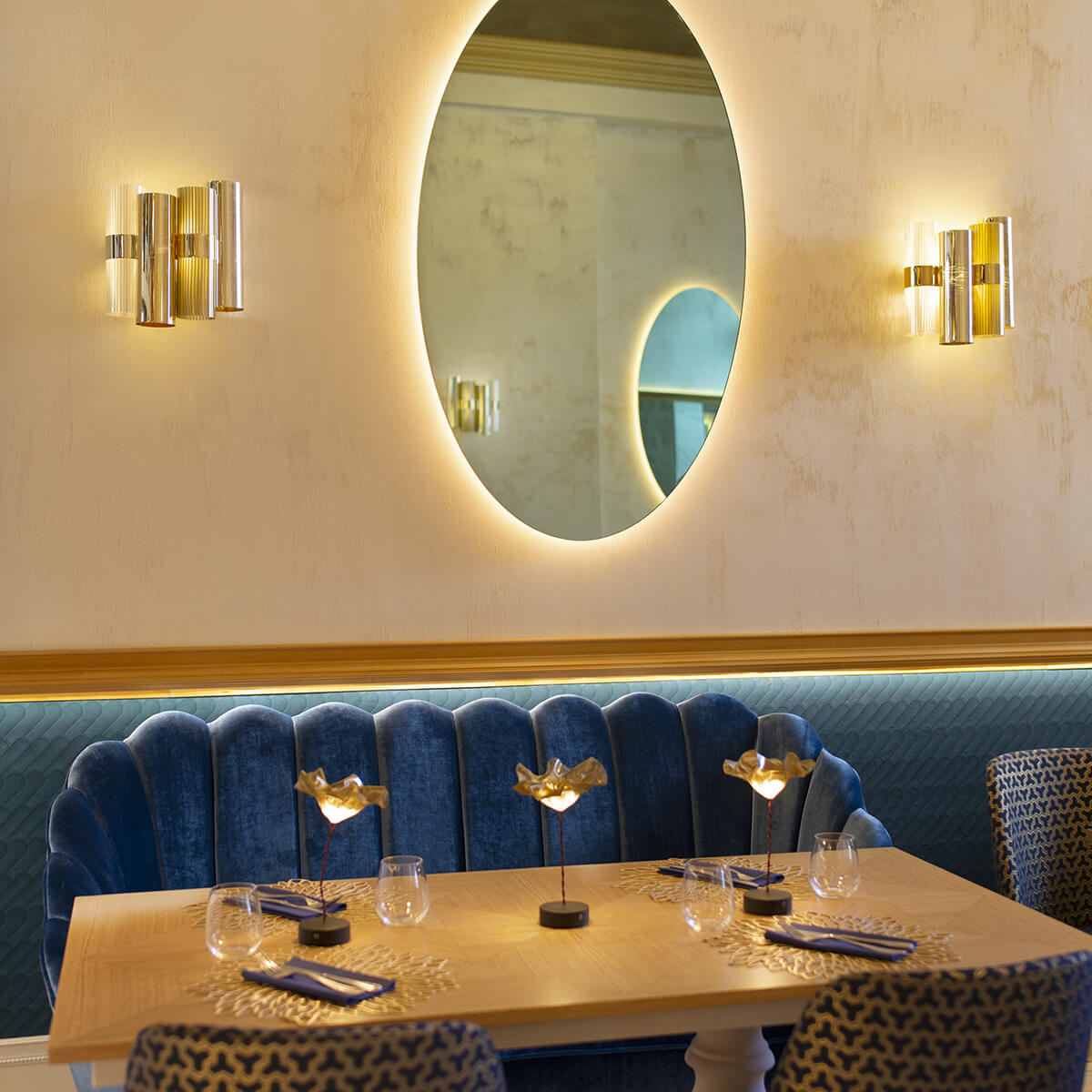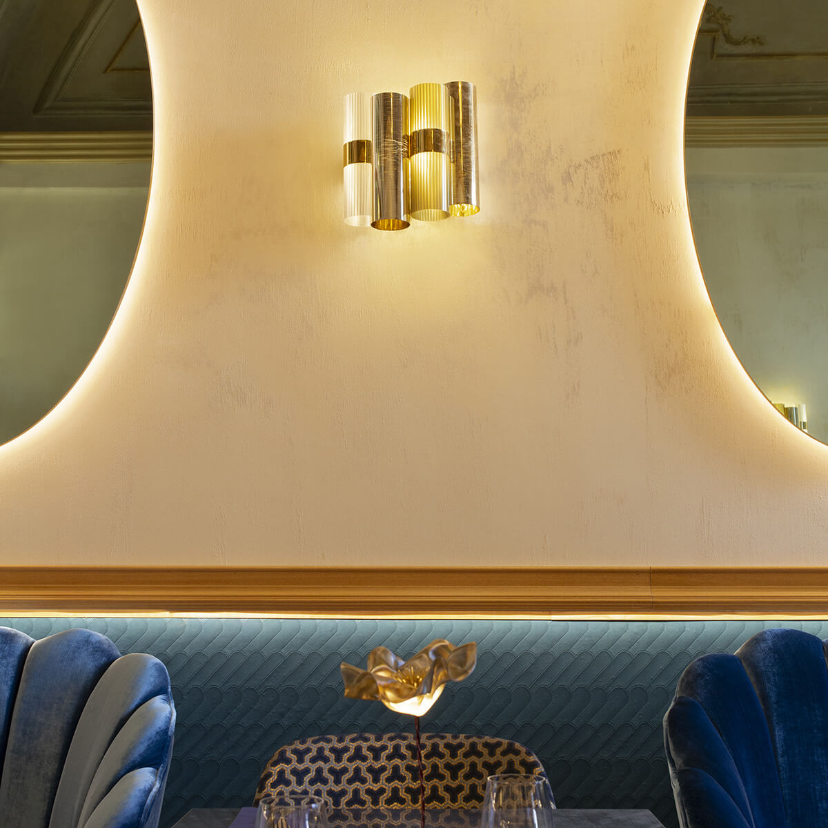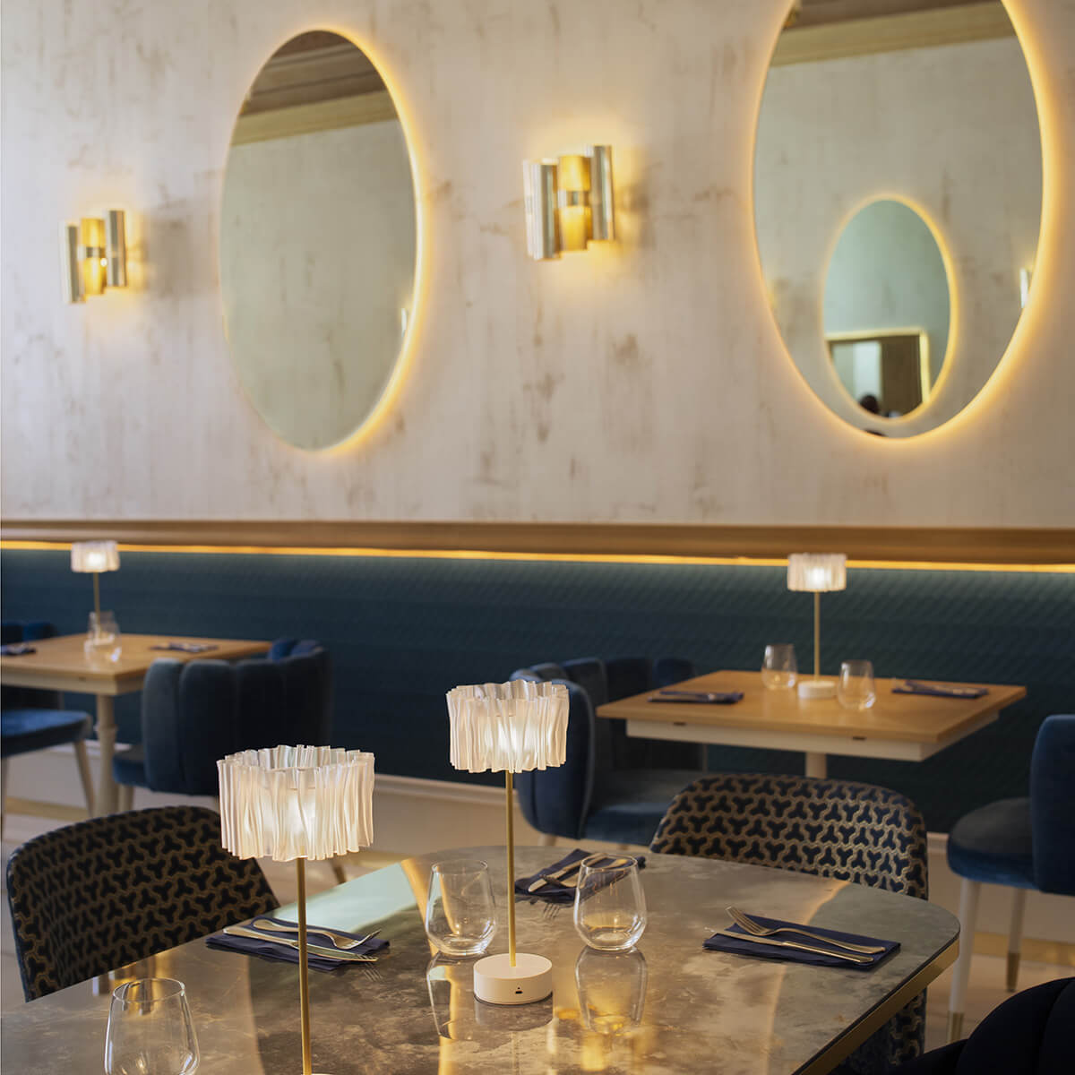 Die Akzentleuchte zeichnet sich durch eine Kombination aus direkter und indirekter, diffuser Lichtausstrahlung aus, die ein zauberhaftes Akzentlicht schafft. Dies macht sie zur perfekten Wahl für private Wohnzimmer und Flure. Aber auch in öffentlichen Innenräumen wie Salons, Lounges und Hotellobbys entfaltet sie ihre stilvolle, spektakuläre Wirkung.