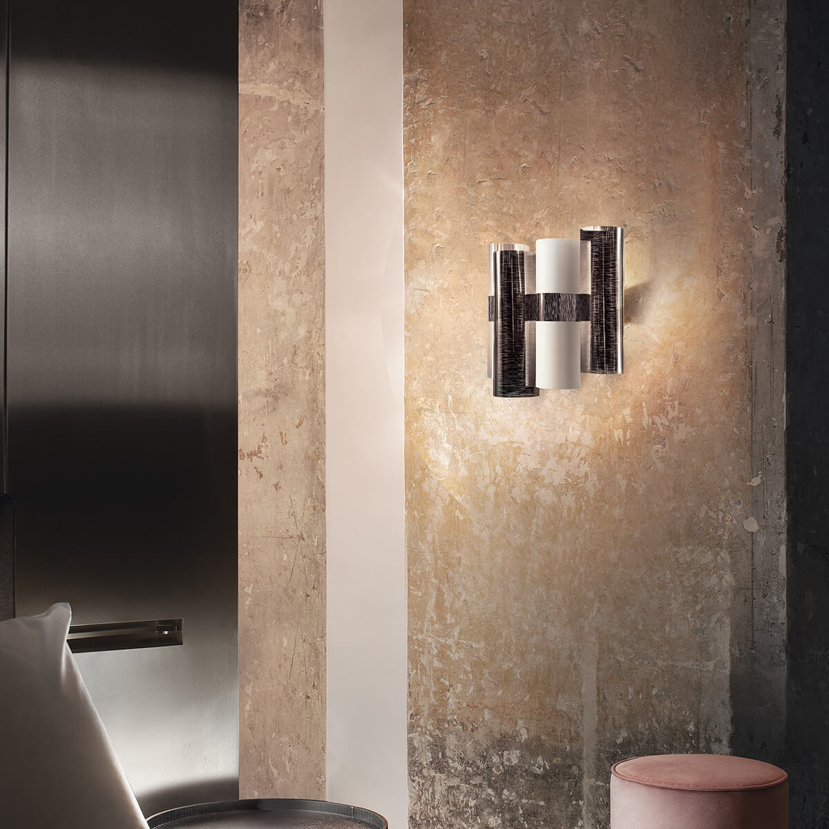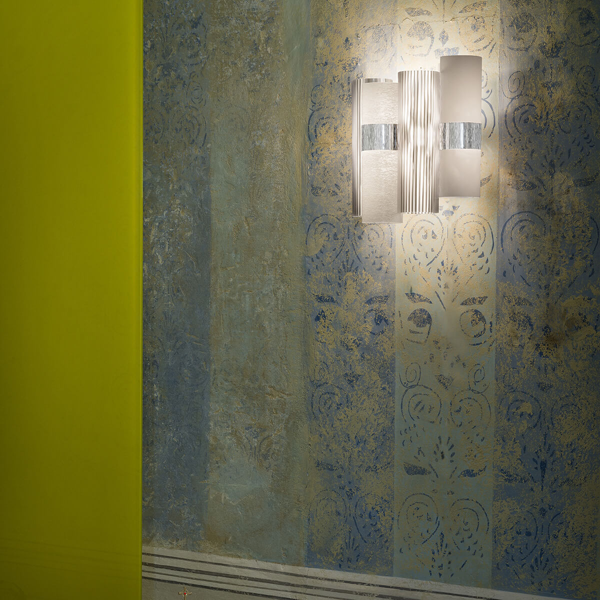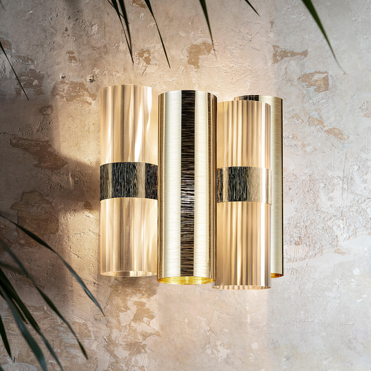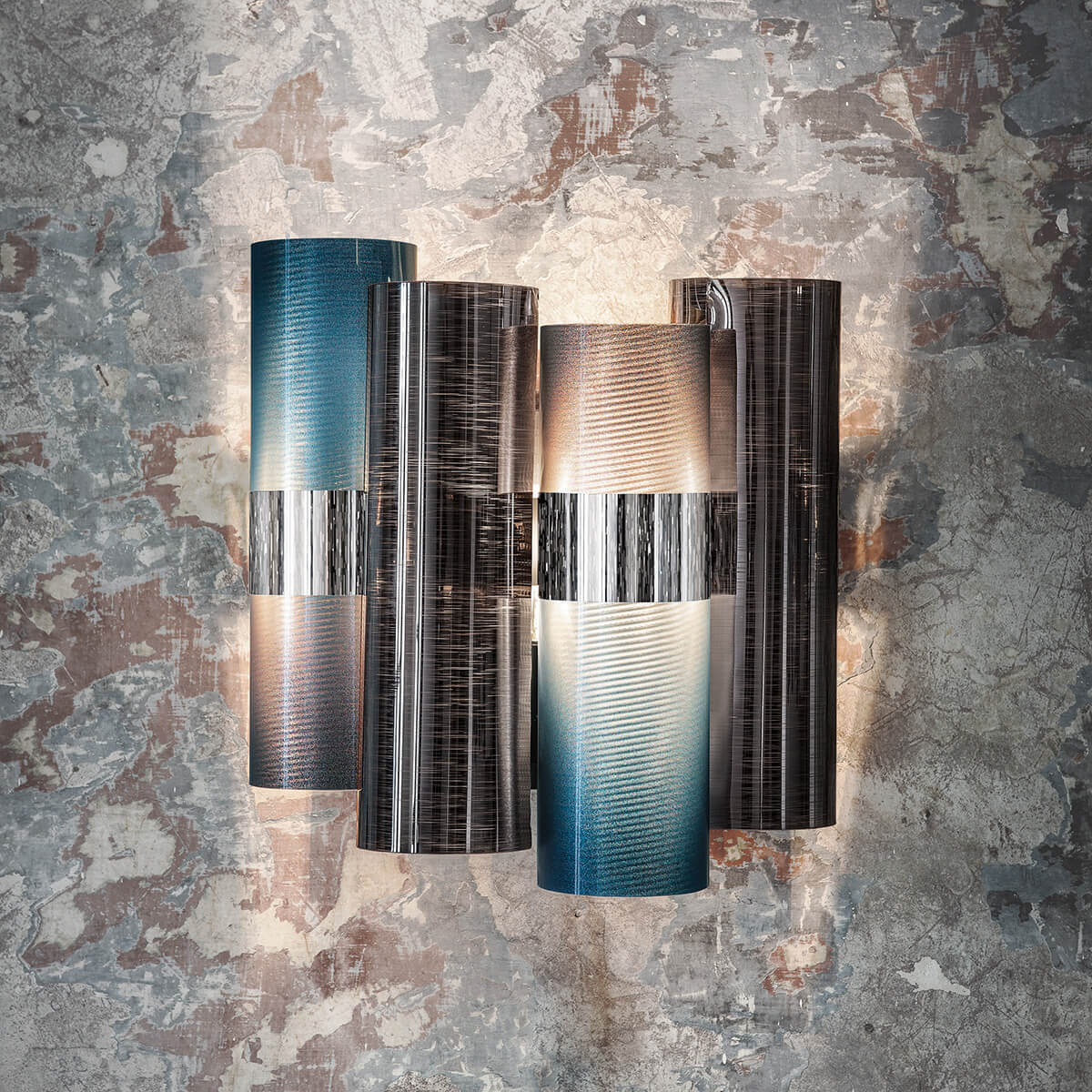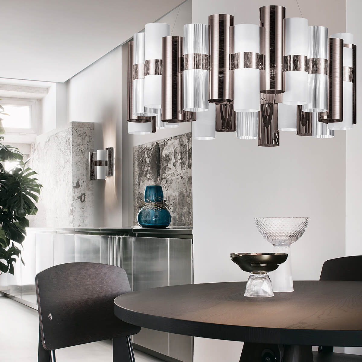 Der Leuchtenkörper besteht aus nebeneinander angeordneten Zylindern aus Opalflex® und Lentiflex®, zwei von Slamp patentierten, aufwendig veredelten Technopolymeren. Die Zylinder sind mit hochwertigen Gradienten-Finishes, Metallisierungen und Folien mit gebürsteten Oberflächen versehen, die zusammen eine vielfältig schimmernde Wirkung kreieren und eine brillante, einzigartige Ästhetik schaffen.