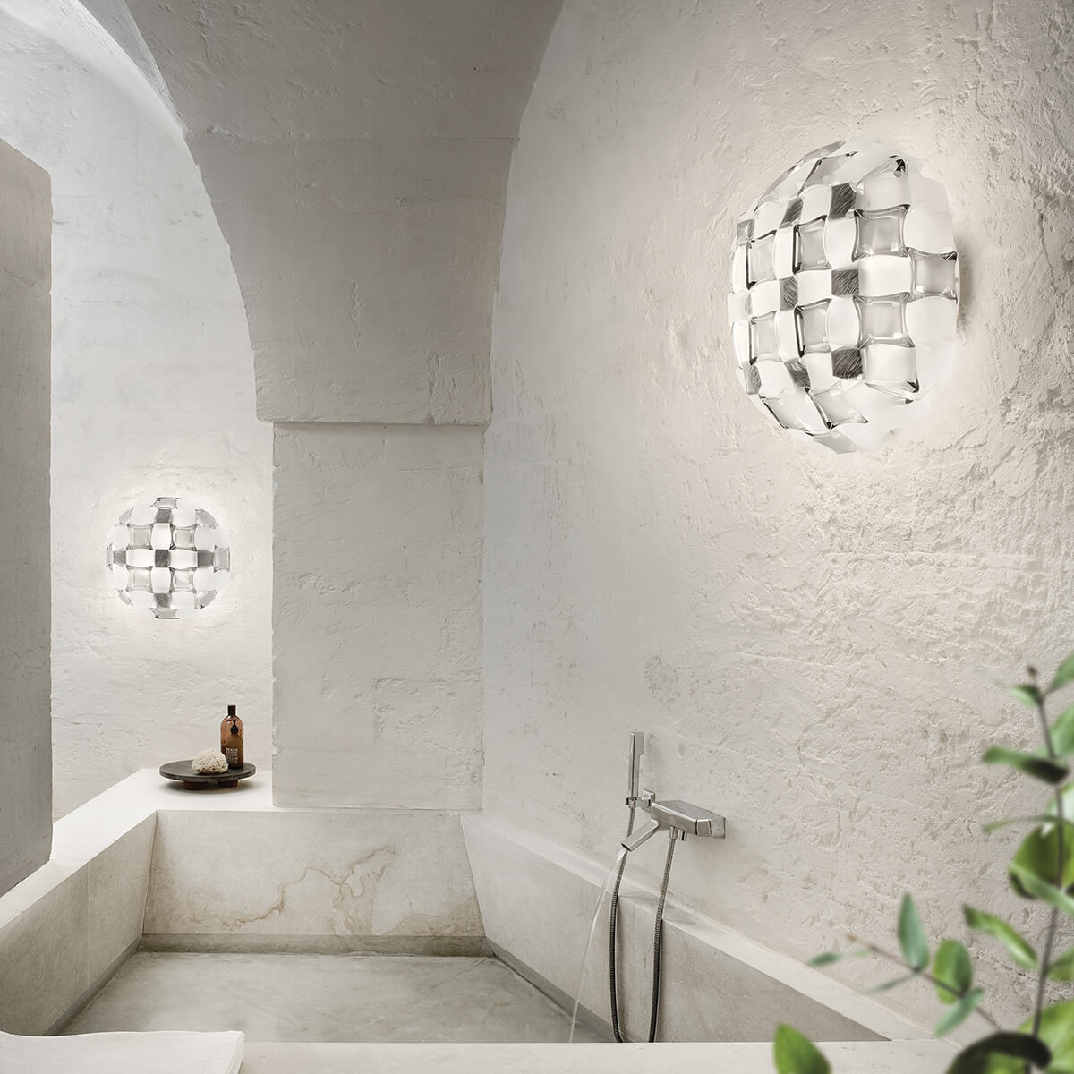 Durch ihre Größe eignet sich die Mida Ceiling / Wall Large besonders gut für öffentliche Innenräume wie Hotellobbys und Lounges, aber auch für großzügige Wohnräume und Flure. Die Lampe spendet ein indirektes und diffuses Licht, das durch einen Pavé aus „Edelsteinen“ aus Slamps patentierten Kunststoffen Lentiflex® und Opalflex® erzeugt wird. Diese Materialien brechen das Licht in einer Weise, die seine Umgebung sanft und einladend erleuchtet und gleichzeitig funkelnde Akzente setzt.