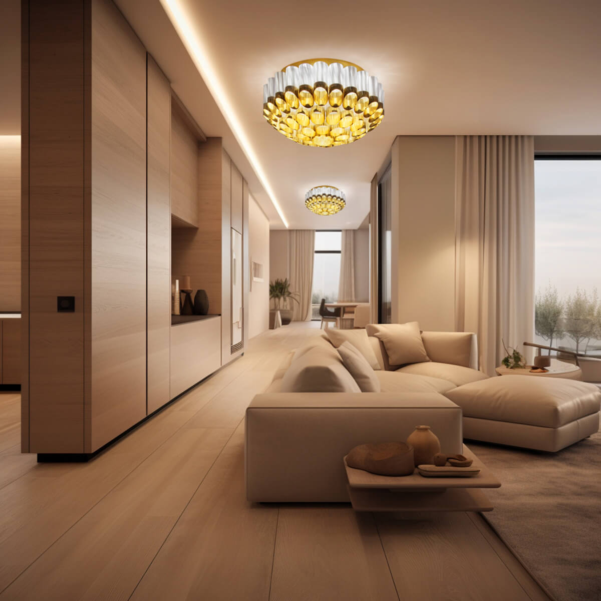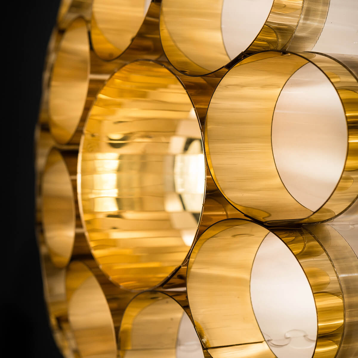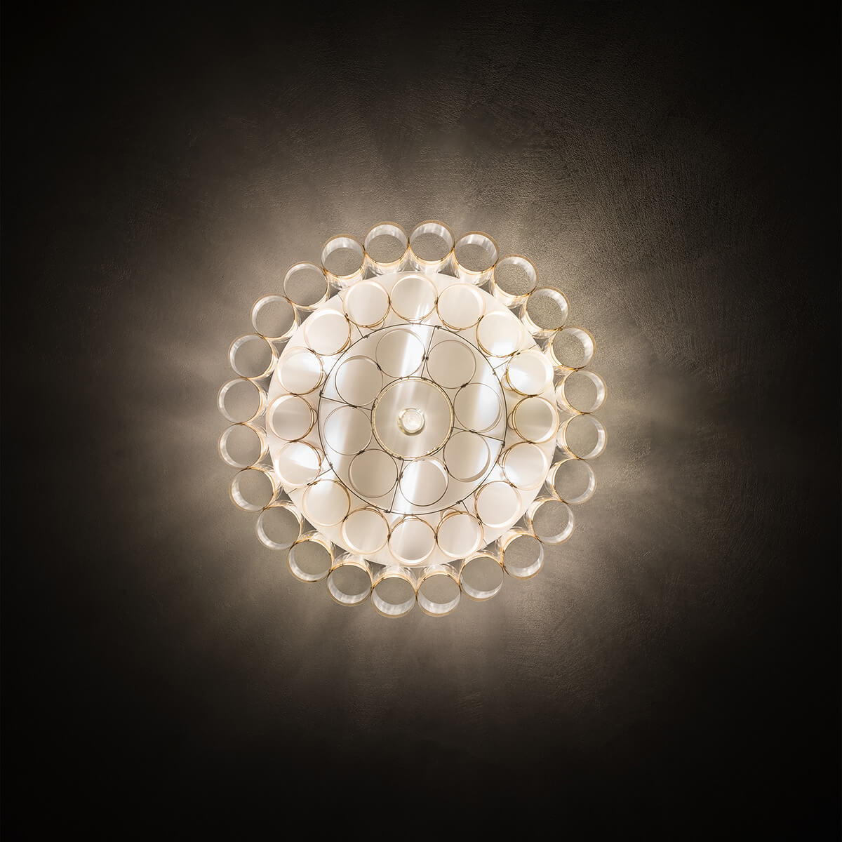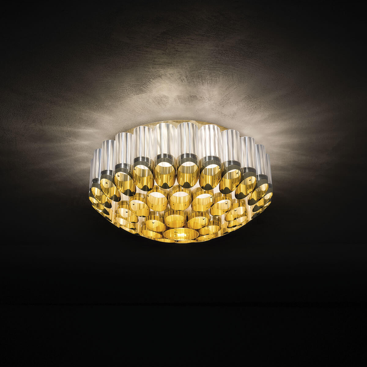 Die Deckenlampe besteht aus kreisförmig angeordneten Zylindern aus metallisiertem Goldflex® und irisierendem Lentiflex®. Diese hochwertigen Kunststoffe, bekannt für ihre glasartigen Eigenschaften, reflektieren das Licht auf spektakuläre Weise und erzeugen einen sanften, schimmernden Glanz, der die Umgebung in ein warmes Licht taucht. Geliefert wird die Lampe komplett montiert in einer Holzschutzverpackung, was die Installation vereinfacht.