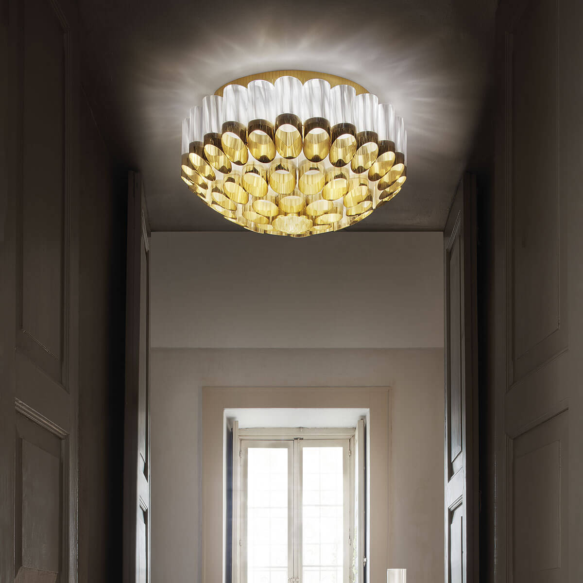 Das szenografische Design der Odeon Ceiling macht sie zu einer idealen Lichtquelle für Wohnräume, Flure, Restaurants, Lounges und Lobbys, wo sie nicht nur beleuchtet, sondern auch als betörender Blickpunkt fungiert. Der Name der Lampe leitet sich vom griechischen Wort Ωδείον ab, was einen Ort für musikalische Darbietungen bezeichnet und die kulturelle Tiefe dieses Beleuchtungsobjekts widerspiegelt.