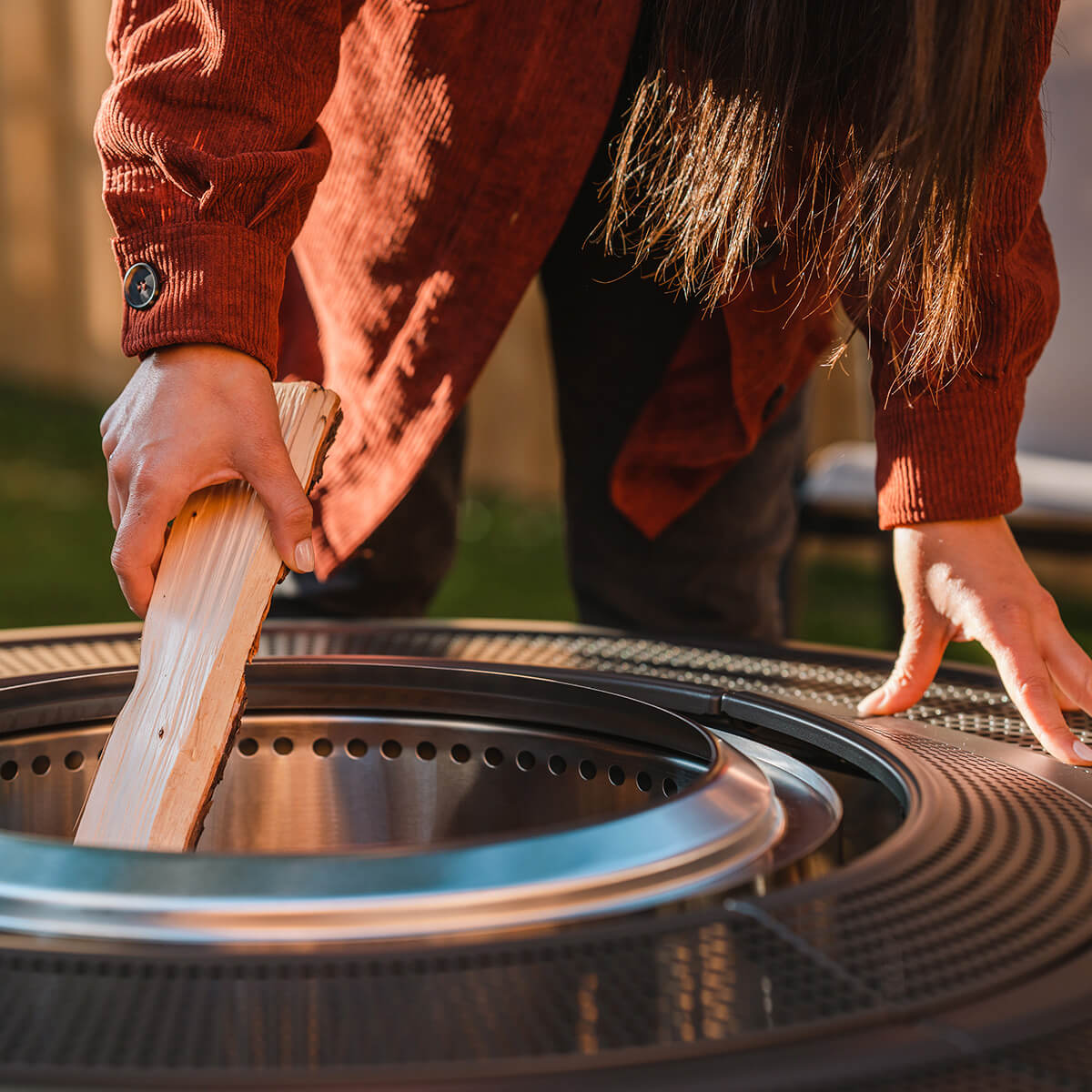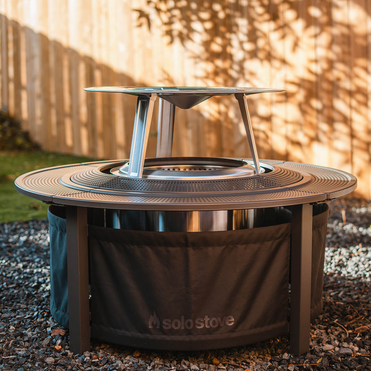 Der Feuerschalentisch ist so konzipiert, dass Sie selbst dann, wenn der Tisch die Feuerstelle aufgenommen hat, sämtliches Feuerschalen-Zubehör von Solo Stove nutzen können. Ob Grillplatten, Grillspieße oder Funkenschutz, auch mit dem Surround können Sie das volle Potenzial Ihrer Feuerschale ausschöpfen. Bitte beachten Sie jedoch, dass der Wärmeverteiler nur mit den längeren Beinen genutzt und der Standfuß nicht zusammen mit dem Surround verwendet werden sollte, um die Sicherheit und Integrität des Tisches zu gewährleisten.