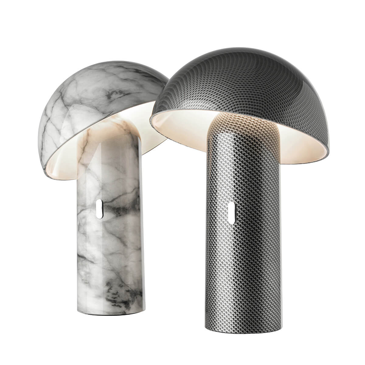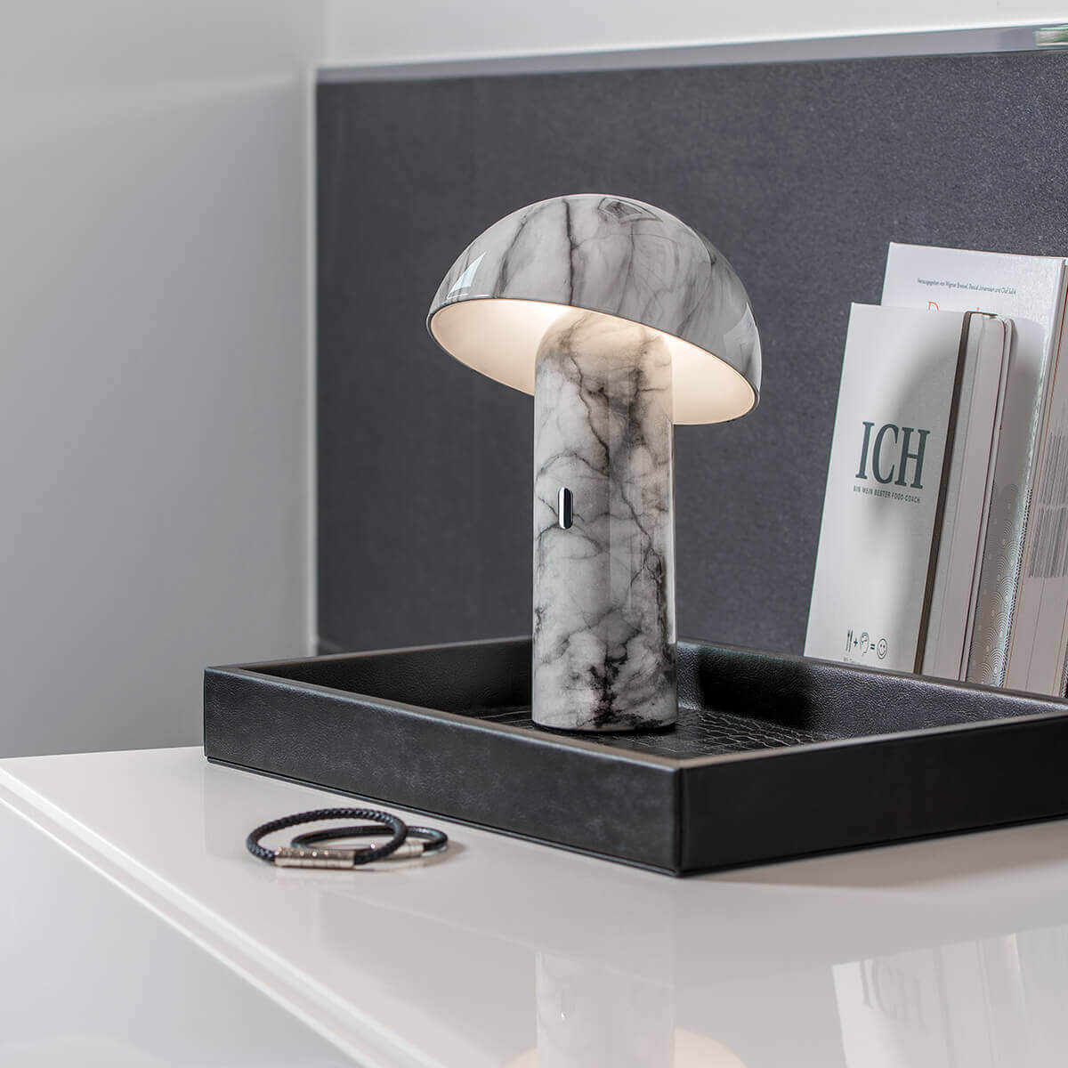Gefertigt ist die Svamp Akku-Tischlampe aus hochwertigem Kunststoff mit fein glänzendem oder mattem Finish. Während die unifarbenen Versionen den zeitlosen Charakter des Designs unterstreichen, avancieren die Modelle mit ausgefallenen Musterdrucken wie Marmor oder Carbon zu originellen Blickpunkten Ihrer Einrichtung.