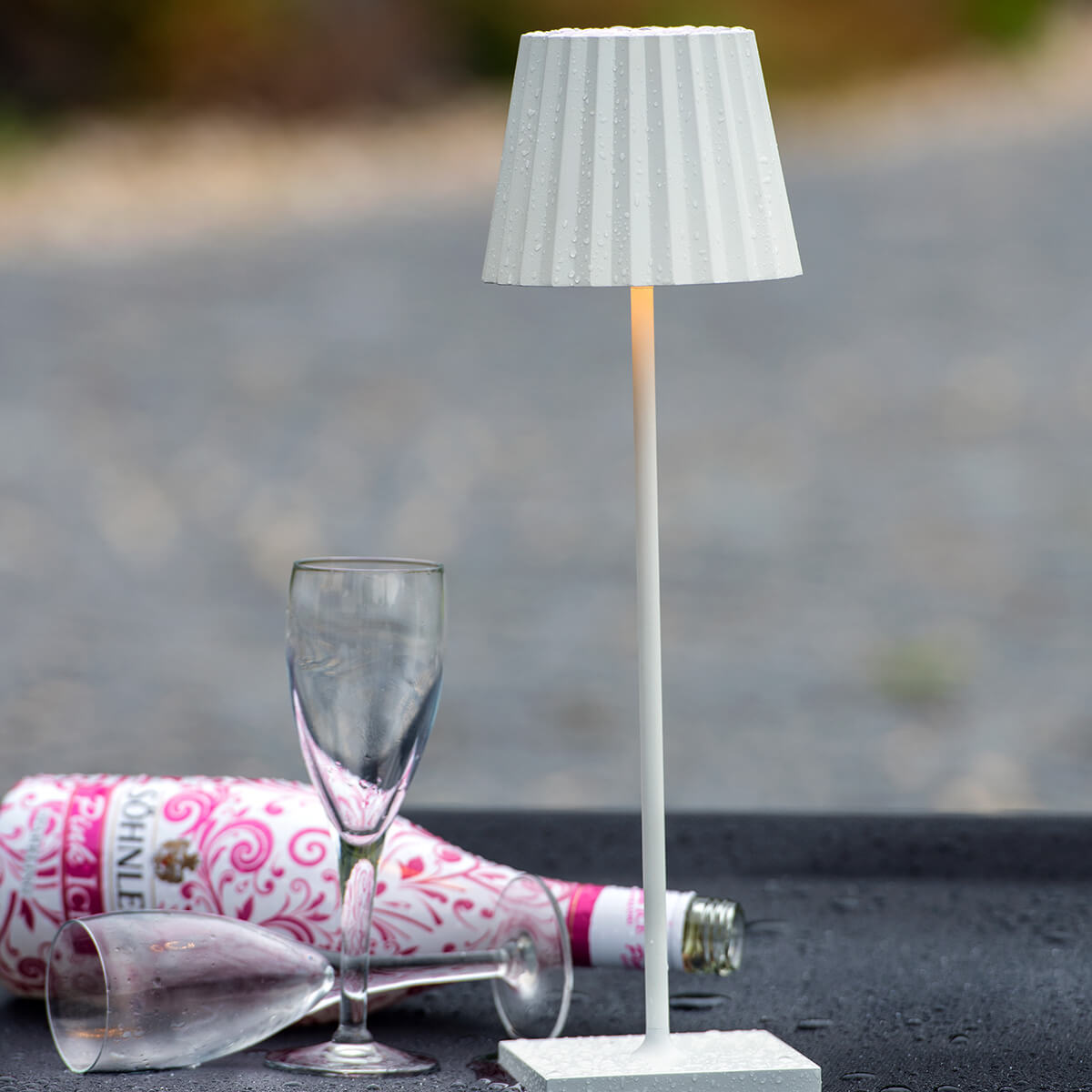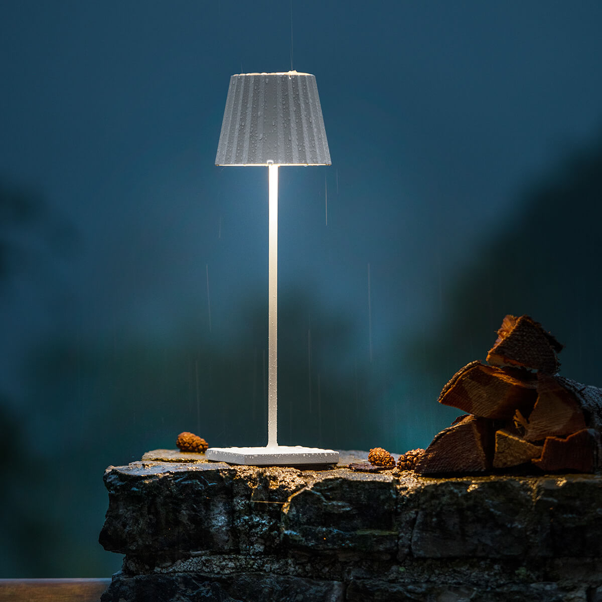 Die Troll RC LED Akkuleuchte von Sompex verbindet dekoratives Design mit moderner Lichttechnik und sorgt überall dort für Stimmung, wo Sie es sich wünschen. Ihr charakteristischer Plissee-Schirm verleiht der Tischlampe eine charmante, fast textile Wirkung – ein Blickfang, der klassische Eleganz mit zeitgemäßem Minimalismus kombiniert. Gefertigt aus hochwertigem Aluminium und ausgestattet mit der Schutzart IP54, ist die Troll RC sowohl für den Innenraum als auch für den geschützten Außenbereich geeignet.