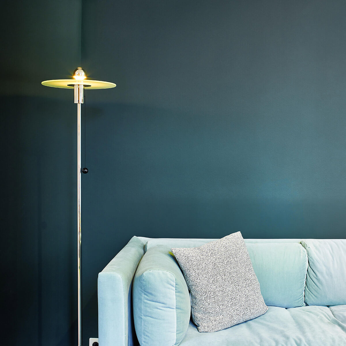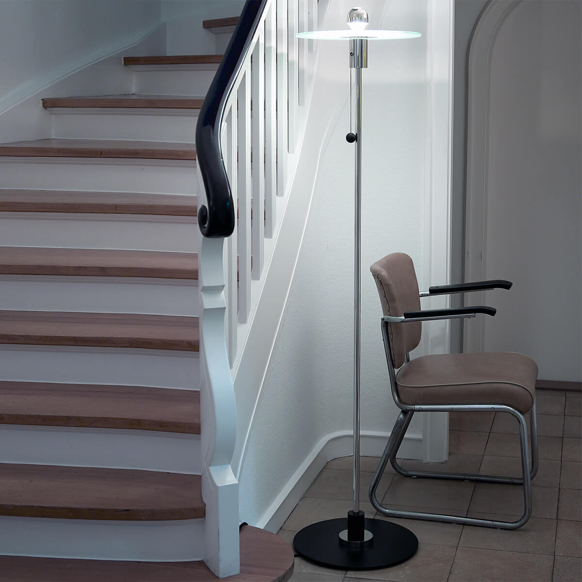 Bitte beachten Sie, dass die glanzvernickelte Metallstruktur der BST 23 Bauhaus Stehleuchte mit der Zeit eine silbrige Patina ausbilden kann. Dies ist kein Zeichen von mangelnder Qualität, sondern ein natürlicher Prozess, der sogar ästhetischen Reiz hat. Möchten Sie die glanzvolle Oberfläche der Lampe beibehalten, empfiehlt sich die Reinigung mit einer Politur ohne Schleifzusätze.