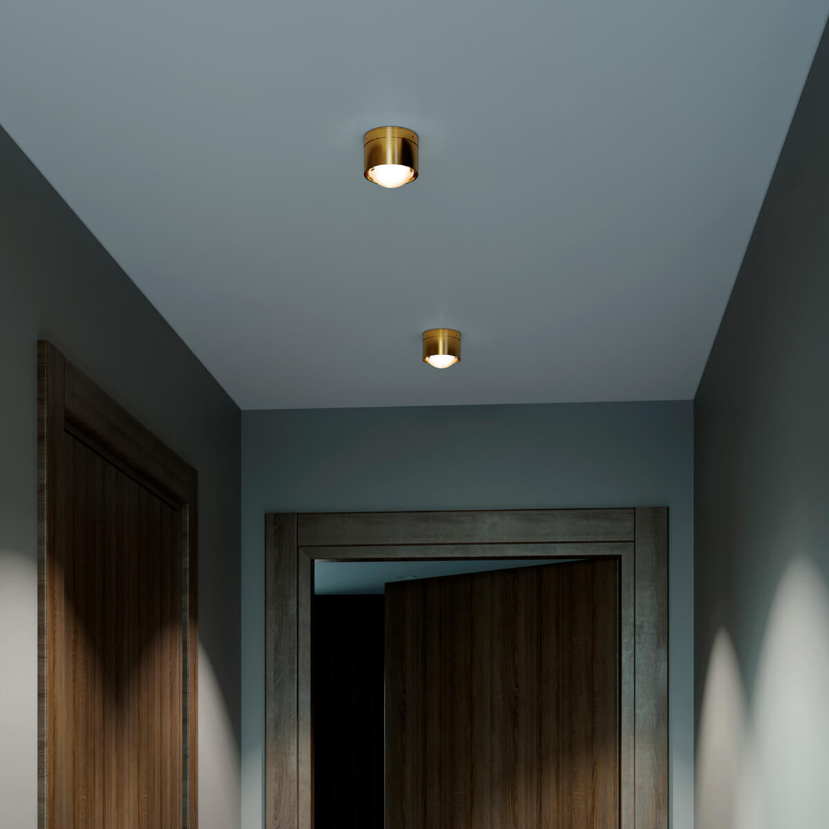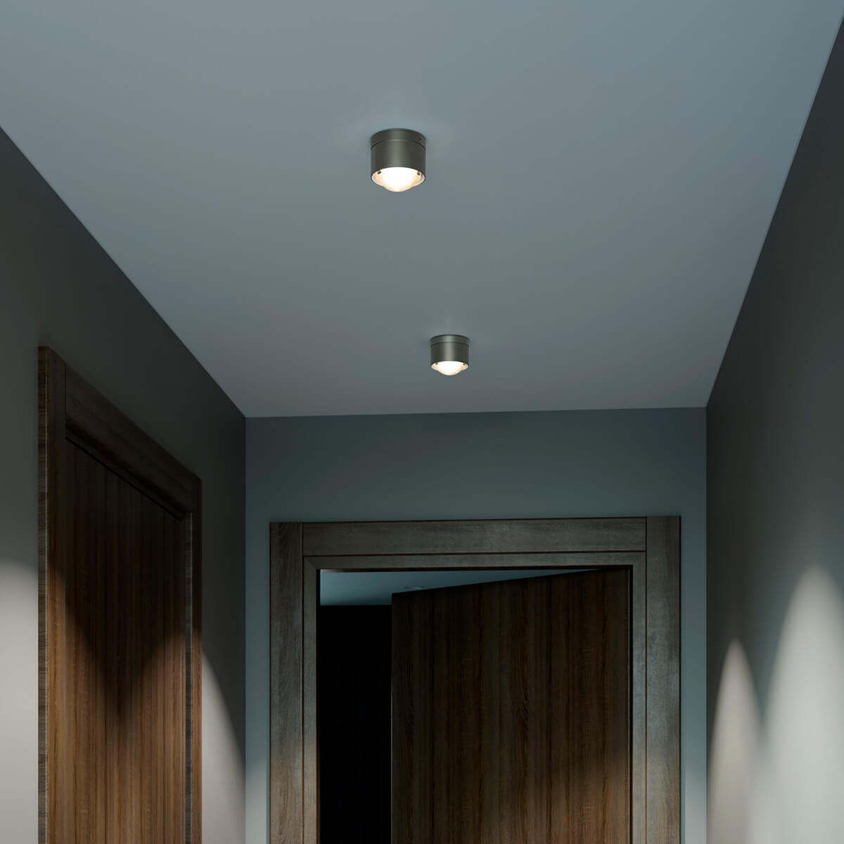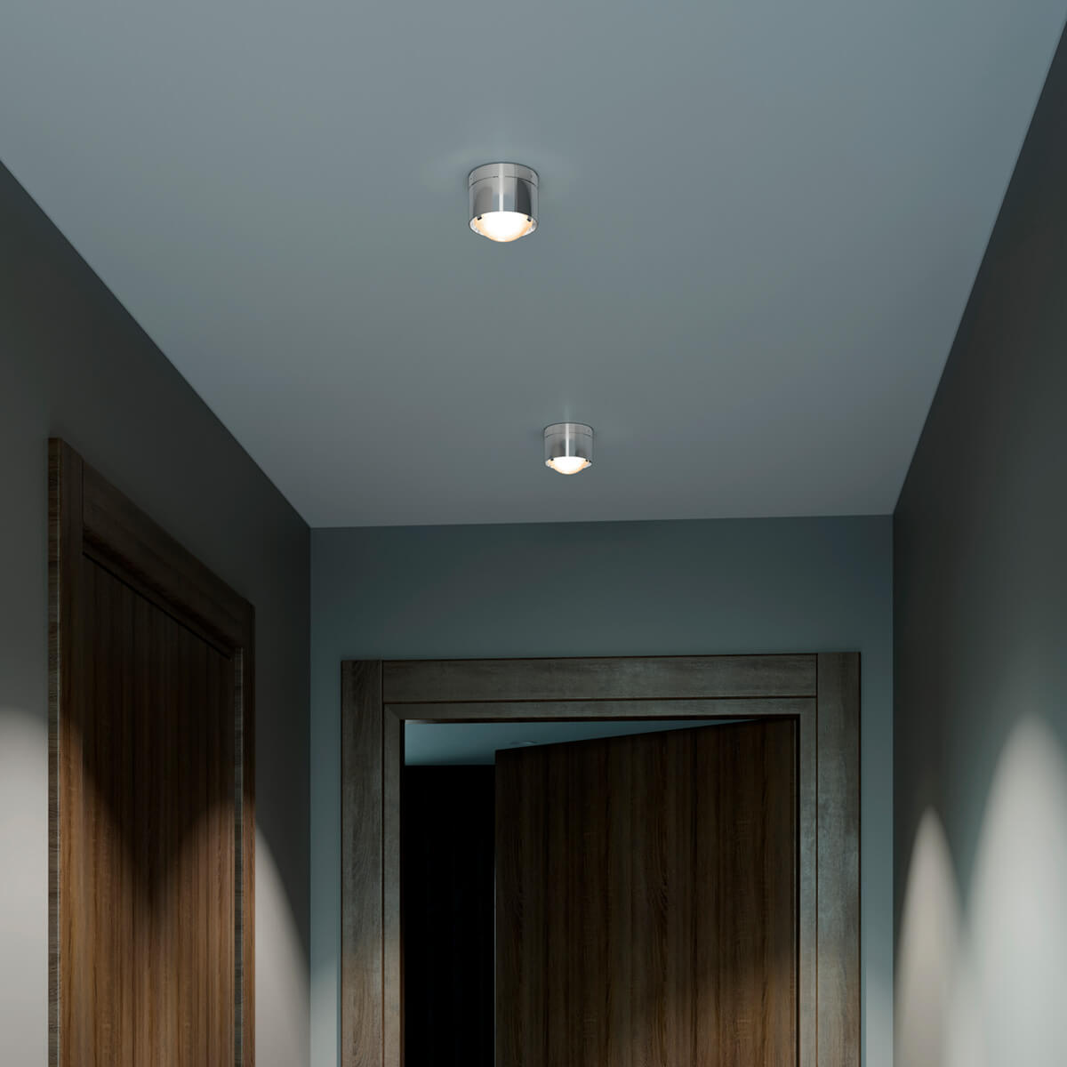 A special feature is its modular design. A sophisticated spring system allows different lenses and glass shades to be used, enabling the light characteristics to be specifically modified. Clear lenses produce precise, sharply contoured cones of light that emphasize surfaces in a structured way. Frosted versions ensure soft transitions and a more comfortable atmosphere, while satin-finished glass diffuses the light and illuminates the room evenly. This allows the ceiling lamp to adapt flexibly to different usage situations.