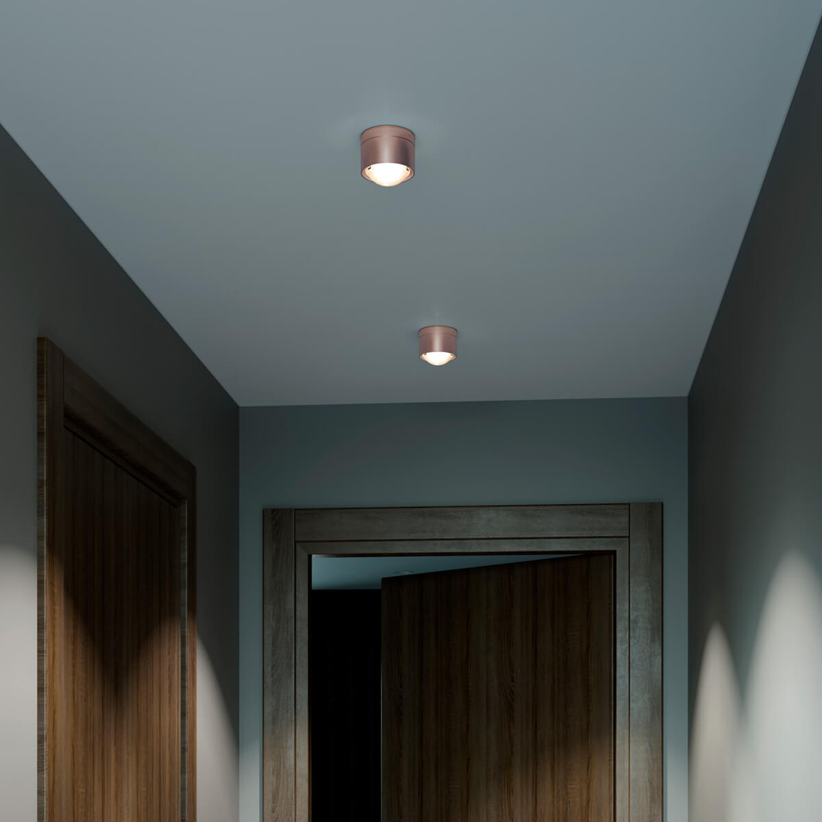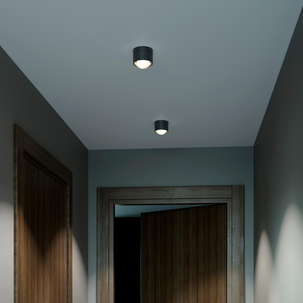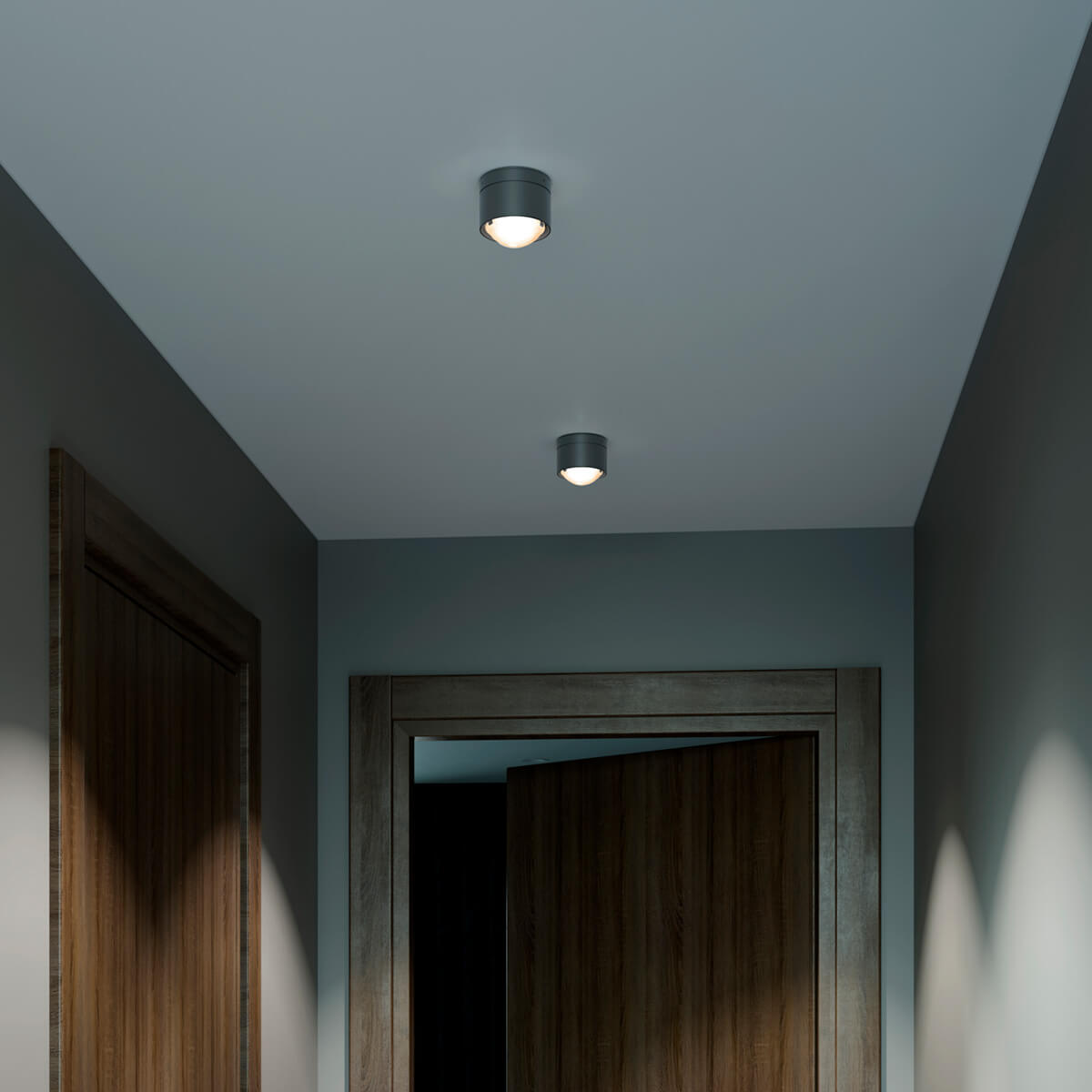 A special feature is its modular design. A sophisticated spring system allows different lenses and glass shades to be used, enabling the light characteristics to be specifically modified. Clear lenses produce precise, sharply contoured cones of light that emphasize surfaces in a structured way. Frosted versions ensure soft transitions and a more comfortable atmosphere, while satin-finished glass diffuses the light and illuminates the room evenly. This allows the ceiling lamp to adapt flexibly to different usage situations.