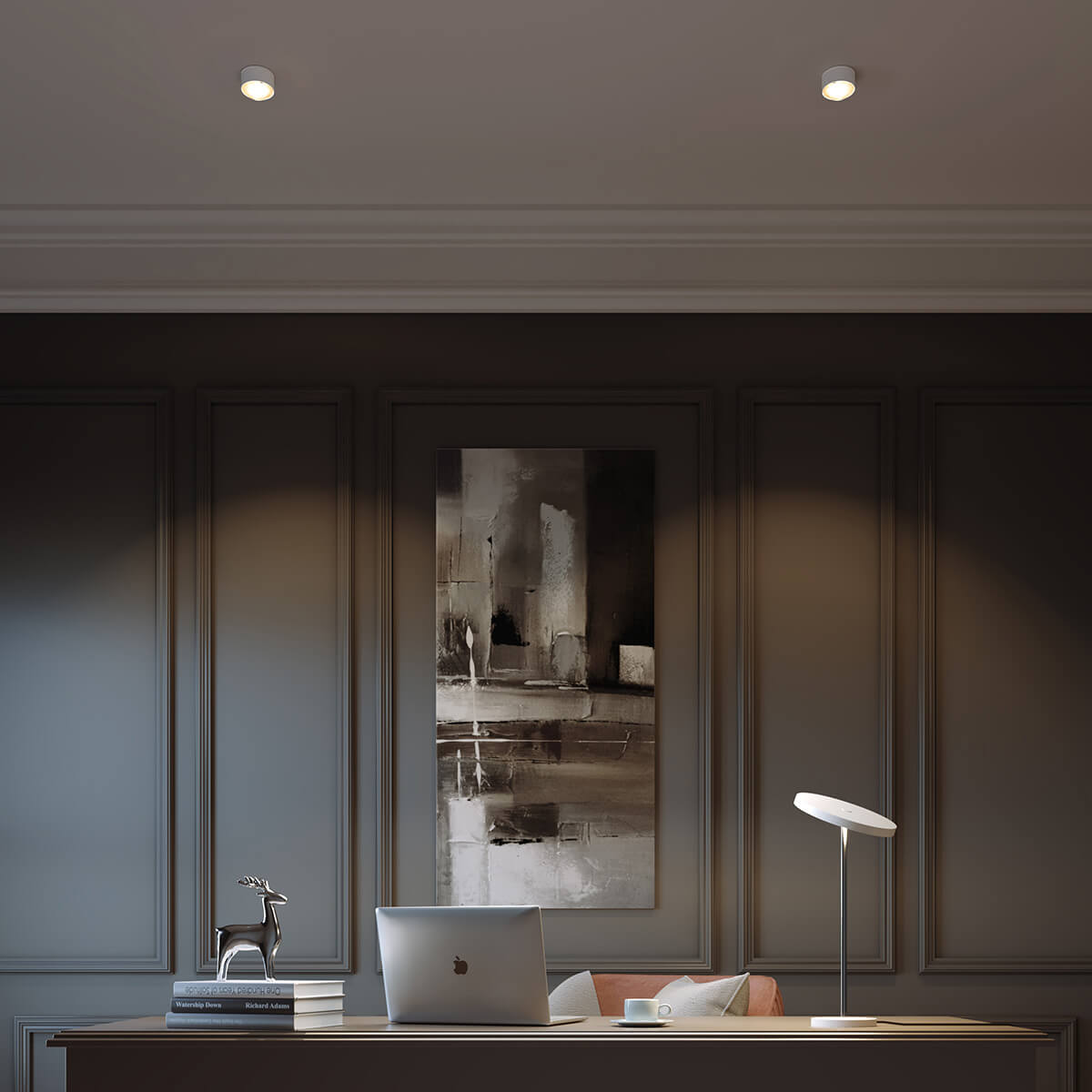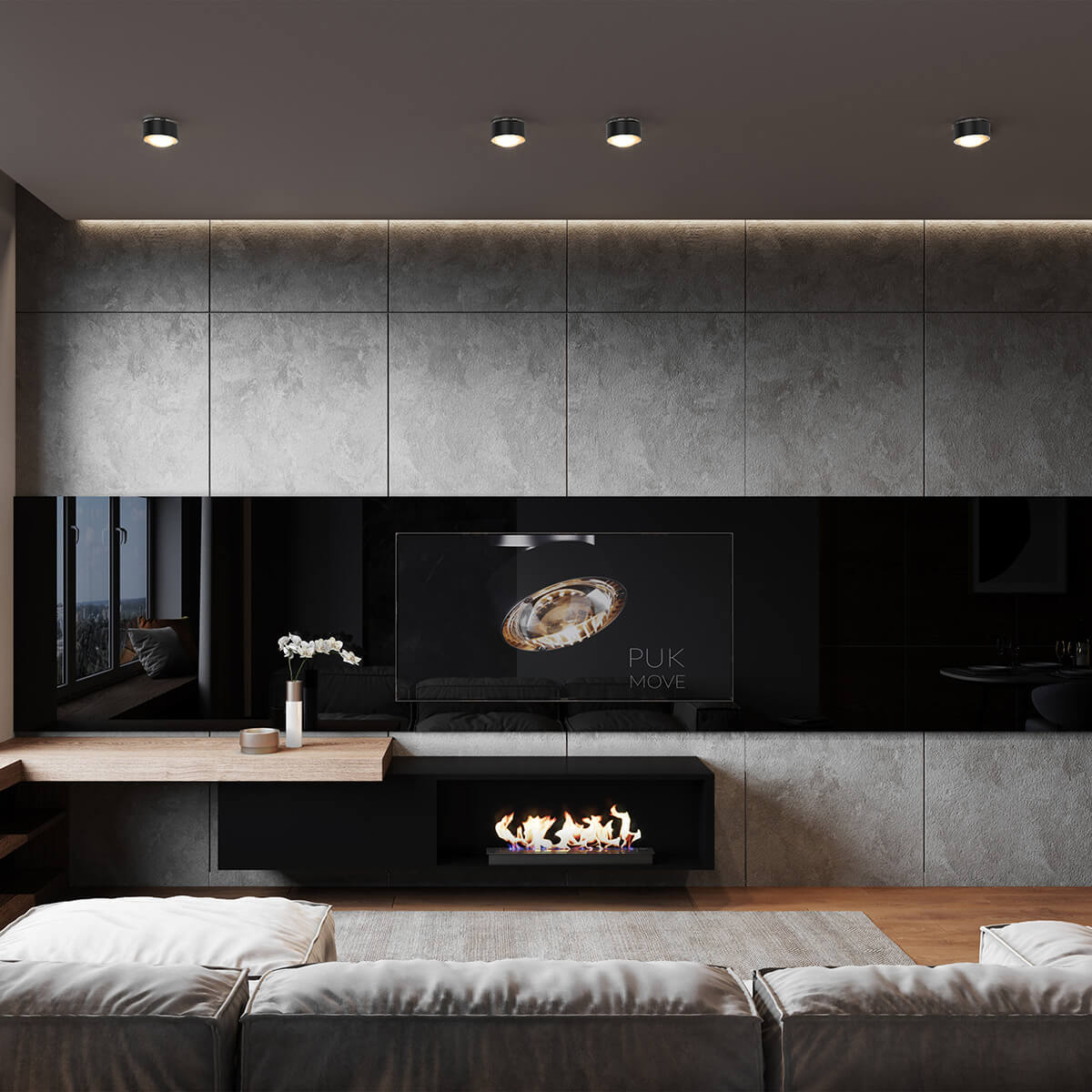 Das Besondere an dieser Deckenlampe ist ihre Konfigurierbarkeit: Durch den Einsatz verschiedener Linsen und Farbfilter lässt sich die Lichtwirkung gezielt verändern. Die klare Puk Maxx Linse erzeugt einen präzisen, scharf abgegrenzten Lichtkegel – ideal, um einzelne Bereiche oder Objekte gezielt in Szene zu setzen. Wer hingegen eine weichere, diffusere Beleuchtung bevorzugt, wählt die matte Puk Maxx Linse, die das Licht gleichmäßig streut und so eine behagliche Atmosphäre schafft.