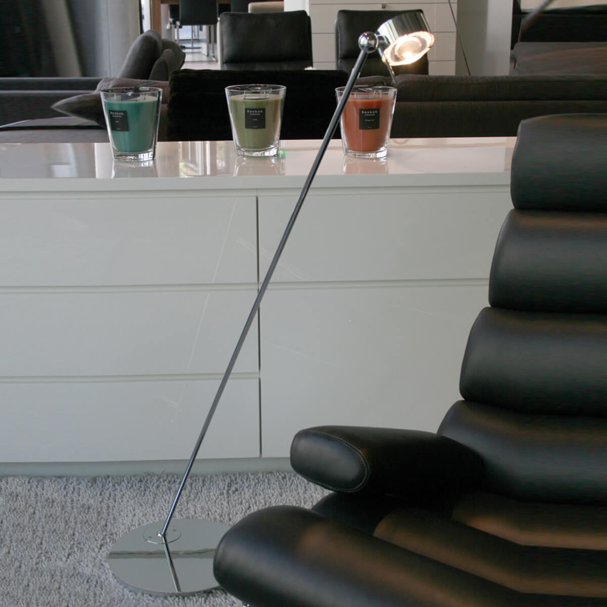 Die Stehlampe lässt sich individuell bestücken: Unterschiedliche Einsätze, die als Zubehör erhältlich sind, erzeugen verschiedene Lichtwirkungen. Klare Linsen projizieren präzise Lichtkegel, während satinierte Gläser ein weiches, diffuses Licht erzeugen. Wer einen einseitigen Lichtaustritt bevorzugt, kann den Kopf mit einem lichtundurchlässigen Aluminiumreflektor ausstatten. Für stimmungsvolle Lichtakzente sorgen optionale Farbfilter, die das indirekte Licht aufwerten und eine besondere Atmosphäre schaffen.
