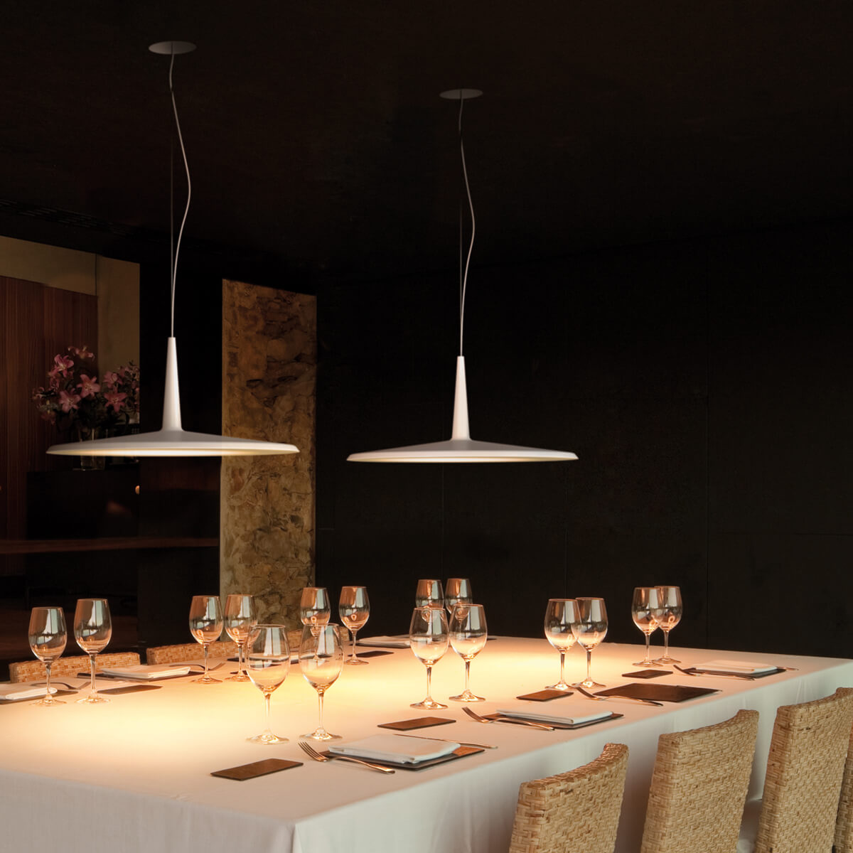 Dank ihrer reduzierten Form lässt sich die Skan 0275 sowohl als elegante Einzelleuchte als auch in mehrflammigen Arrangements einsetzen. Besonders in Cluster-Installationen über langen Tischen oder Theken entstehen rhythmische Lichtlandschaften mit skulpturalem Charakter. So definieren Sie Räume nicht nur funktional, sondern auch gestalterisch.