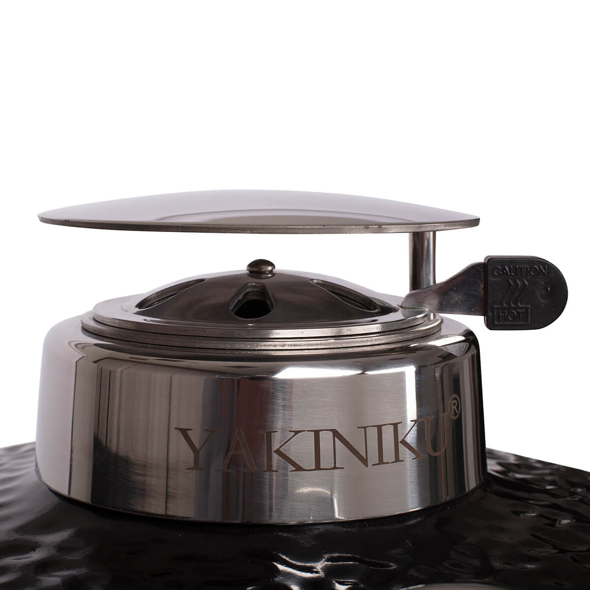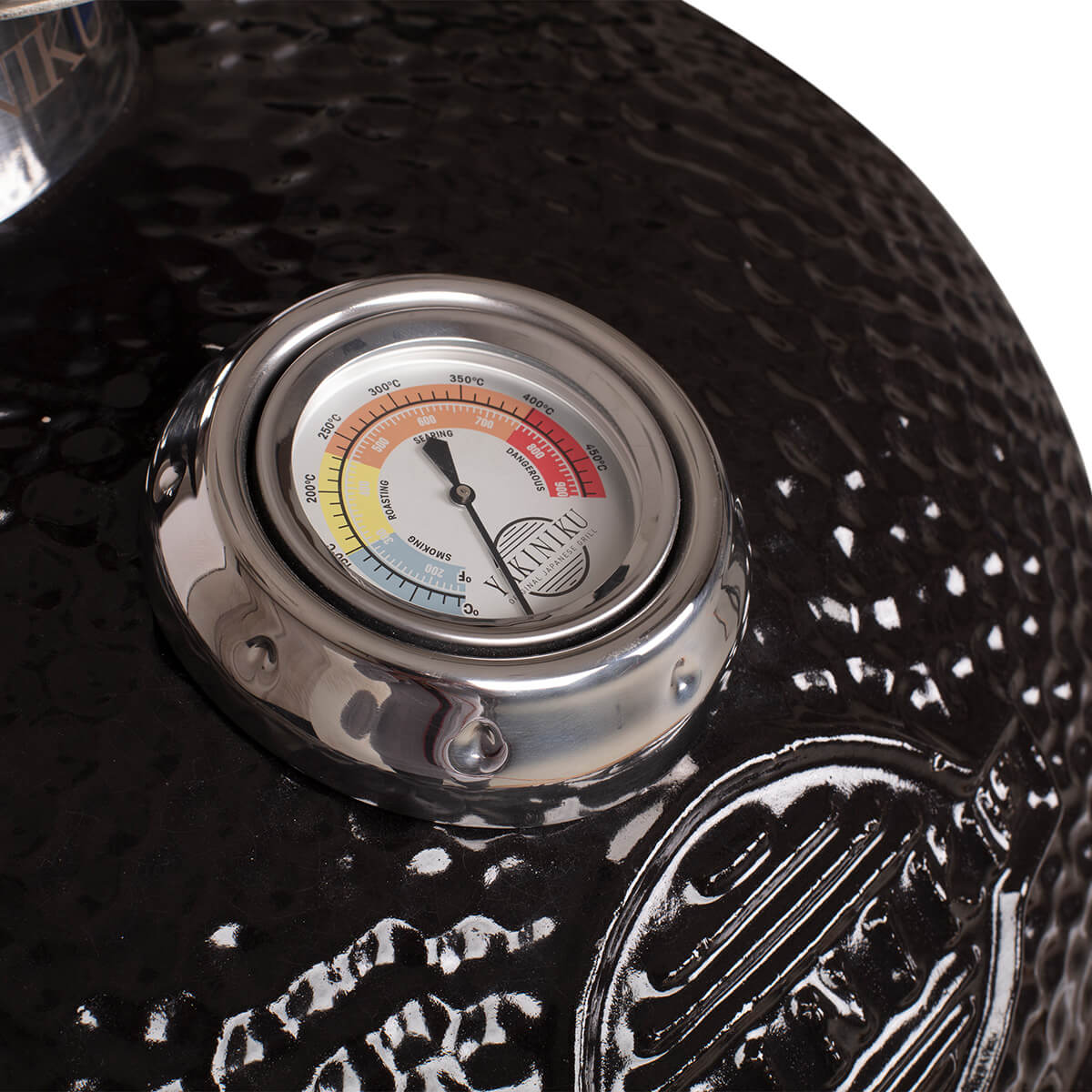 Die Gartemperatur haben Sie mit dem Thermometer im Deckel stets genauestens im Blick. Zudem verfügt der Yakiniku Kamado über solide Federgelenke aus Edelstahl, die den massiven Deckel, wenn geöffnet, sicher in Position halten und ein versehentliches Zuschlagen verhindern. Das rollbare Edelstahlgestell macht es ein Leichtes, den Grill zu bewegen.