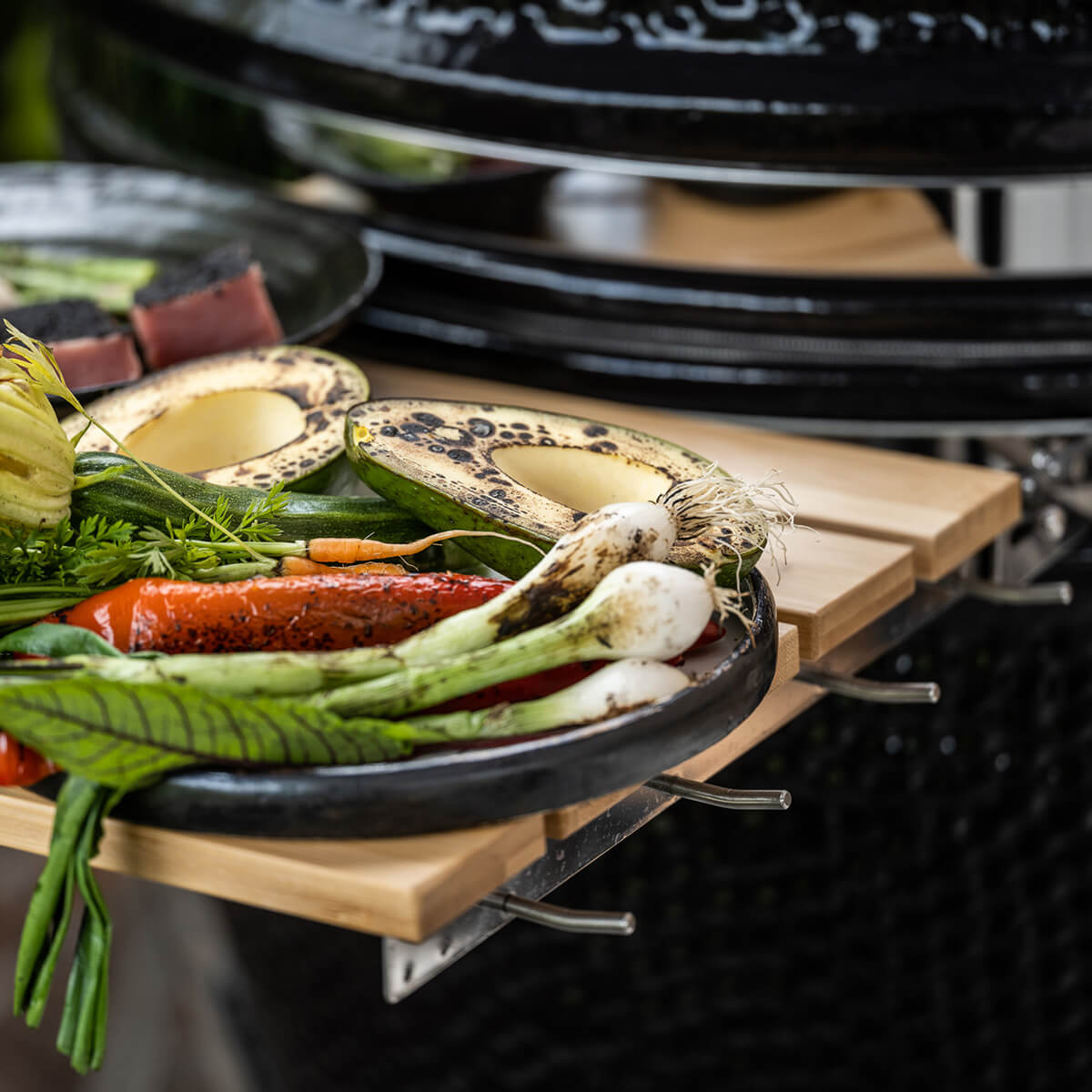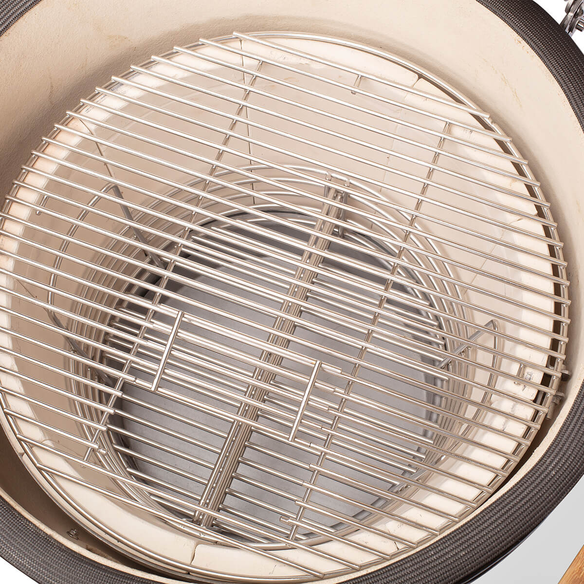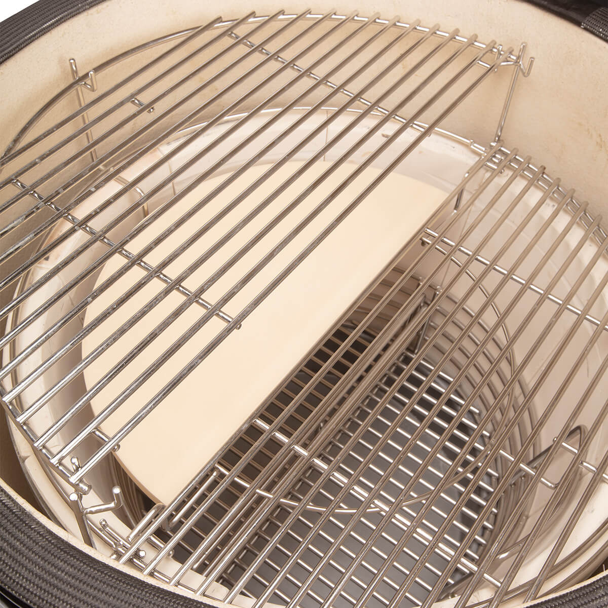 Geliefert wird der Yakiniku Kamado inklusive Pro Set. Dieses umfasst eine Multilevel-Erhöhung, zwei Halbmond-Hitzedeflektoren und zwei Halbmond-Grillroste. Die Einsätze erlauben das Grillen auf verschiedenen Ebenen und bieten somit zusätzliche Flexibilität. Beispielsweise können Sie ein Stück Fleisch auf der einen Seite anbraten und zugleich auf der anderen Seite weitergaren lassen, um die perfekte Zubereitung zu erreichen.