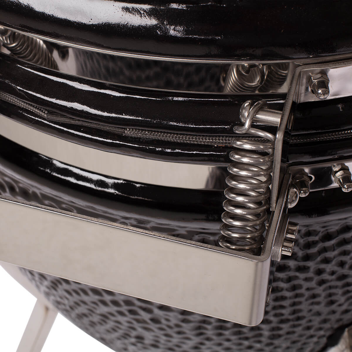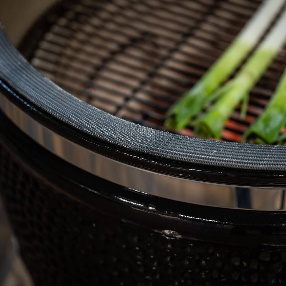 Jeder Kamado wird von Hand gefertigt und in einem speziellen Verfahren mit Quarz und Cordierit veredelt, bevor er bei 1.600 °C im Hochofen gebrannt wird. Der verbaute Edelstahl ist von der Sorte 304, bekannt für seine hohe Korrosionsbeständigkeit, Hitzeresistenz und nichtrostenden Eigenschaften. Die Dichtungen bestehen aus hochwertigem Fiberglas und stellen sicher, dass die Grillkammer hermetisch abgeschlossen ist.