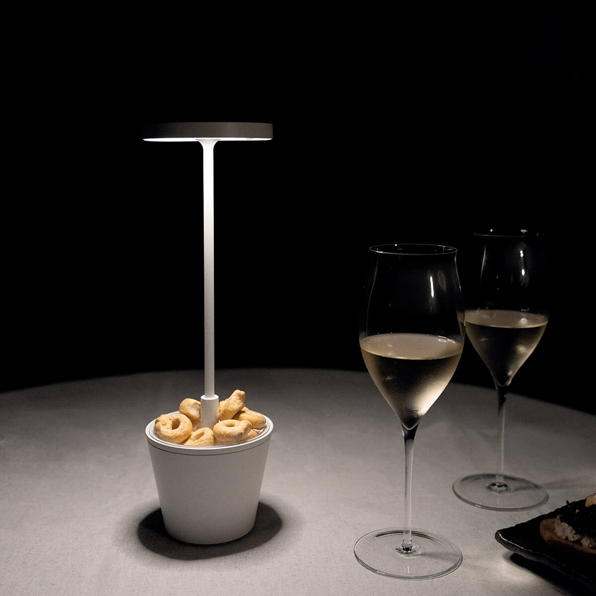 Ob dekorative Kostbarkeiten, Stifte oder Blumen – die Basis bietet Platz für die schönen und praktischen Dinge des Alltags. Der integrierte Behälter mit einer Kapazität von 18 cl ist herausnehmbar und einfach zu säubern. Er besteht aus thermoplastischem Harz und ist auch für den Kontakt mit Nahrungsmitteln geeignet. Warum also nicht die Poldina Reverso mit Pralinen und anderen Köstlichkeiten befüllen? Als dekorative Lichtquelle "versüßt" sie garantiert jedes Dinner und Brunch.