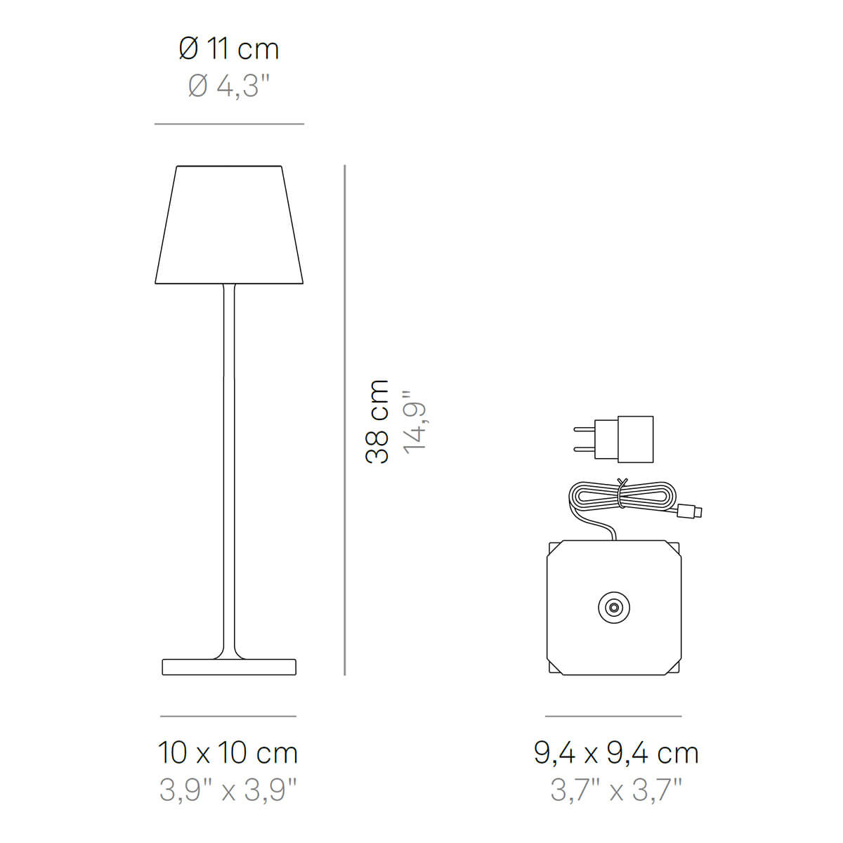 Der in der Poldina Pro verbaute Akku verspricht Energie für bis zu 12 Stunden Licht (bei 100 % Lichtleistung). Ist die Energie versiegt, können Sie die Tischleuchte mithilfe der mitgelieferten Einzel-Kontaktladestation wieder aufladen. Übrigens funktioniert die Lampe auch dann, wenn sie an die Ladestation angeschlossen ist. Haben Sie diese gerade nicht zur Hand, lässt sich alternativ ein zertifiziertes Aufladegerät mit max. 5V DC/1A verwenden.