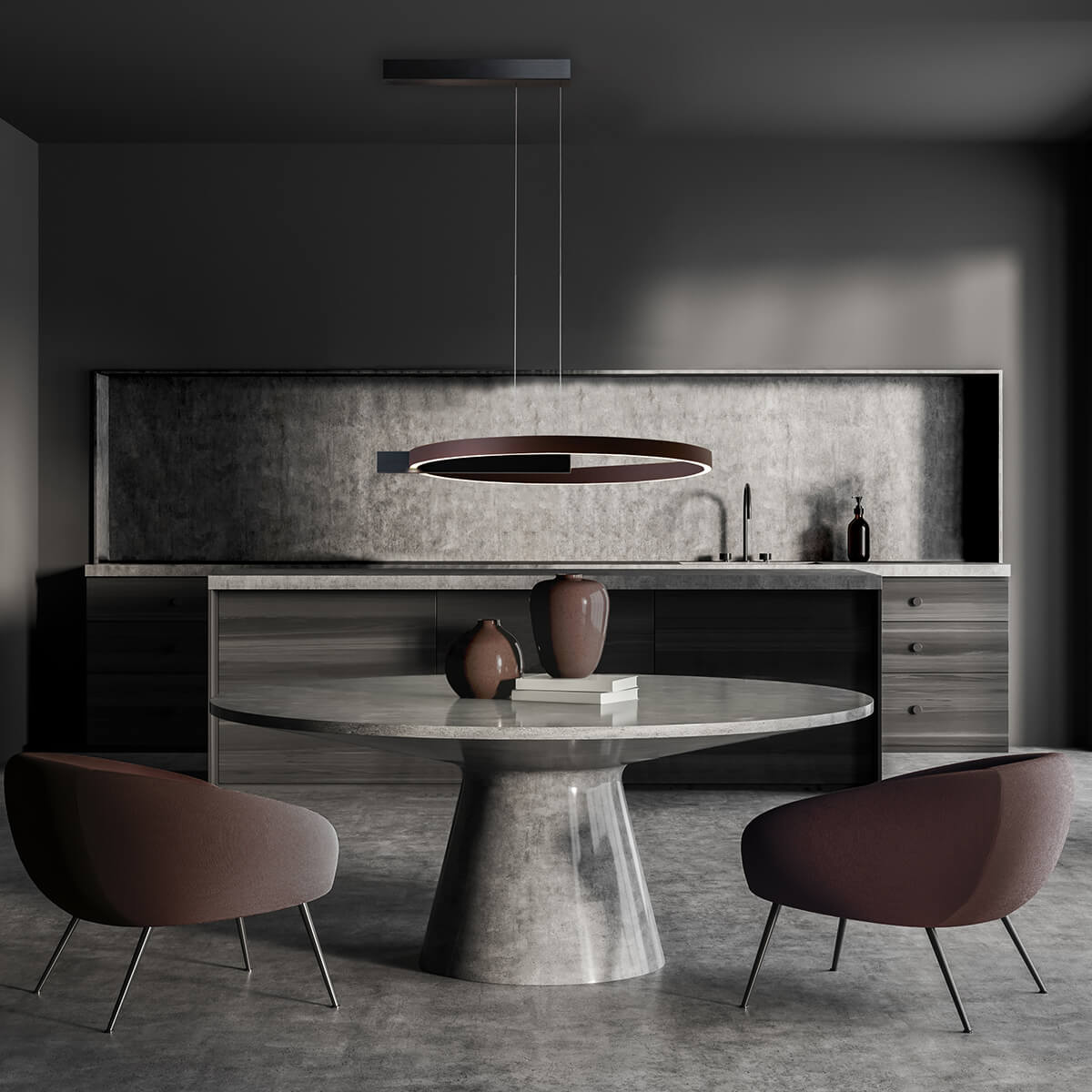 Die Midnight Single LED Pendelleuchte von Escale mit einem Durchmesser von 60 cm vereint zeitlose Formgebung mit innovativer Lichttechnologie und wird so zum stilprägenden Element moderner Wohn- und Essbereiche. Der großzügige Leuchtring scheint nahezu im Raum zu schweben und entfaltet eine beeindruckende Präsenz – ideal über runden Esstischen, in offenen Wohnküchen oder in repräsentativen Bereichen von Hotels, Restaurants und Büros.