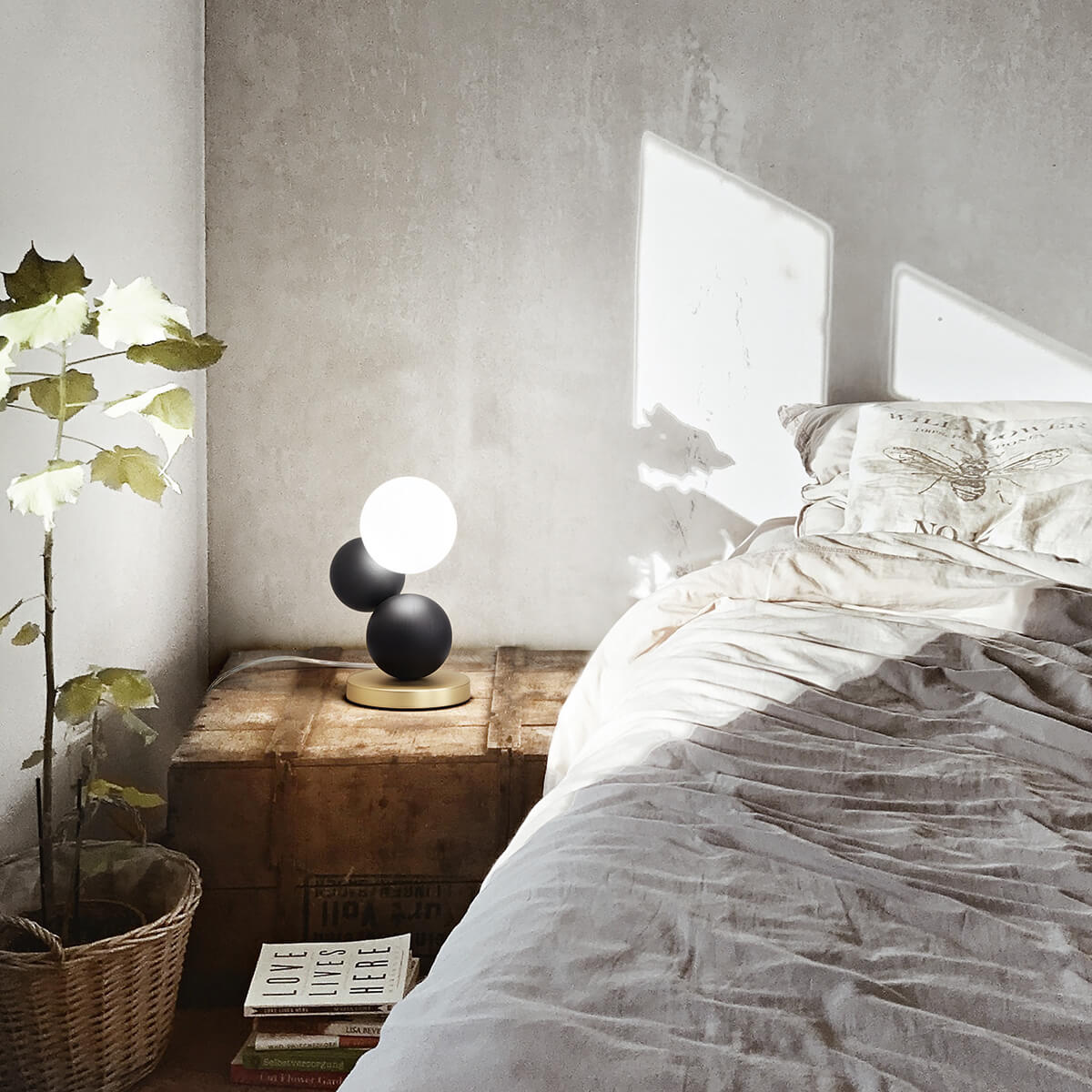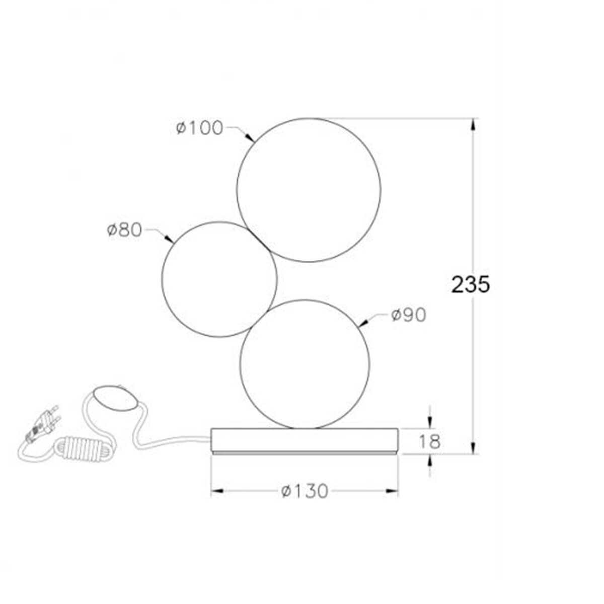 - Raffinierte Tischleuchte mit drei Kugeln, die leicht versetzt zueinander angeordnet sind