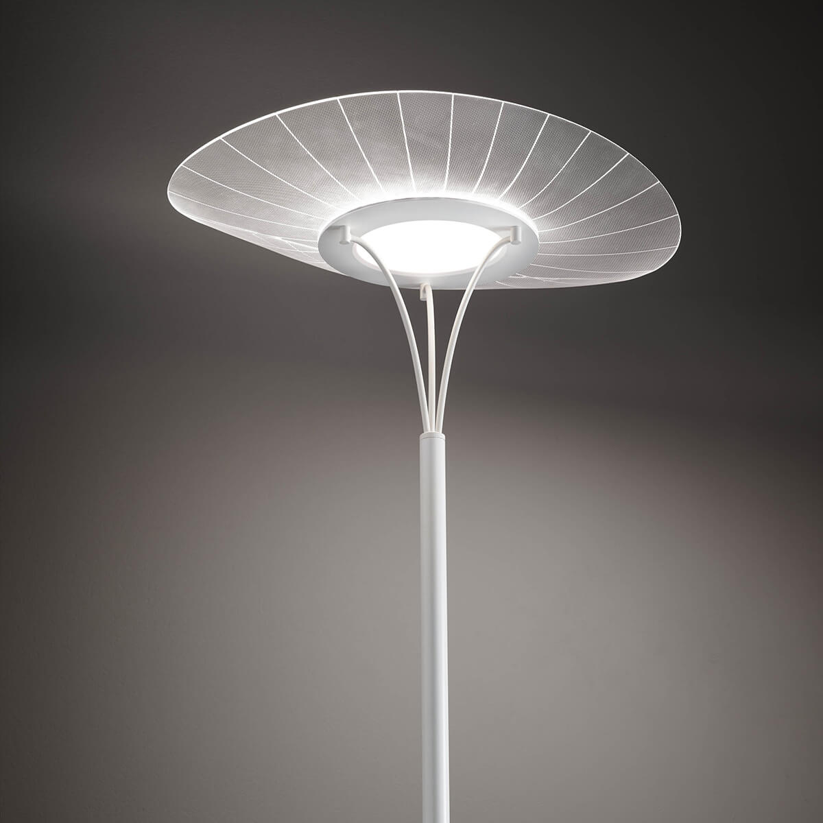 Besondere Energieeffizienz verspricht die verbaute LED-Lichtquelle, die ihr Licht nach oben entlässt und den Raum auf diese Weise mit weich fallendem, blendfreiem Licht erhellt. Ein gewisser Lichtanteil erstrahlt über die zentrale Lichtquelle zudem nach unten hin, sodass der Metallfuß der Lampe effektvoll hervorgehoben wird.