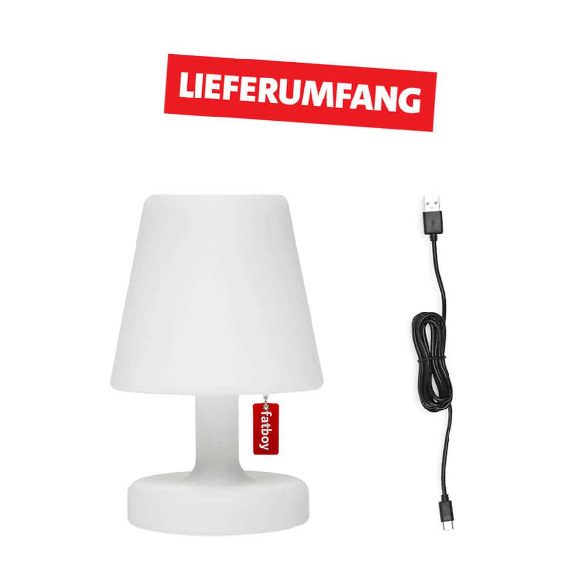 Die Edison the Petit ist eine tragbare Tischleuchte mit eingebautem Akku, die Ihnen volle Freiheit bei der Platzierung lässt. Laden Sie sie bequem per USB-C-Anschluss auf (passender Fatboy USB-Adapter 5V 1A und Ladekabel inklusive) und genießen Sie bis zu 24 Stunden kabelloses Licht – mobil, jederzeit einsatzbereit, drinnen wie draußen.