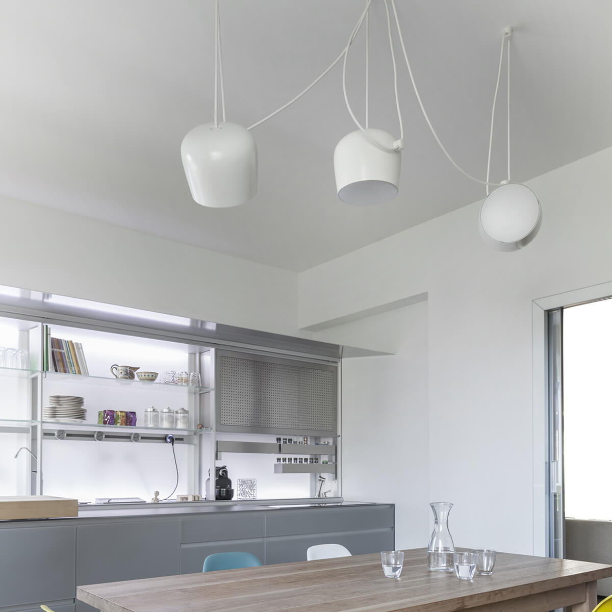 Einen grafisch anmutenden Touch in der Lichtkomposition und zugleich höchste Funktionalität bietet die Flos Aim LED Pendelleuchte in 3-flammiger Ausführung. Die drei Leuchtkörper lassen sich einfach mit der Vielfachrosette verbinden, sodass Sie nur einen einzigen Anschluss für mehrere Lampen benötigen.