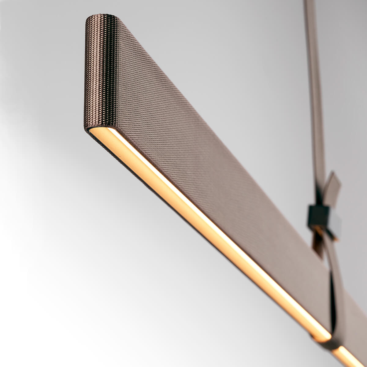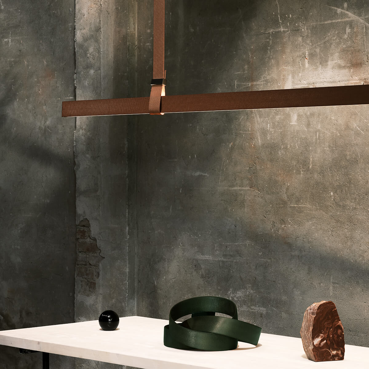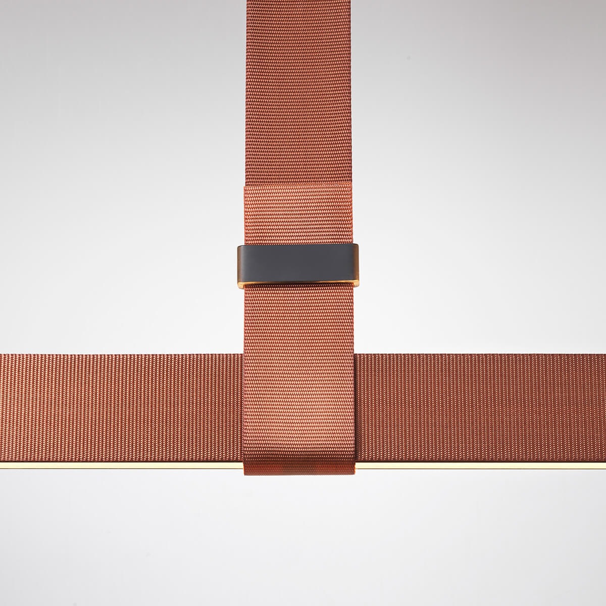 Indem die Gewebebänder durch die Schnallen hindurchgeschoben werden, gestaltet sich die Montage der Pendellampe besonders einfach. Jedes Band kann angepasst werden, um die Beschaffenheit der Umgebung zu berücksichtigen. Durch einen speziellen Mikroanschluss, der in die Klemme des schlanken Beleuchtungsprofils integriert ist, wird die elektrische Verbindung hergestellt.