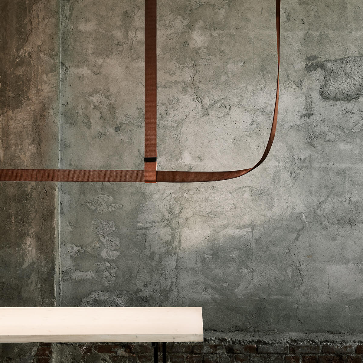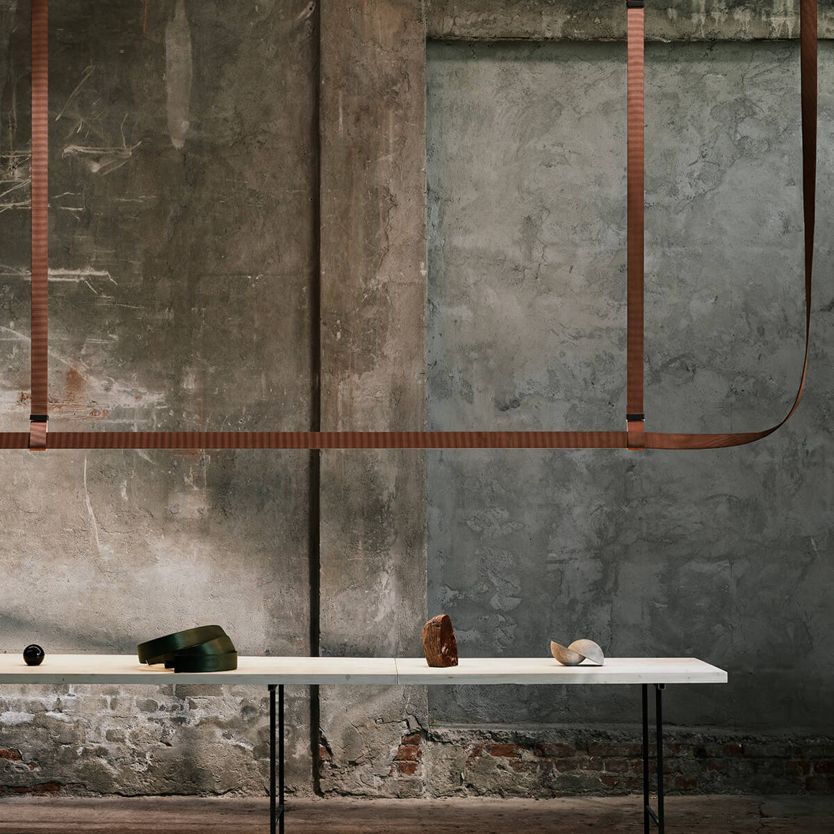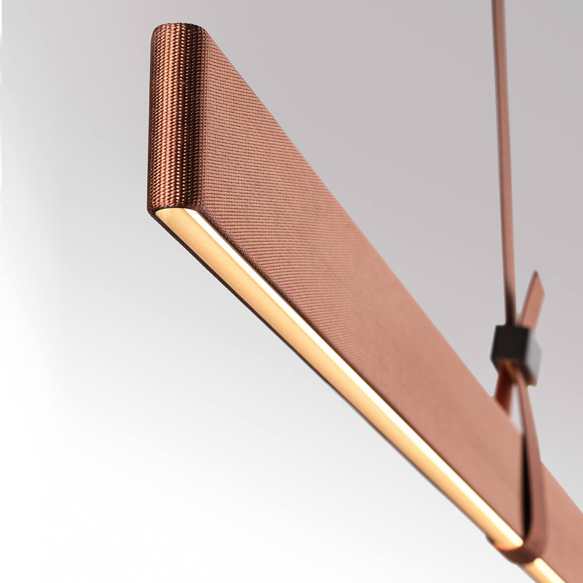 Indem die Gewebebänder durch die Schnallen hindurchgeschoben werden, gestaltet sich die Montage der Pendellampe besonders einfach. Jedes Band kann angepasst werden, um die Beschaffenheit der Umgebung zu berücksichtigen. Durch einen speziellen Mikroanschluss, der in die Klemme des schlanken Beleuchtungsprofils integriert ist, wird die elektrische Verbindung hergestellt.