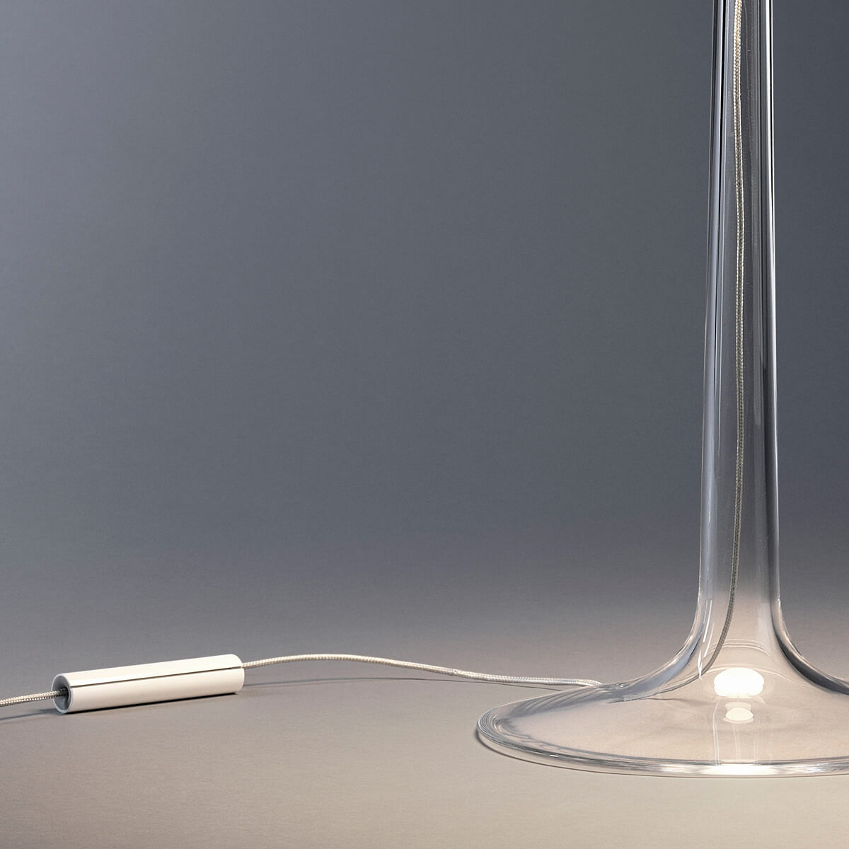Mit ihrer klaren Formensprache und dem transparenten Fuß wirkt die Tischlampe wie eine moderne Skulptur aus Licht. Der Clou: Das Stromkabel schlängelt sich sichtbar durch den Leuchtenkörper und wird damit Teil des Designs. Gekrönt wird die Leuchte von einem glanzvollem Kopf in Chrom, der ihr einen Hauch von diskretem Luxus verleiht. Alles ist durchdacht, jedes Detail elegant und funktional zugleich.