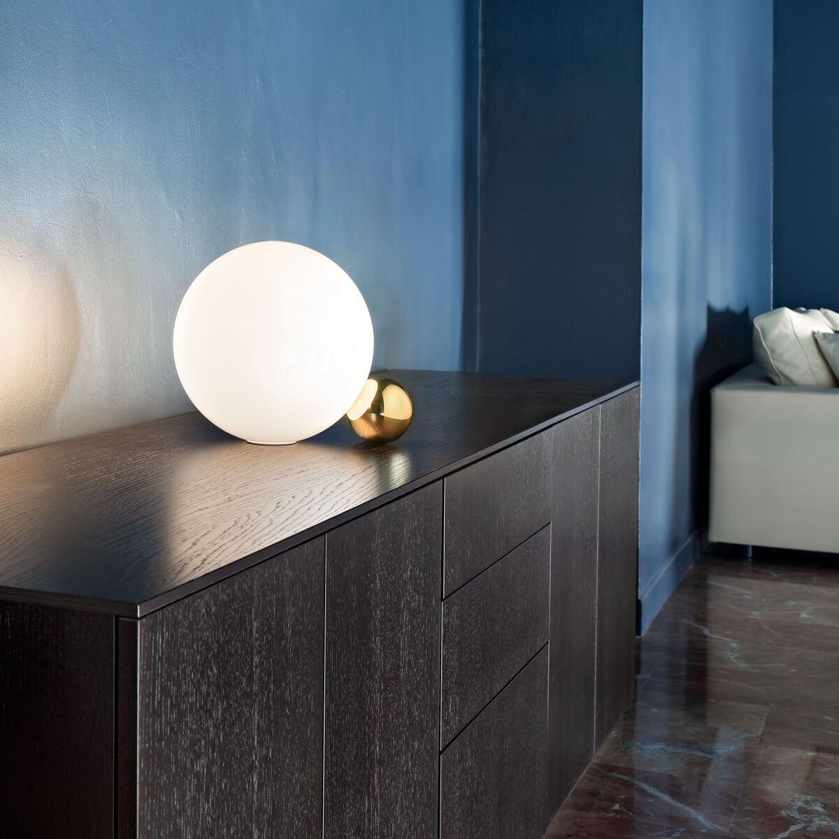 Während der Glasdiffusor die minimalistische Form der Flos Copycat LED Tischleuchte unterstreicht, verleiht die Aluminiumsphäre dem Produkt einen Hauch von Eleganz und Luxuriösität. Auf diese Weise wird die Tischlampe zu einem dekorativen Designobjekt, das seine Umgebung bereichert, jedoch nicht dominiert. Mit ihrer schimmernden Opalglaskugel wirkt sie zudem leicht und entschwert, bleibt dank der abgeflachten Unterseite jedoch sicher in Position.