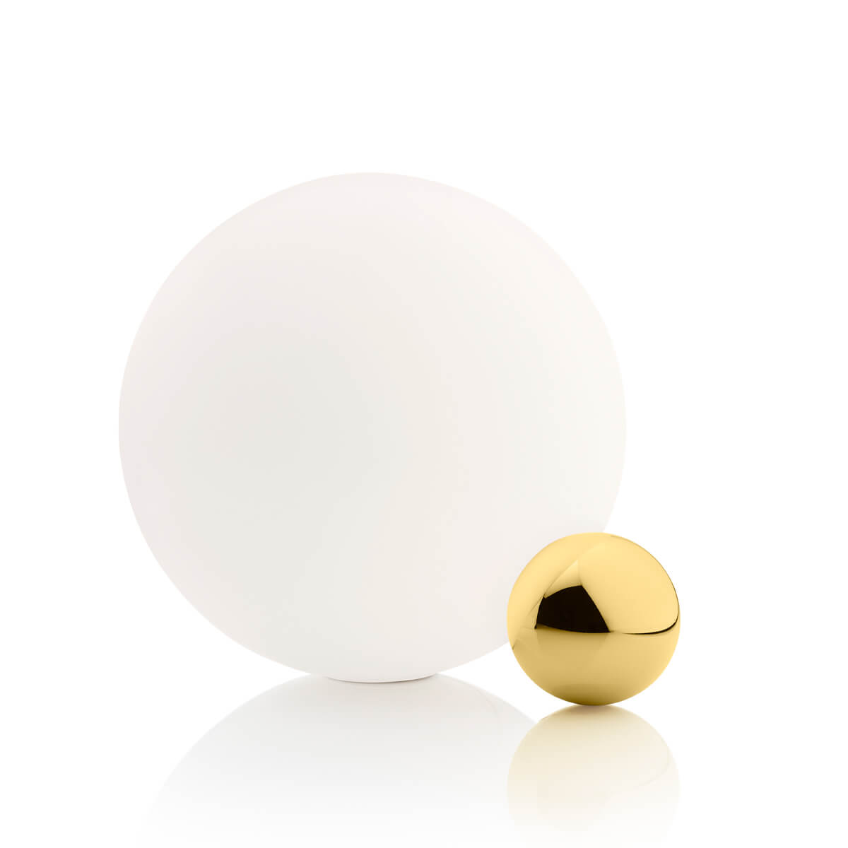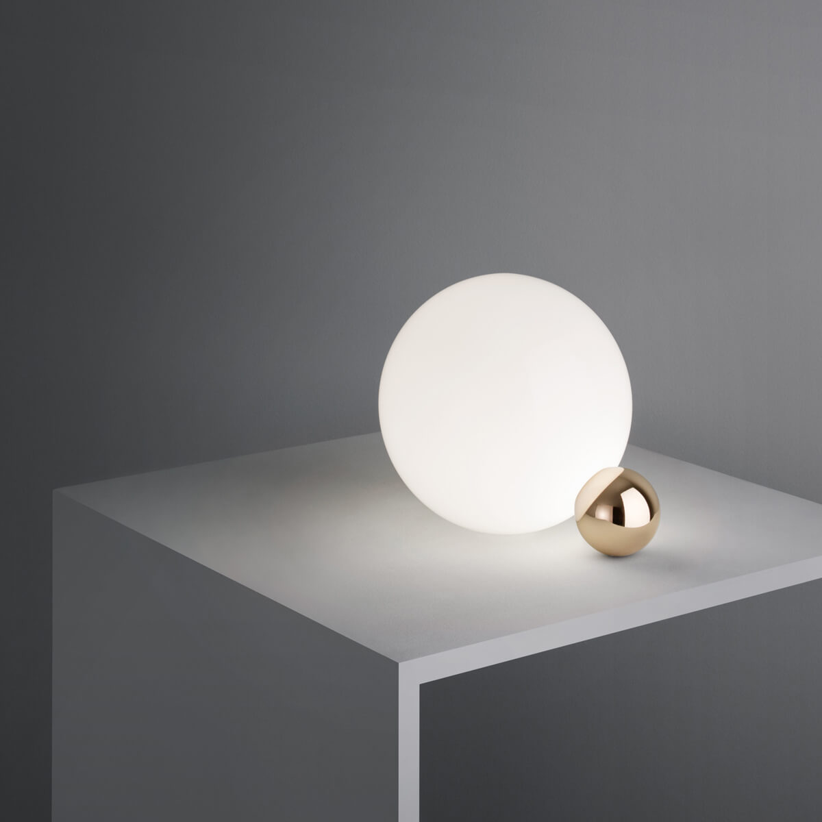 Dekorativ und diskret: Bei der Flos LED Copycat wechselt glanzvolles Gold mit der schimmernden Textur der Opalglaskugel