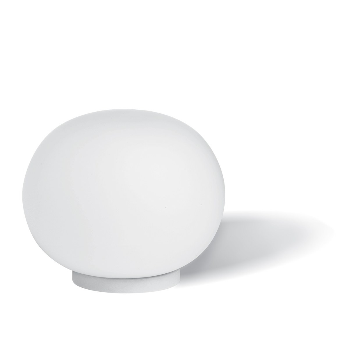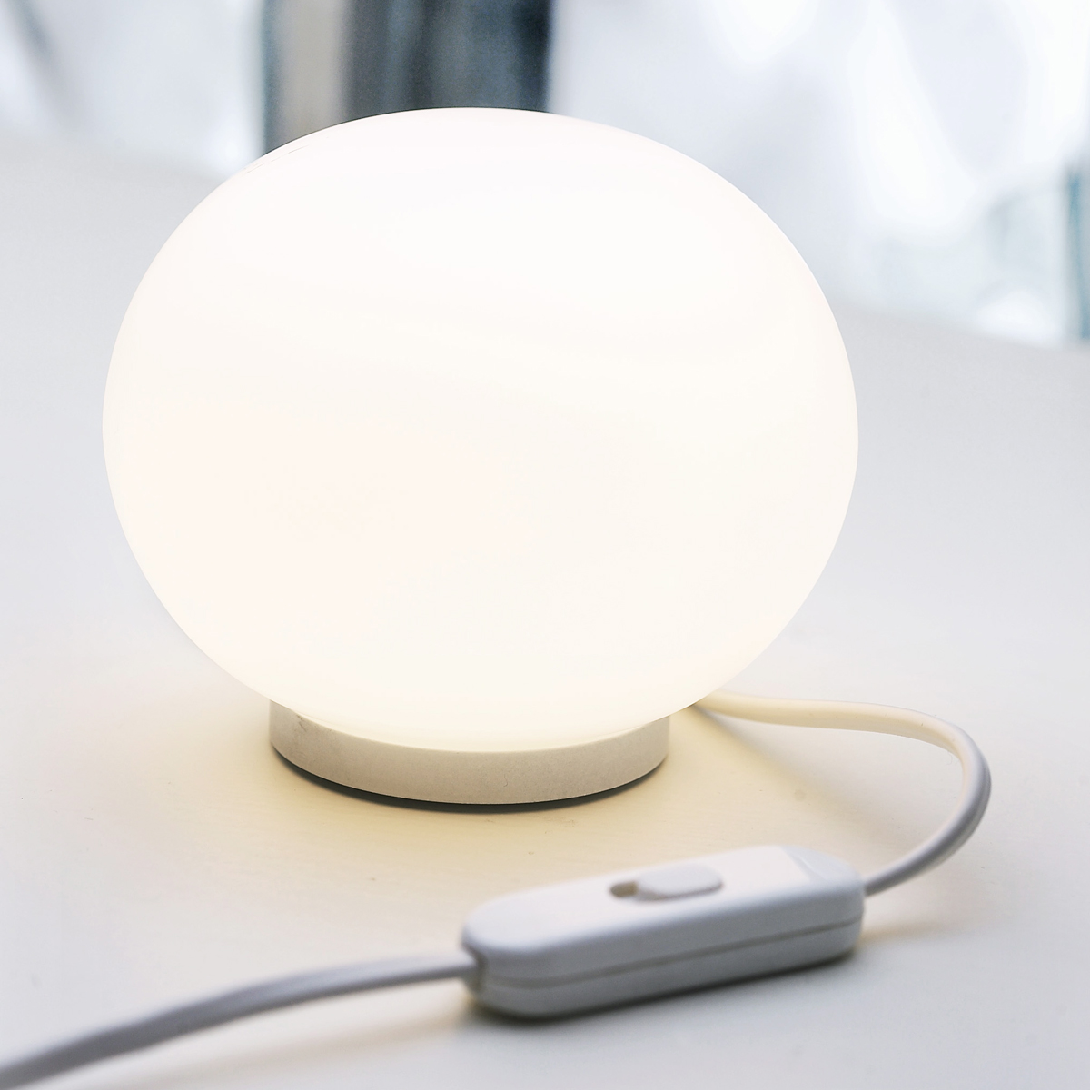 Gefertigt ist der beinahe kugelförmige Leuchtenkörper aus mundgeblasenem, säuregeätztem Glas, dessen opalweiße Oberfläche eine diffus gestreute Lichtverteilung generiert. Als Basis dient ein abgerundeter Sockel aus thermoplastischem Kunststoff in Weiß. Eingeschaltet wird die Flos Mini Glo-Ball T Tischleuchte über einen Schalter auf dem Elektrokabel.
