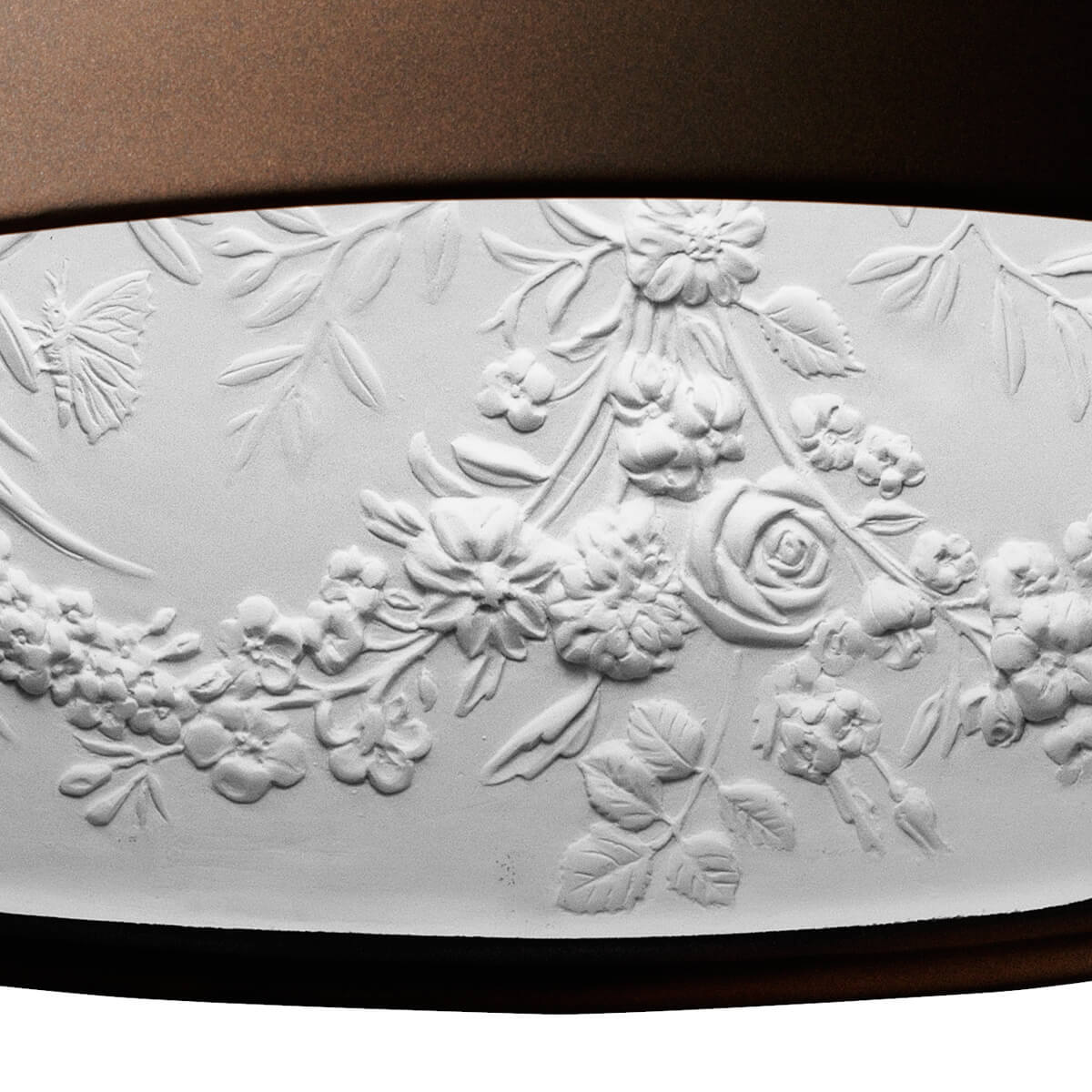 Kernpunkt des Designs ist die Kuppel aus mechanisch bearbeitetem Gipsguss, der an seiner Außenseite von einer farbig lackierten Aluminiumlegierung ummantelt ist. Die Innenseite ist weiß lackiert und von einer Formenwelt geprägt, die an die Ornamentik antiker Reliefs und die florale Lebendigkeit von Stuckrosetten im Jugendstil erinnert. Blumengirlanden, Schmetterlinge, Beeren und wehende Bänder verwandeln das Innere der Leuchte in einen "himmlischen Garten", der in einem hellen Licht erstrahlt.