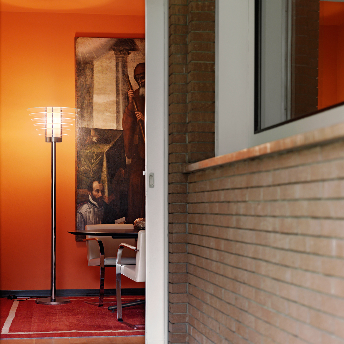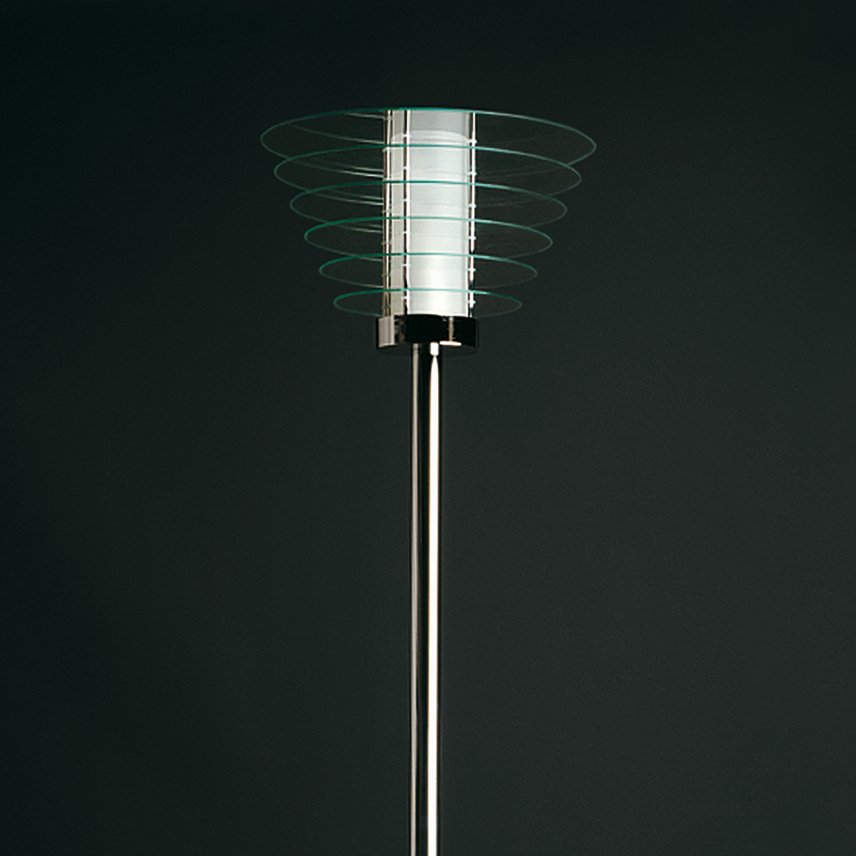 Mit der 0024 Stehleuchte lassen sich Innenräume stilvoll beleuchten. Die innovative Form entstammt dem Ideengut des italienischen Designers und Architekten Gio Ponti und wurde von diesem bereits 1933 erdacht. Blickpunkt des Designs ist der Leuchtenkopf, der wie eine moderne Laterne gestaltet ist: Mehrere Scheiben aus transparentem, getempertem Glas umfangen den zentralen Diffusor der 0024 Stehleuchte, der aus hitzebeständigem, sandgestrahltem Glas besteht. Da die Scheiben in ihrem Durchmesser variieren, ergibt sich eine attraktive kegelförmige Silhouette, die perfekt harmoniert mit dem zylinderförmigen Diffusor.
