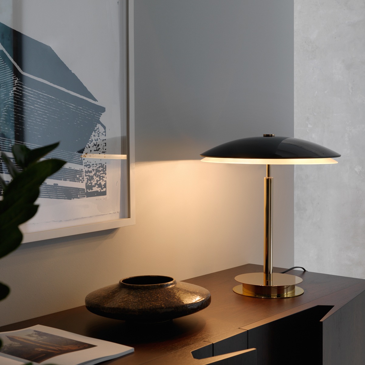 Leuchtenfuß und Sockel sind aus poliertem Messing gefertigt und damit besonders geschmackvoll im Design. In Form und Farbe harmonieren sie perfekt mit dem doppelschaligen Leuchtenschirm, der sich aus zwei dünnwandigen, übereinandergeschichteten Schalen zusammensetzt. Während die untere Scheibe aus sandgestrahltem, weißem Glas besteht, ist die obere aus schwarz lackiertem Opalglas geschaffen.