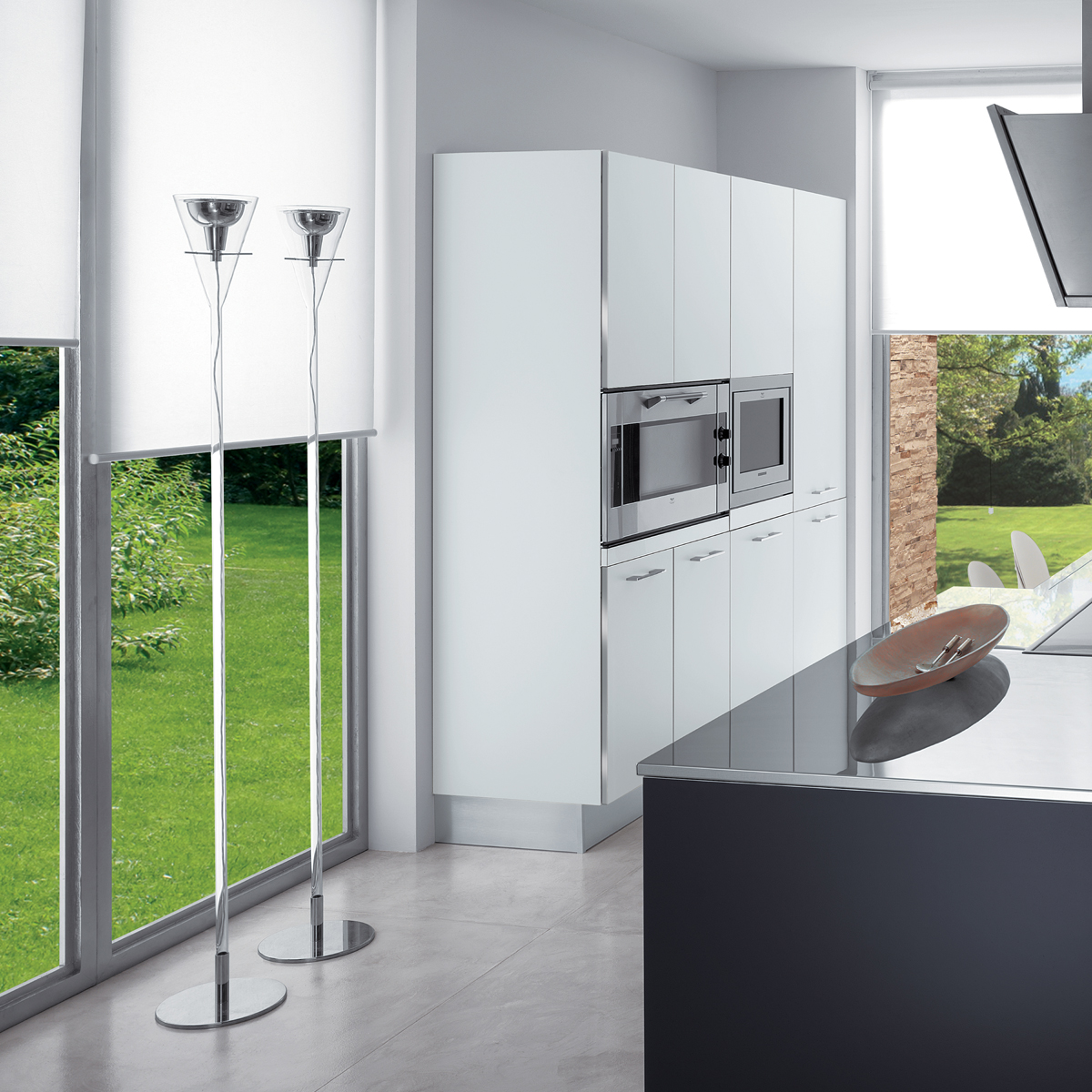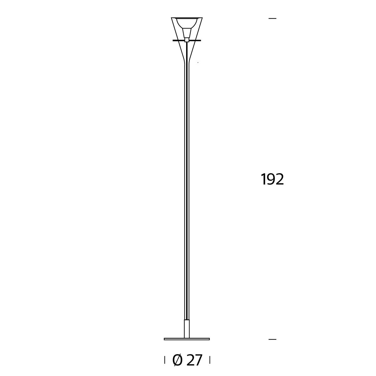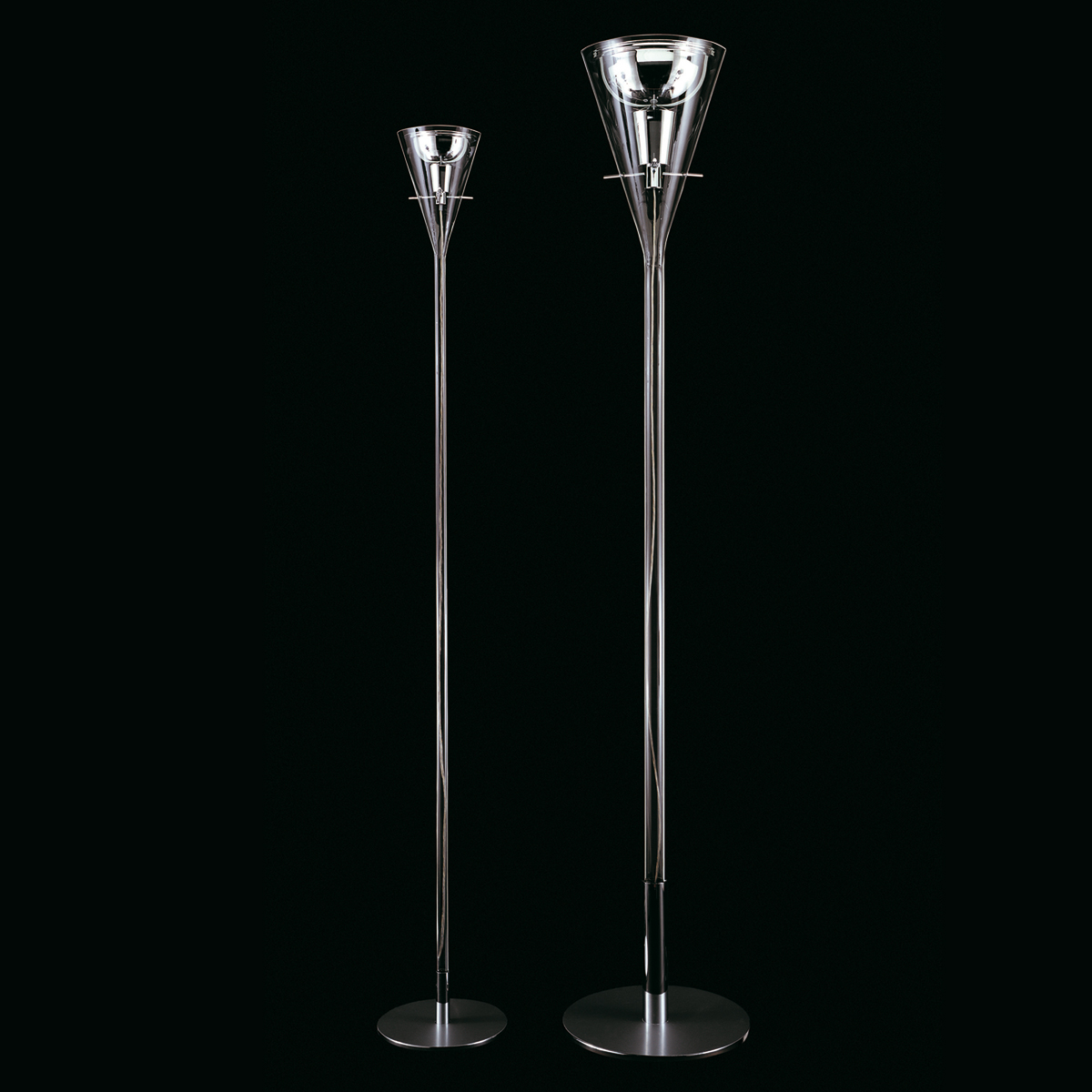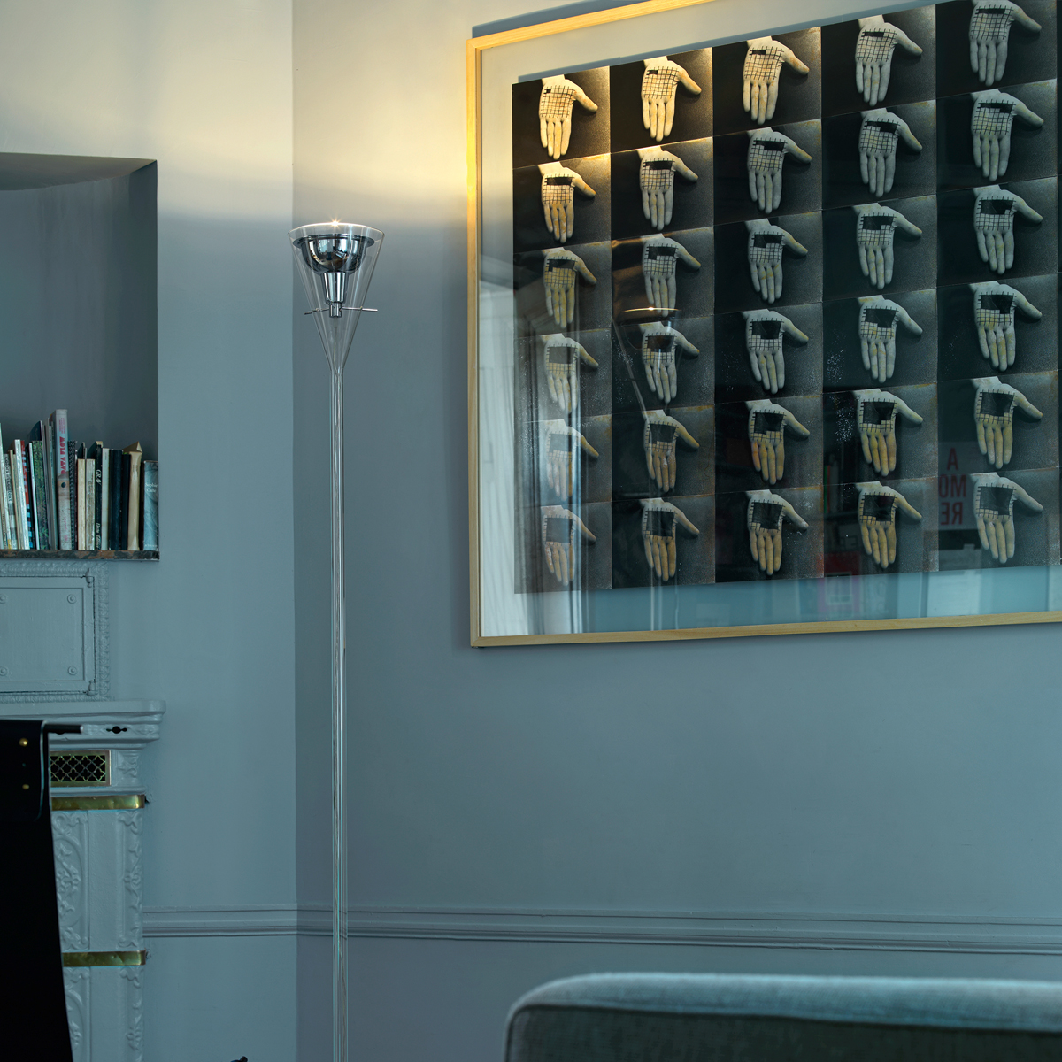 Blickpunkt des Designs ist der kegelförmige, an eine moderne Fackel erinnernde Leuchtenschirm. Er besteht aus hitzebeständigem Borosilikatglas und erwächst dem gläsernen Stiel der Flûte Stehleuchte in einer einzigen fließenden Form. Das transparente Glas gibt den Blick frei auf das transparente Netzkabel und den Reflektor aus verchromtem Aluminium.