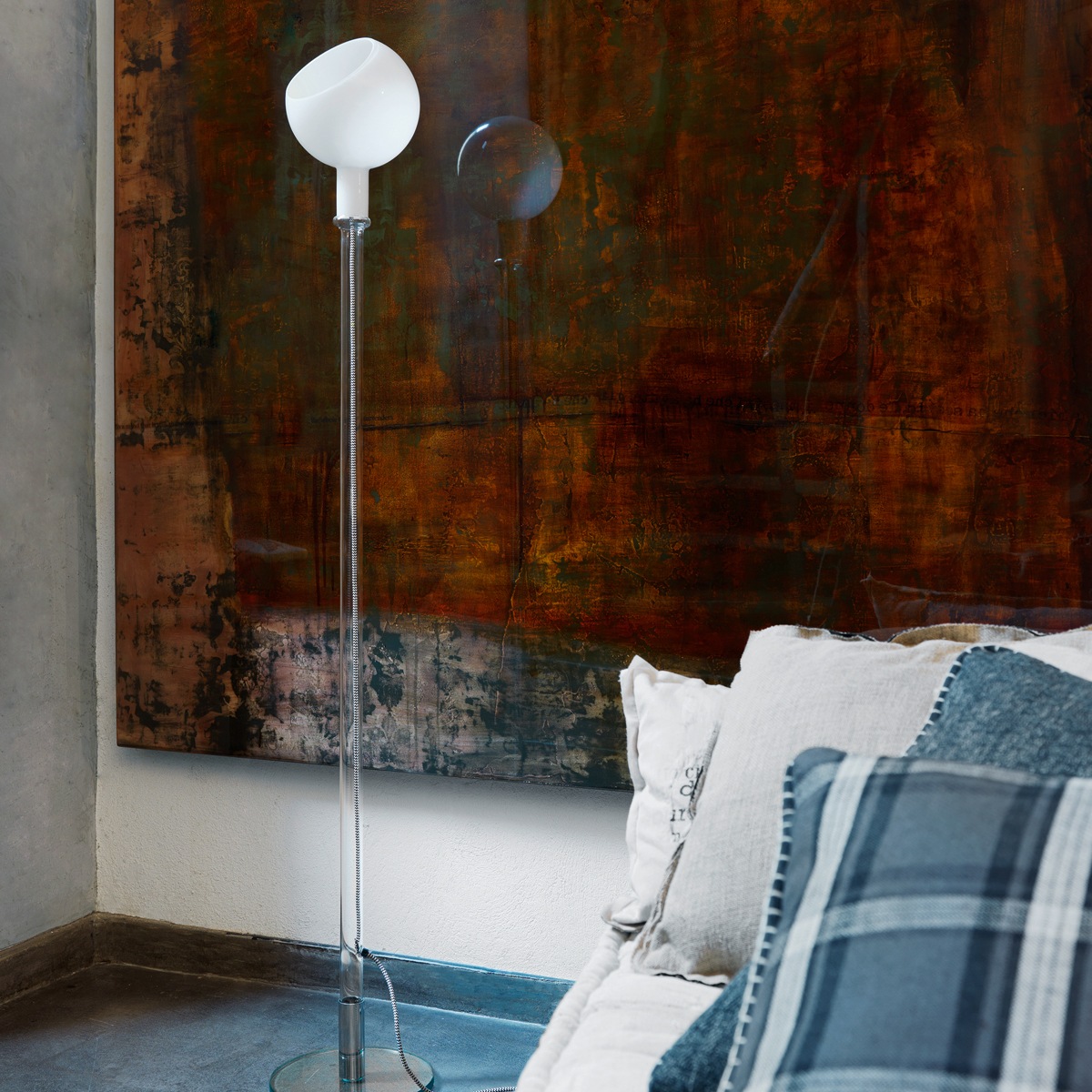 Als Diffusor fungiert ein kugelartiger Schirm aus weißem oder bernsteinfarbenem Opalglas, der das Licht auf indirekte und diffus gestreute Weise erstrahlen lässt. Über einen Dimmer, der ebenso wie der Netzstecker schwarz gehalten ist, lässt sich die Lichtintensität der Fontana Arte Parola Stehleuchte nach Belieben verändern.